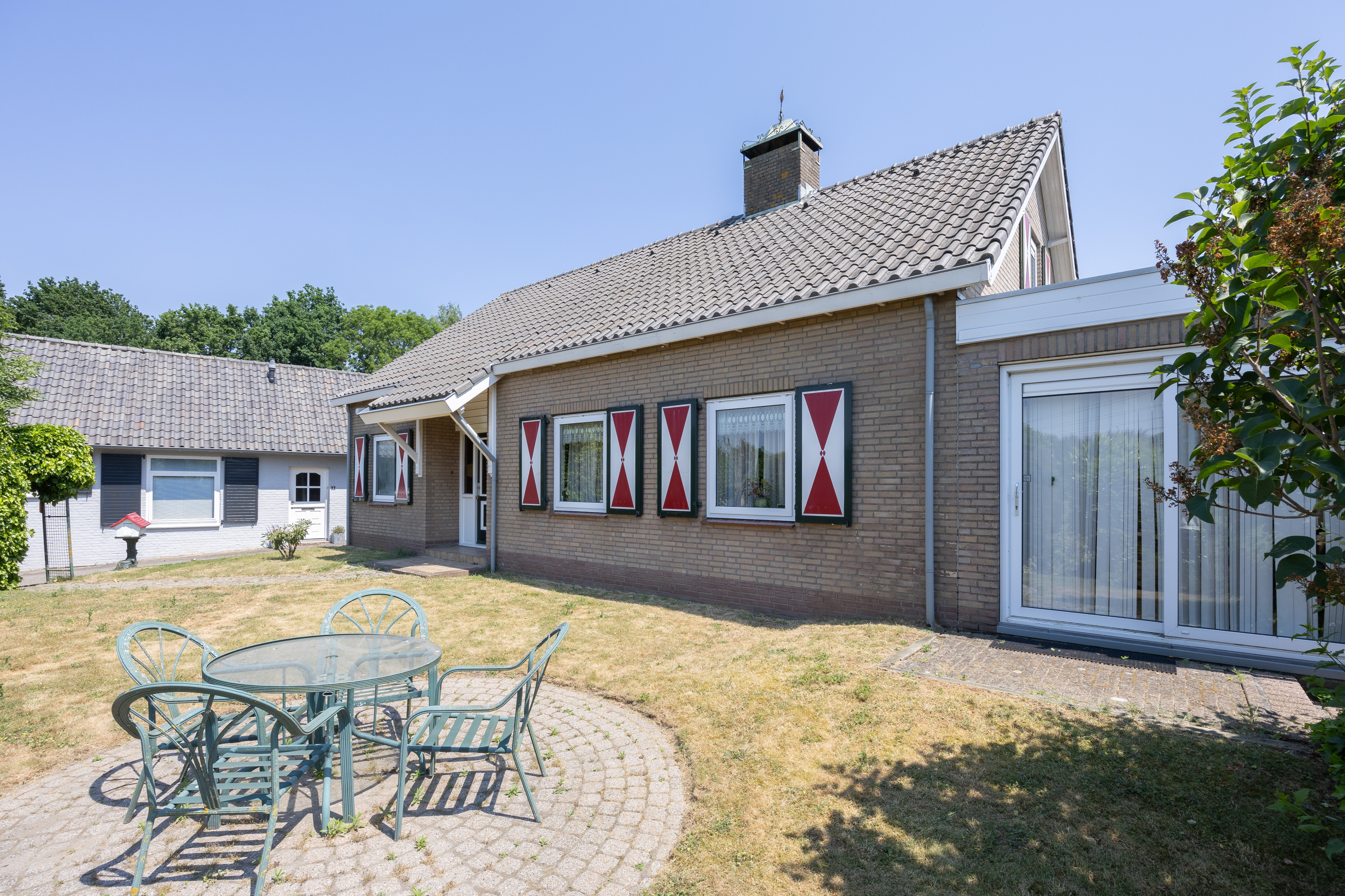Direct achter de woning bevindt zich een ruim overdekt terras, perfect gepositioneerd op de zon. Vanuit de keuken stap je via de openslaande deuren zo dit uitnodigende terras op, met een prachtig vrij uitzicht over de tuin. Een heerlijke plek om te ontspannen, te dineren of lang na te praten op zomeravonden.