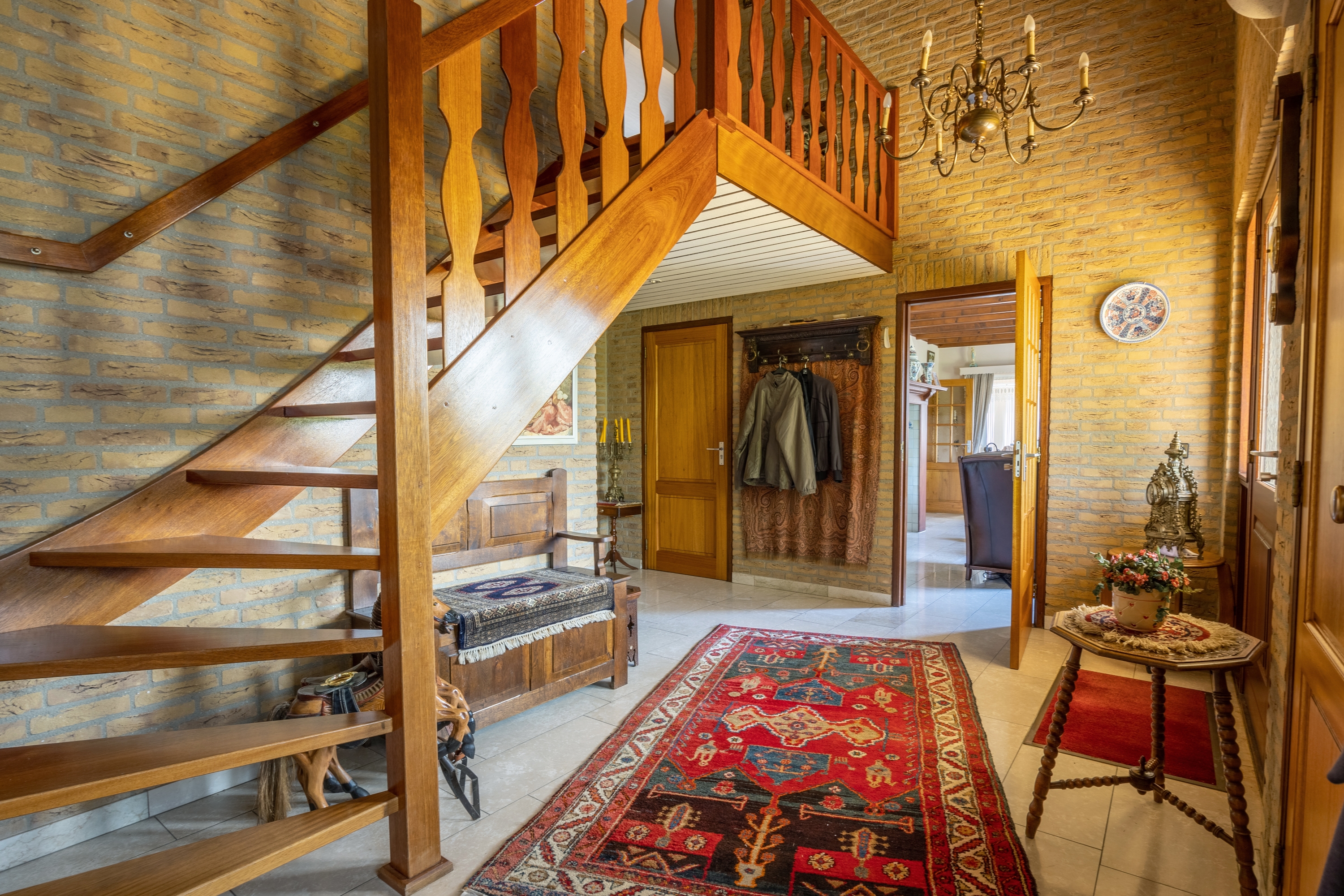 De ruime hal met vide vormt een indrukwekkende binnenkomst. De fraaie houten trappartij loopt elegant over in een open balustrade en geeft de woning direct een gevoel van grandeur. In de hal bevinden zich tevens de meterkast, een praktische garderobe en een modern toilet.
