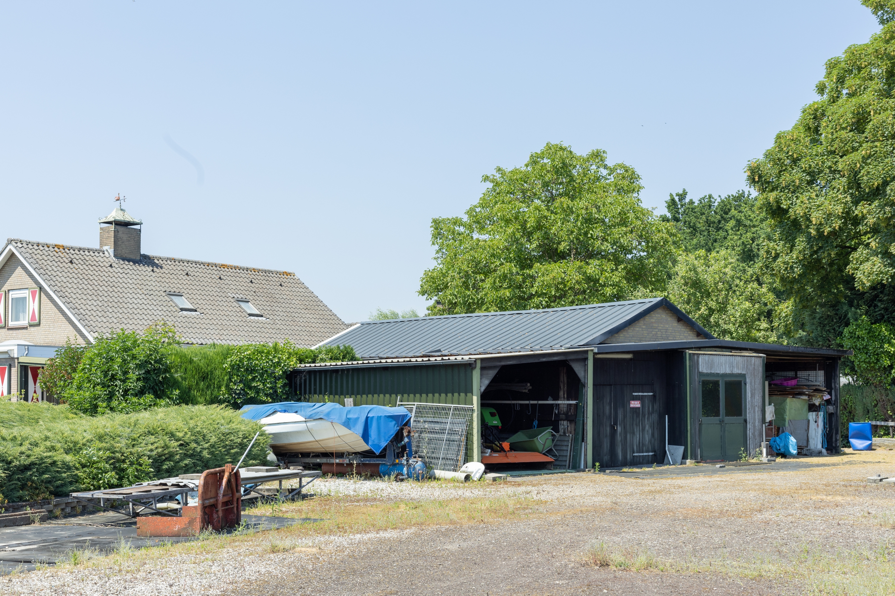 Op het terrein staan meerdere bijgebouwen die de leefkwaliteit verder vergroten. De vrijstaande stenen garage van ca. 95 m² biedt ruimte aan twee auto’s en is perfect voor de autoliefhebber, terwijl de tweede garage plaats biedt aan nog een derde auto. Daarnaast is er een open houten schuur van circa 30 m² voor extra opslag of tuinmateriaal. Achter de woning bevindt zich een aangebouwde stenen berging met garagedeur, praktisch voor het stallen van fietsen of gereedschap.