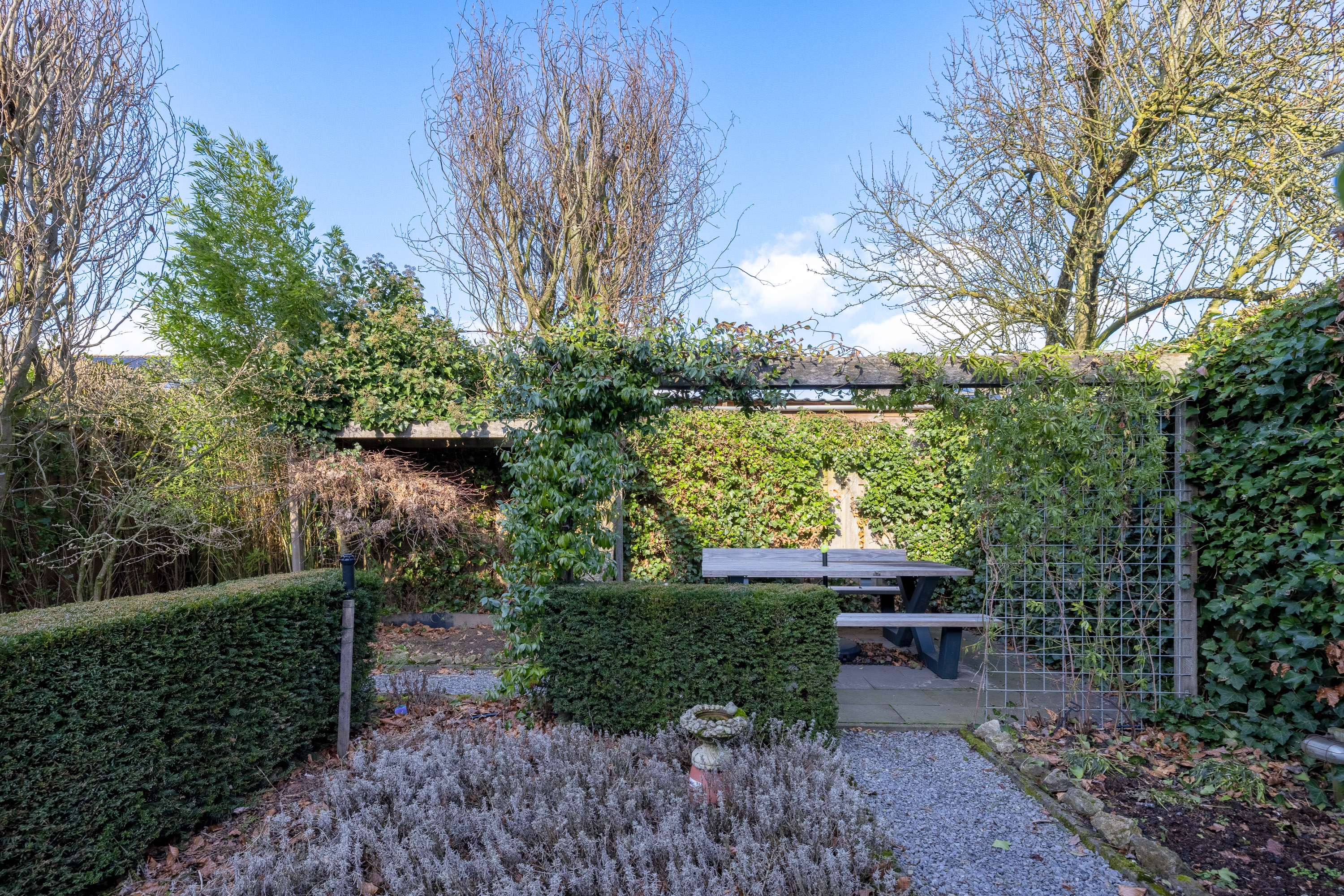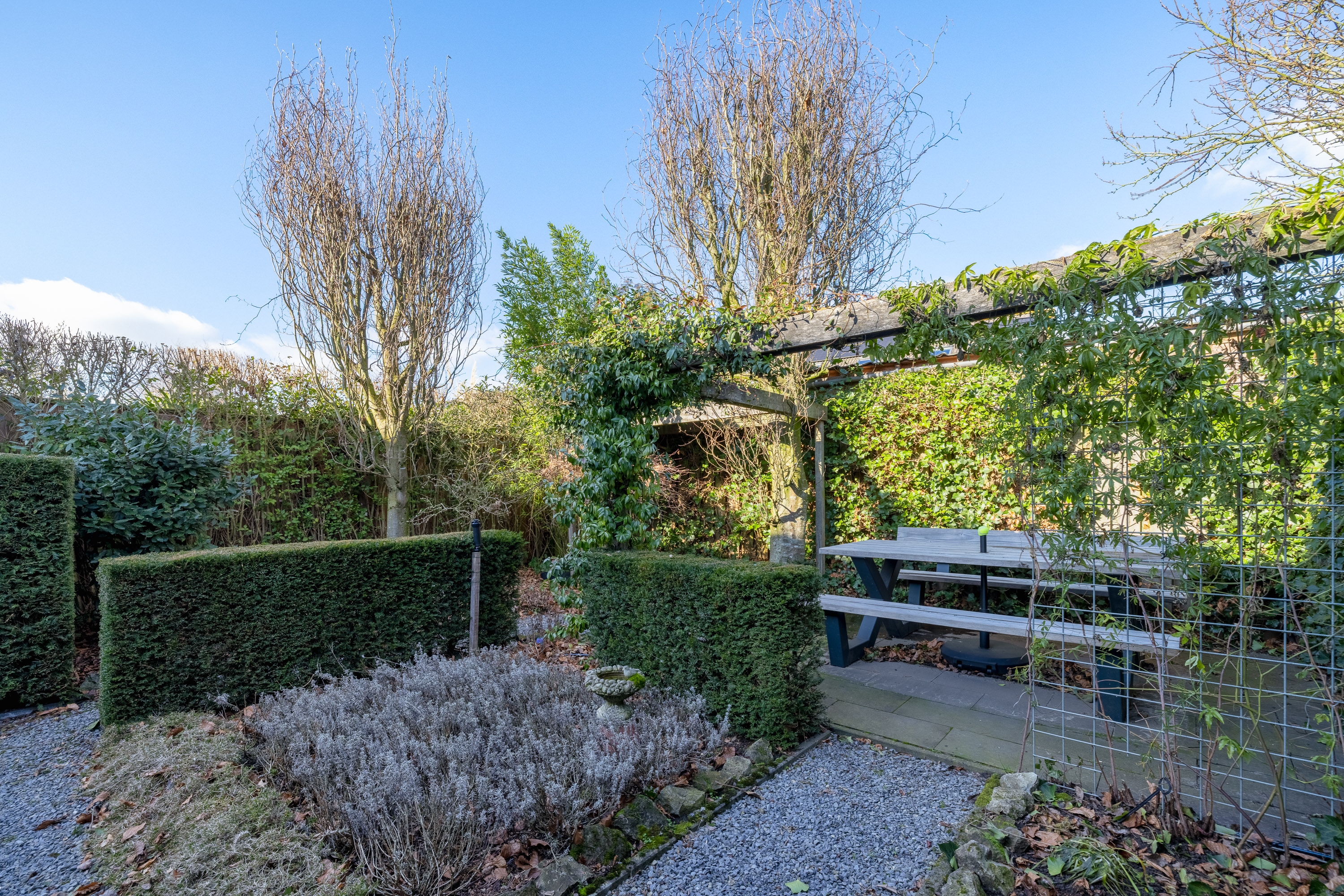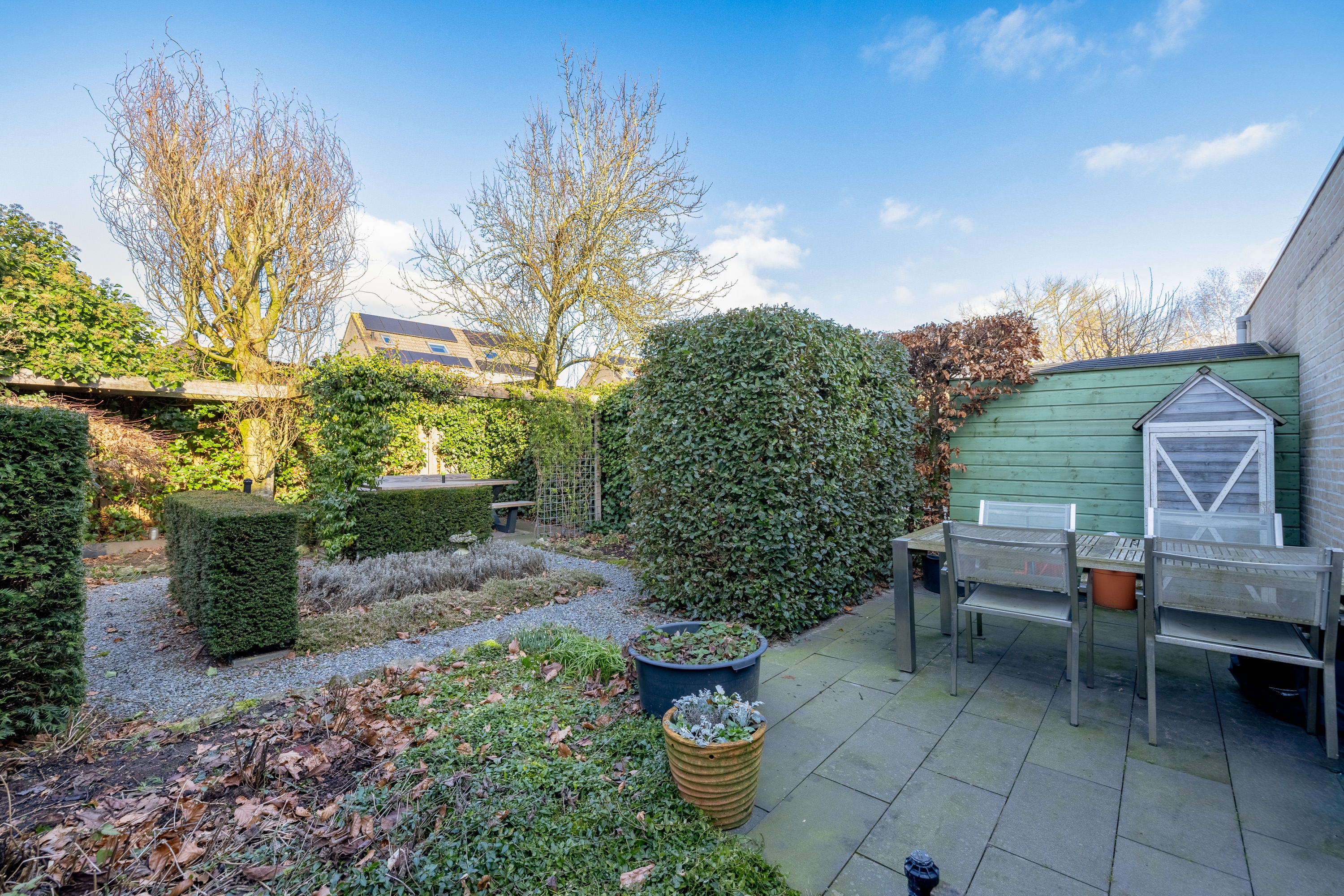 De tuin is fraai ingericht met meerdere terrassen, waardoor er altijd een plek is in zon of schaduw. De combinatie van groen en hoogwaardige betegeling zorgt voor een stijlvolle en evenwichtige uitstraling. Dankzij de slimme indeling en groene erfafscheidingen geniet u hier van volop privacy.