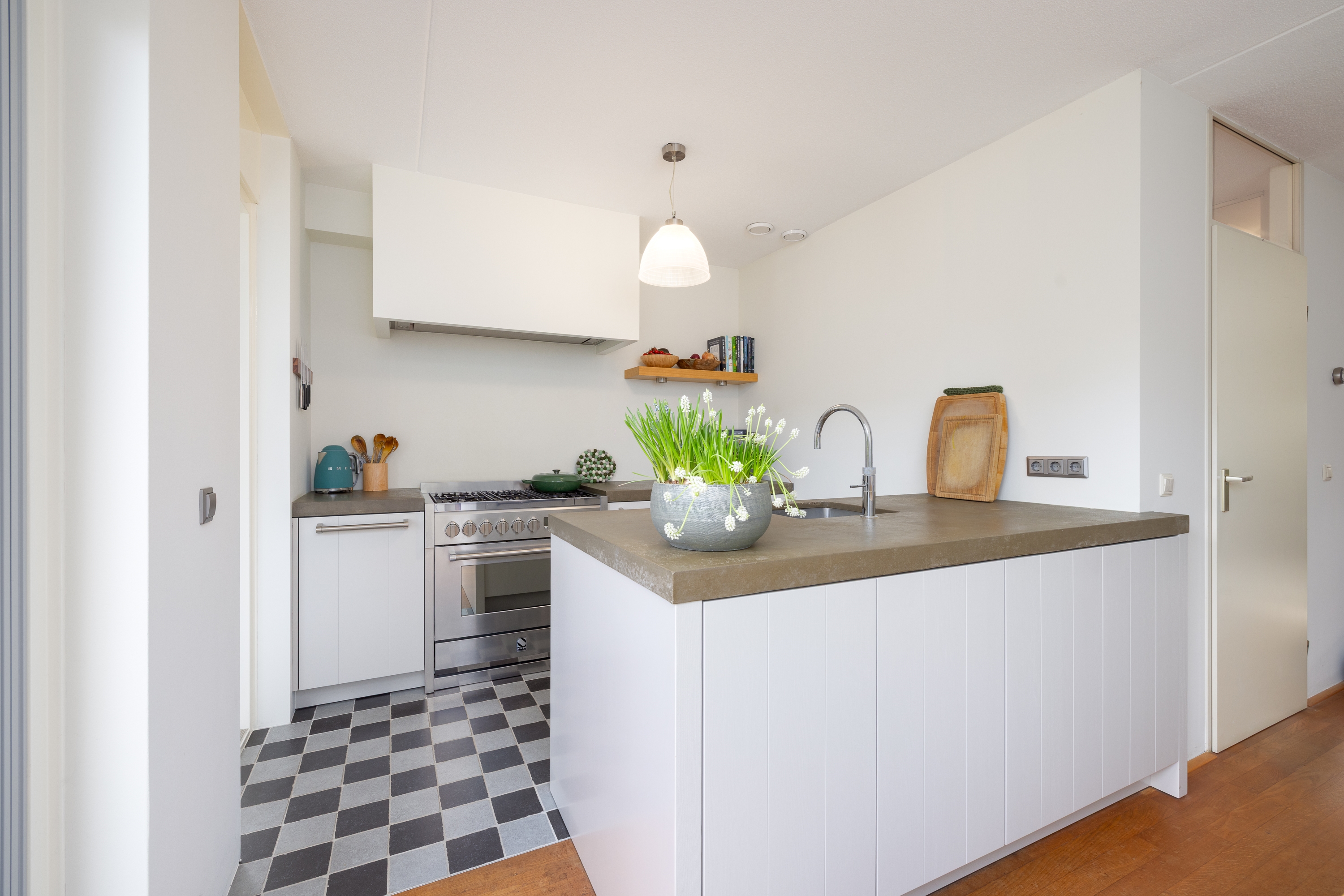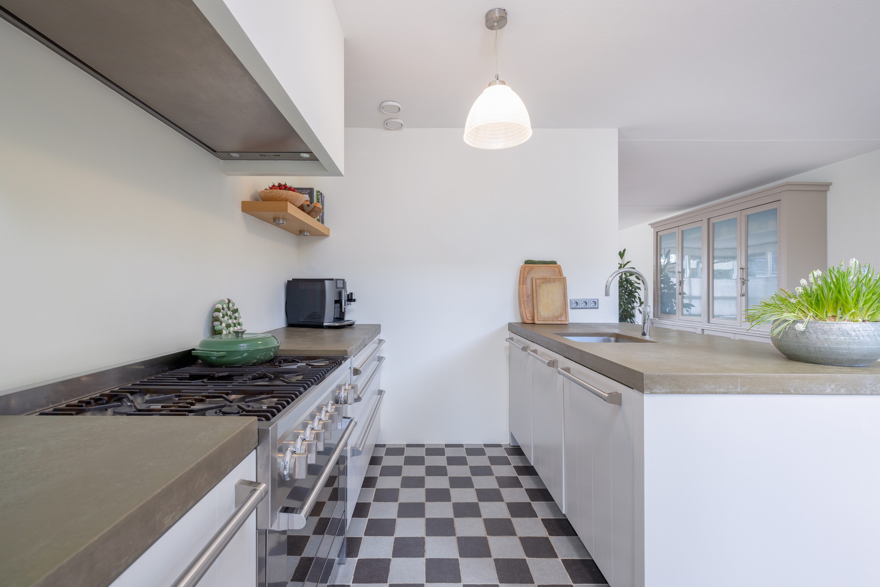 Het grote fornuis maakt deze keuken bij uitstek geschikt voor liefhebbers van uitgebreid koken. De geïntegreerde afzuigkap voert direct naar buiten af een belangrijk kwaliteitsdetail. Daarnaast is de keuken voorzien van een Quooker, vaatwasser, koelkast en een RVS spoelbak. Alles is aanwezig om moeiteloos te koken, te leven en te ontvangen.