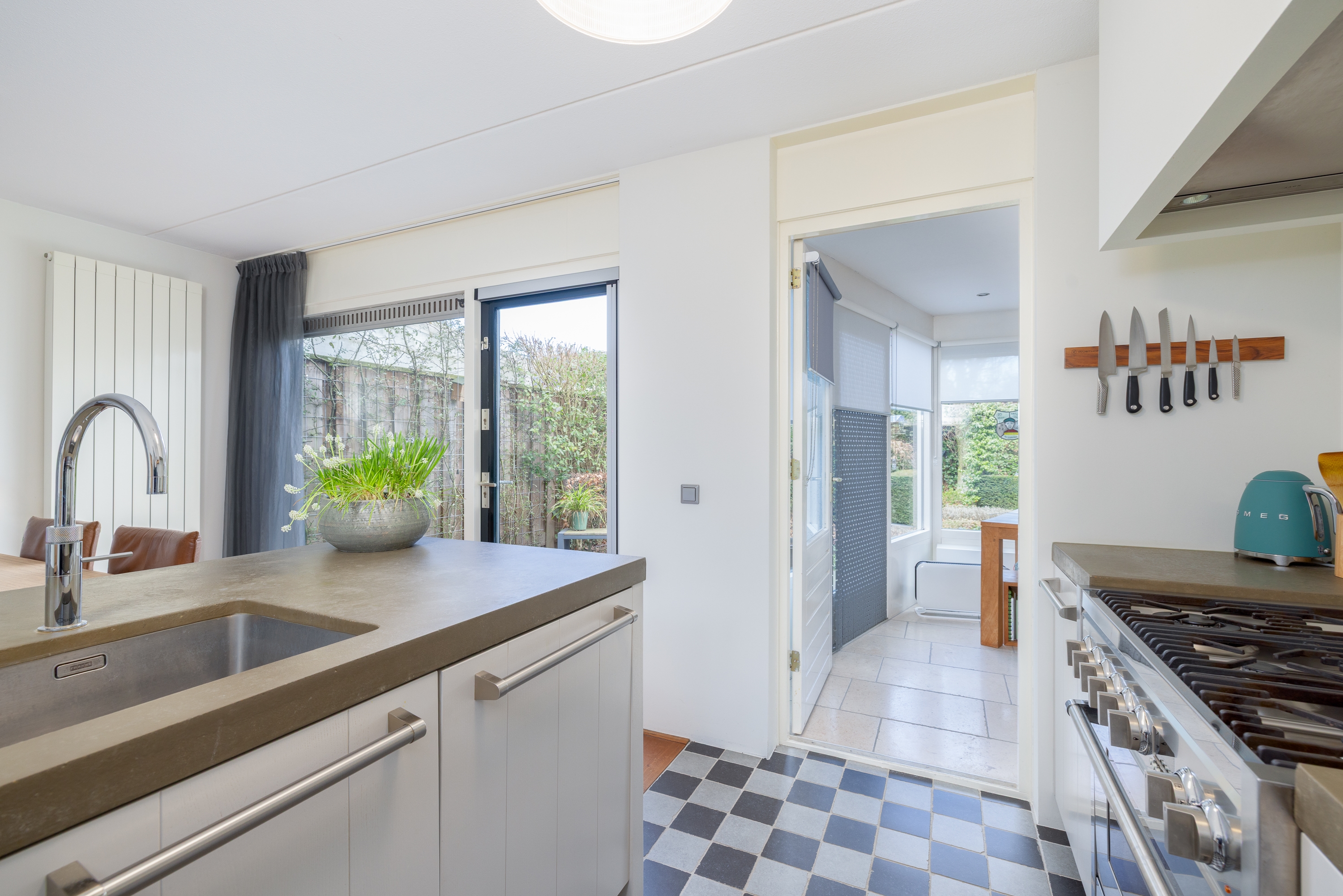 Vanuit de keuken is er directe toegang tot de achtertuin met meerdere terrassen een natuurlijke verlenging van de leefruimte.