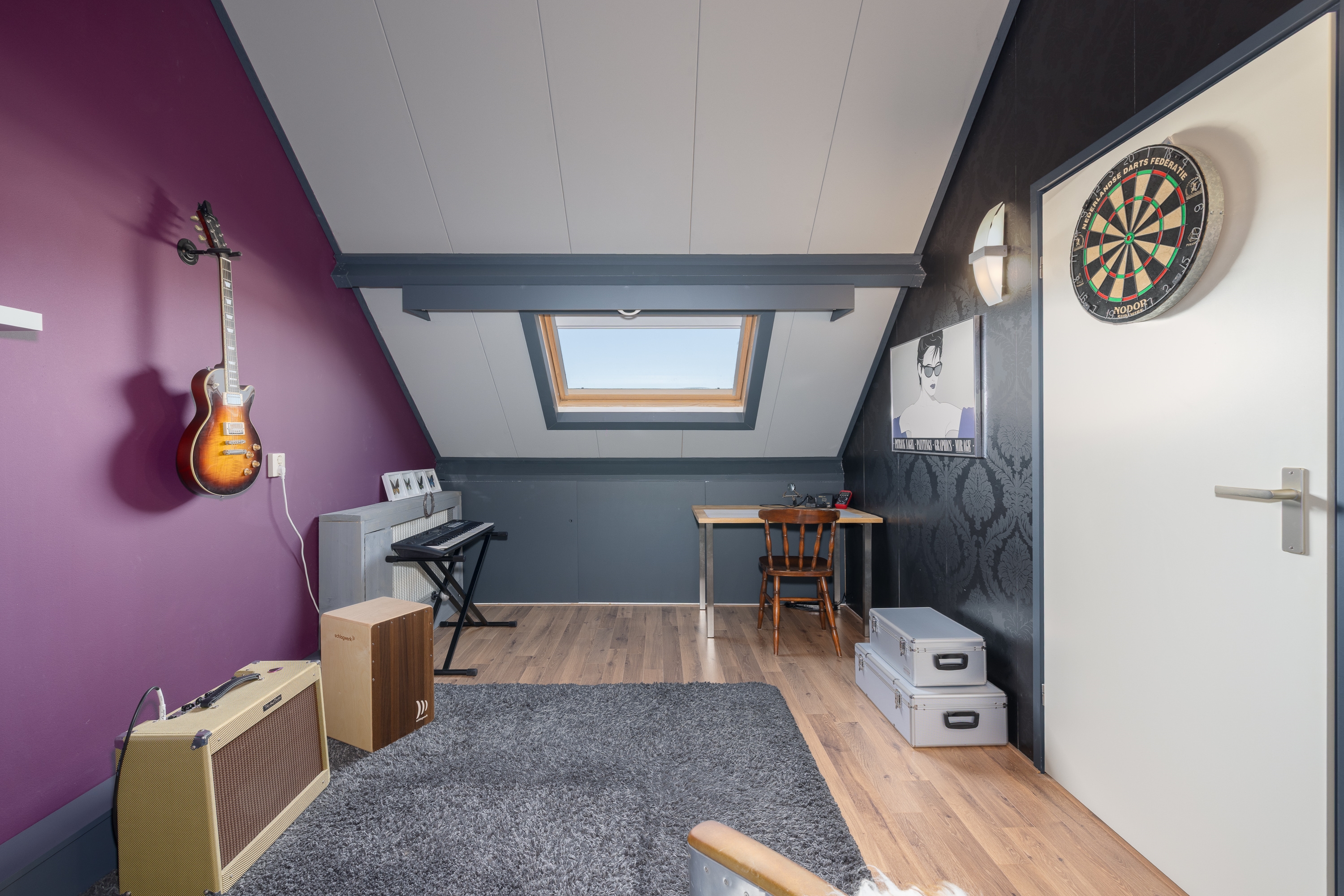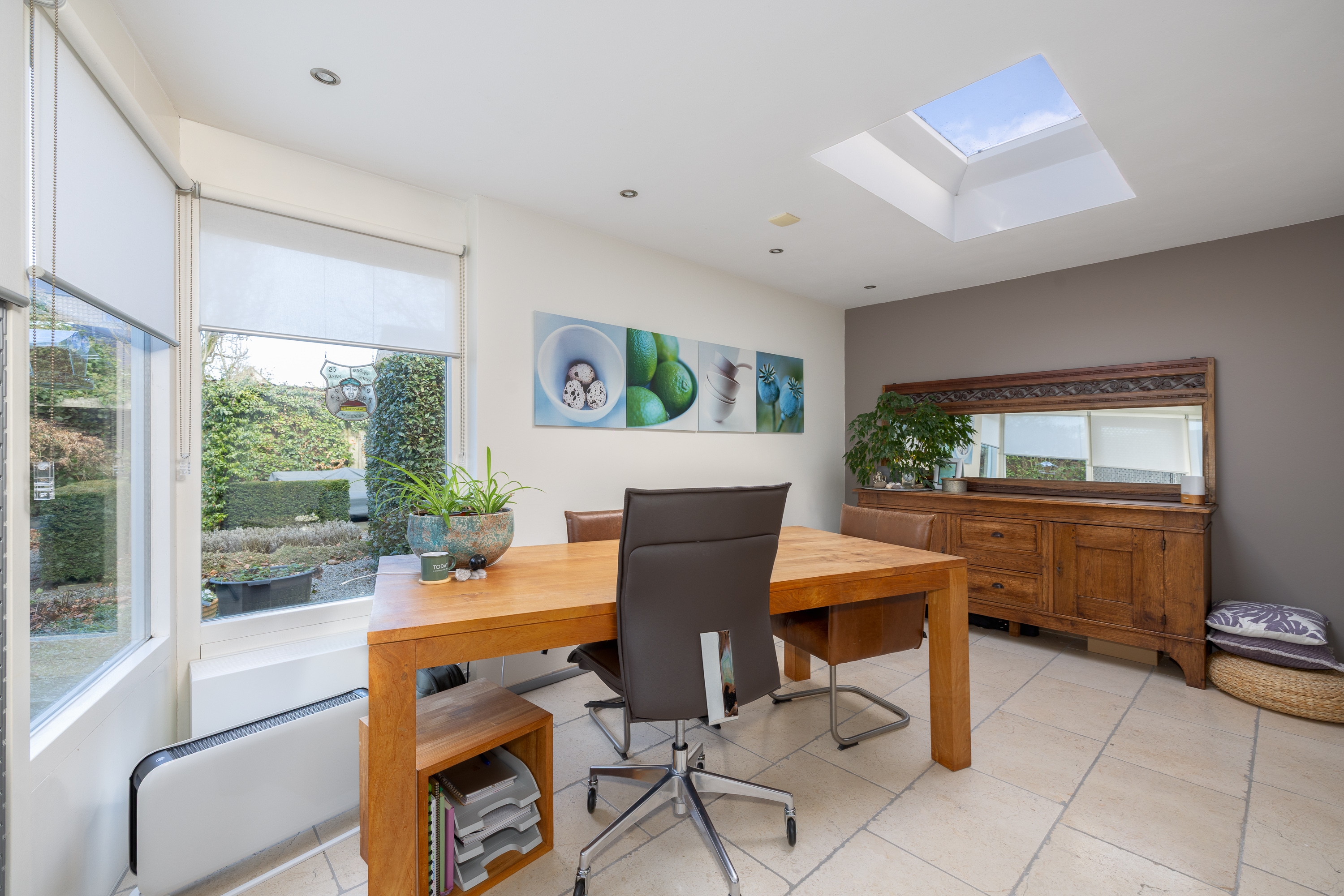 Voorbij de keuken opent de woning zich richting de royale werkkamer van circa 14 m². Dankzij de lichtstraat valt hier aangenaam veel daglicht binnen, wat zorgt voor een prettige en professionele sfeer. Momenteel ingericht als stijlvolle praktijkruimte, maar moeiteloos aan te passen naar thuiswerkplek, hobbyruimte of speelkamer.