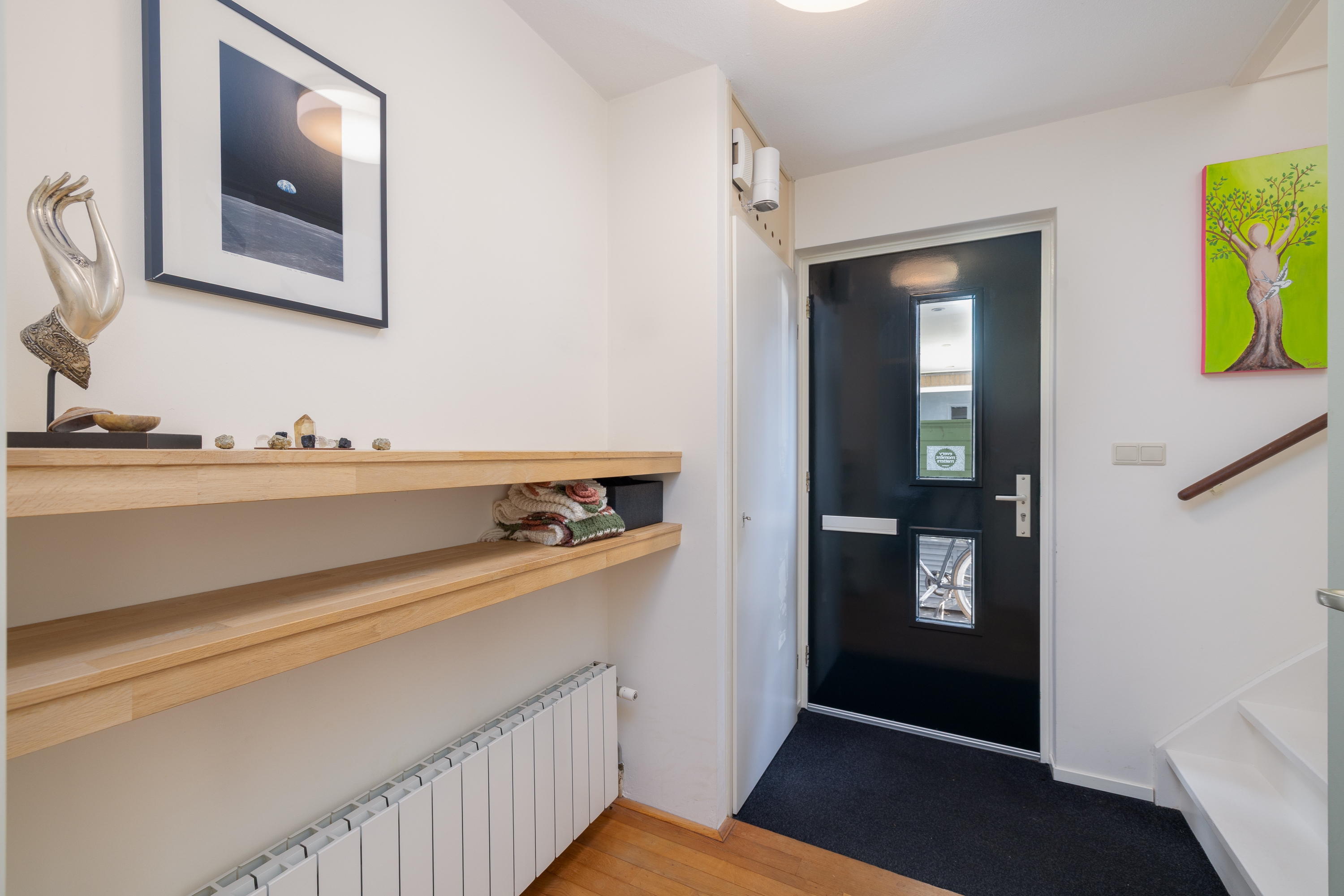 Binnenkomst in de ruime hal met meterkast, modern toilet en trapopgang. Vanuit hier ontvouwt de begane grond zich logisch en ruimtelijk.