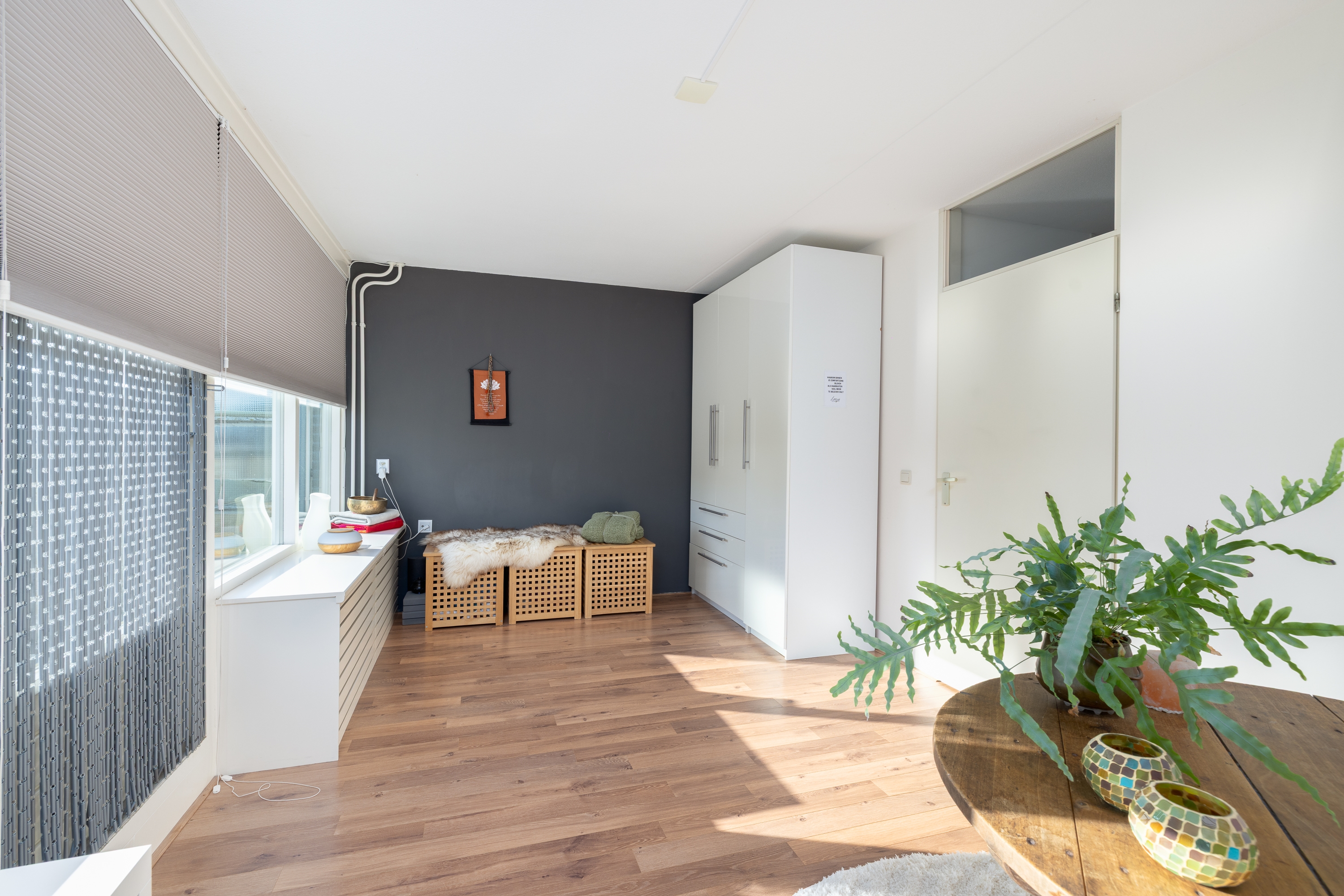 Achter deze ruimte bevindt zich de ruime berging met praktische inbouwkasten. Extra comfortabel is de eigen ingang naar de praktijkruimte, waardoor wonen en werken hier volledig van elkaar gescheiden kunnen worden. Een zeldzame combinatie die flexibiliteit en privacy perfect samenbrengt..