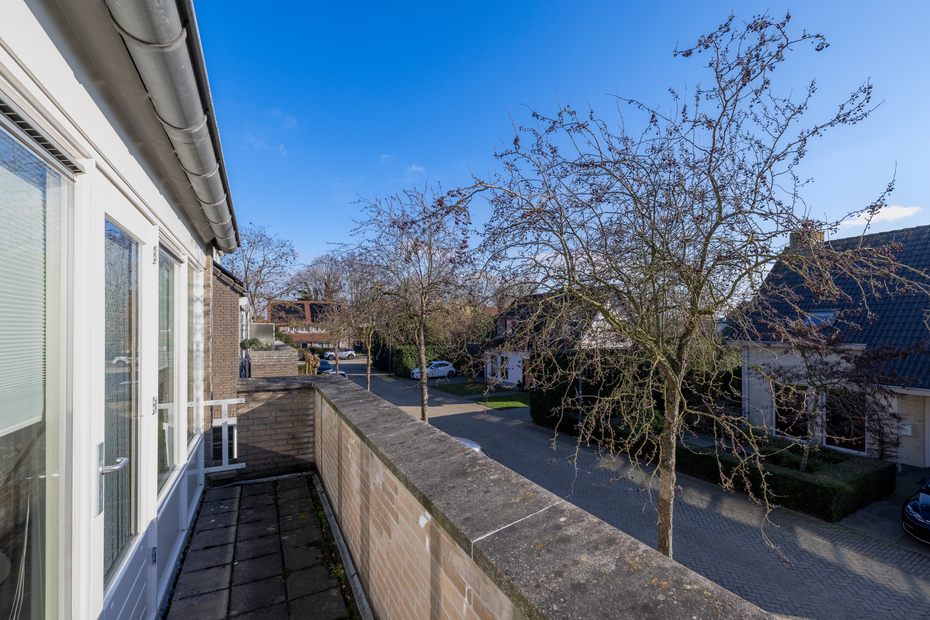Het balkon strekt zich uit over de volledige breedte van de ouderslaapkamer en vormt een waardevolle verlenging van de ruimte. Dankzij de stenen borstwering is optimale privacy gewaarborgd zelfs wanneer de balkondeuren openstaan.