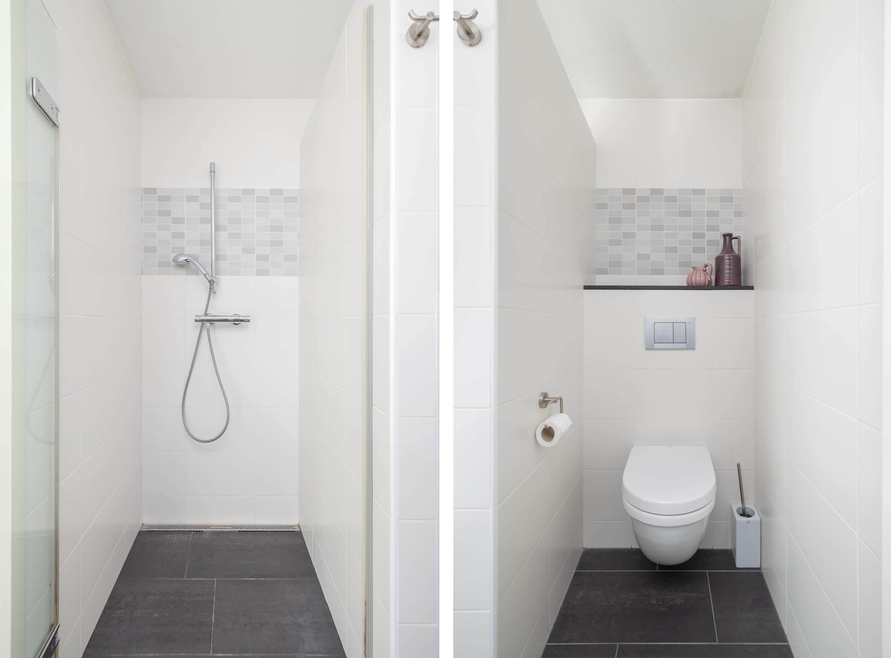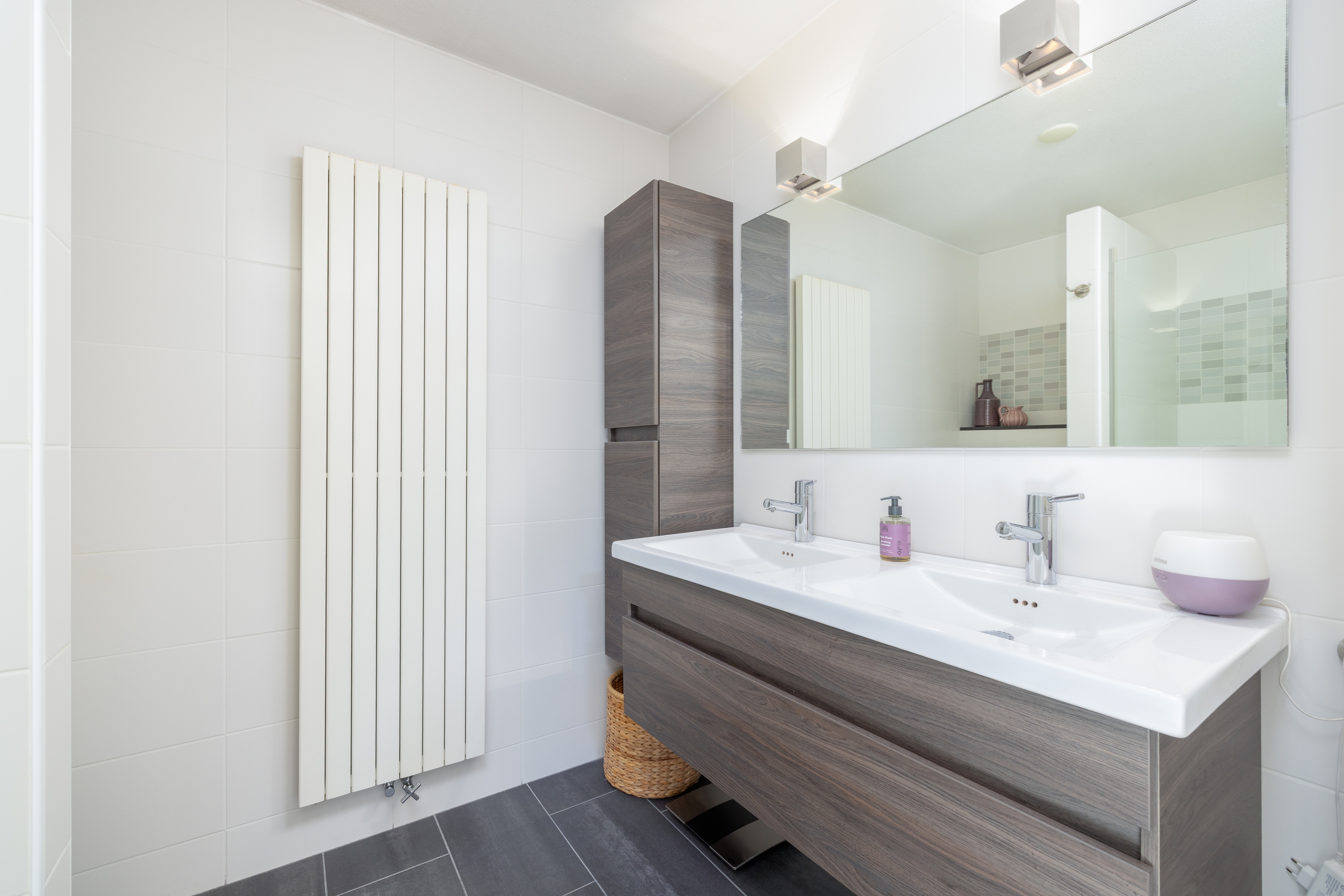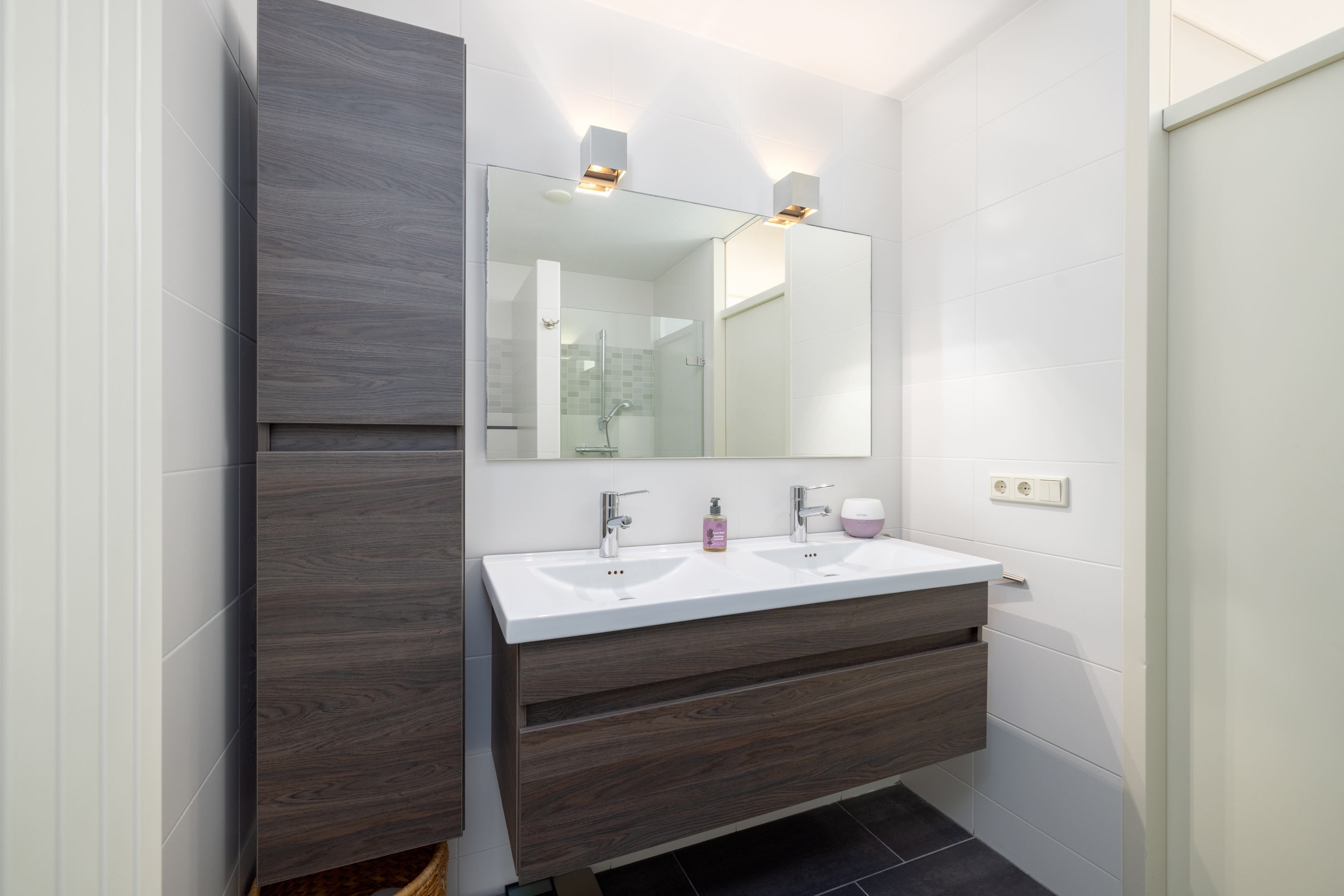 De badkamer is modern en compleet uitgevoerd met een ruime inloopdouche, tweede toilet en een dubbele wastafel met meubel. Praktisch ingericht en comfortabel in dagelijks gebruik.