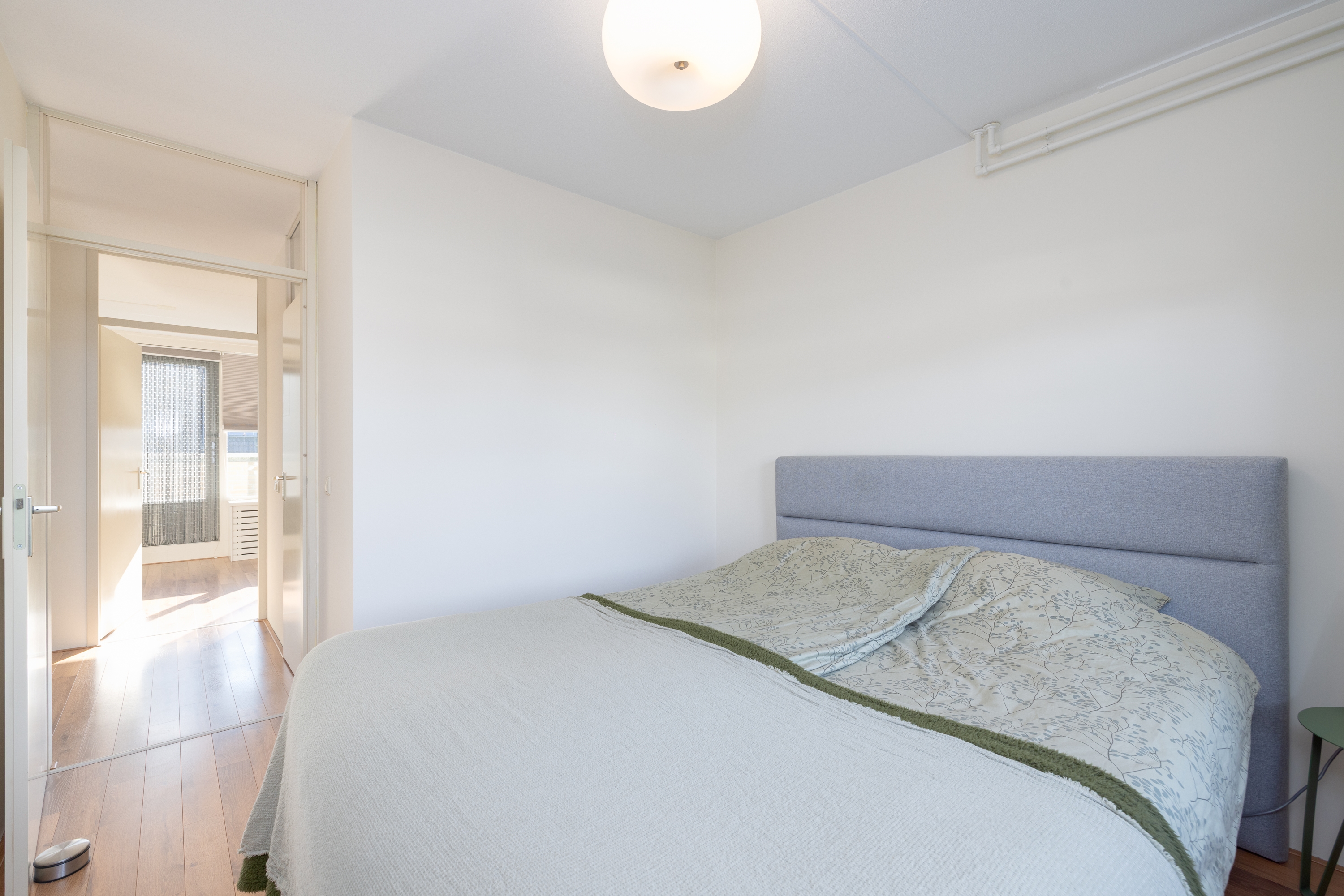 De master bedroom is royaal en aangenaam licht, met over de volledige breedte toegang tot het balkon. Een fijne plek om de dag rustig te beginnen of af te sluiten.