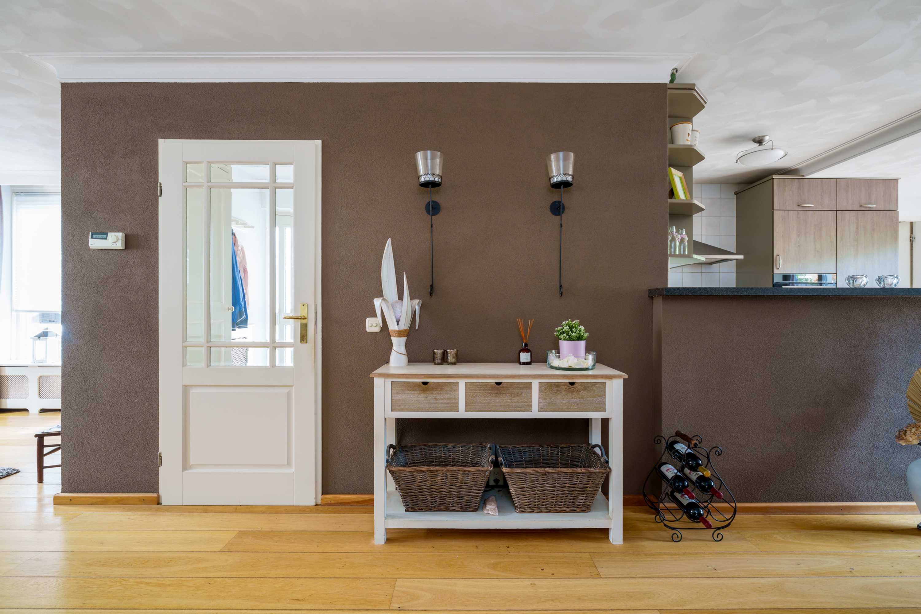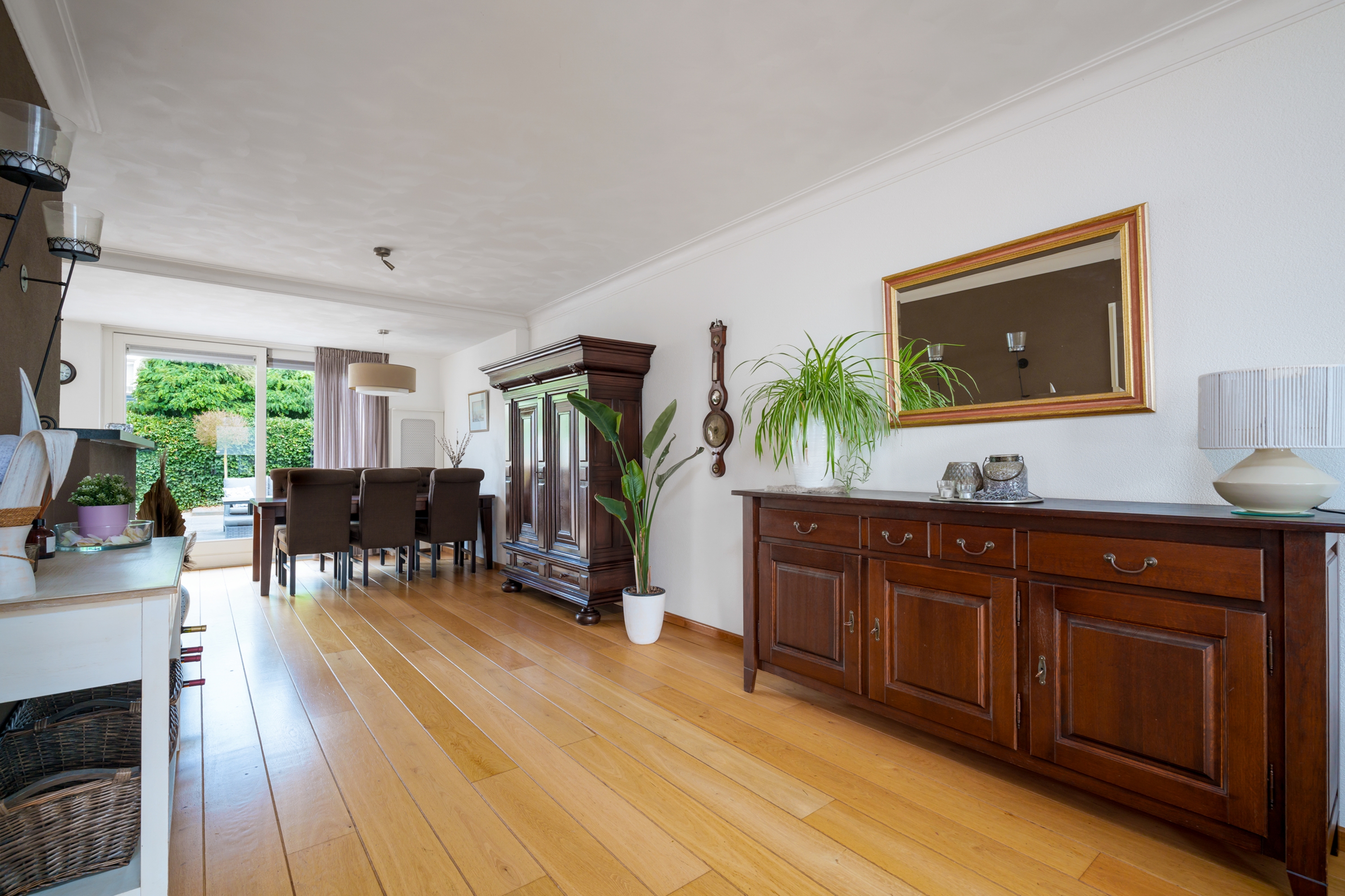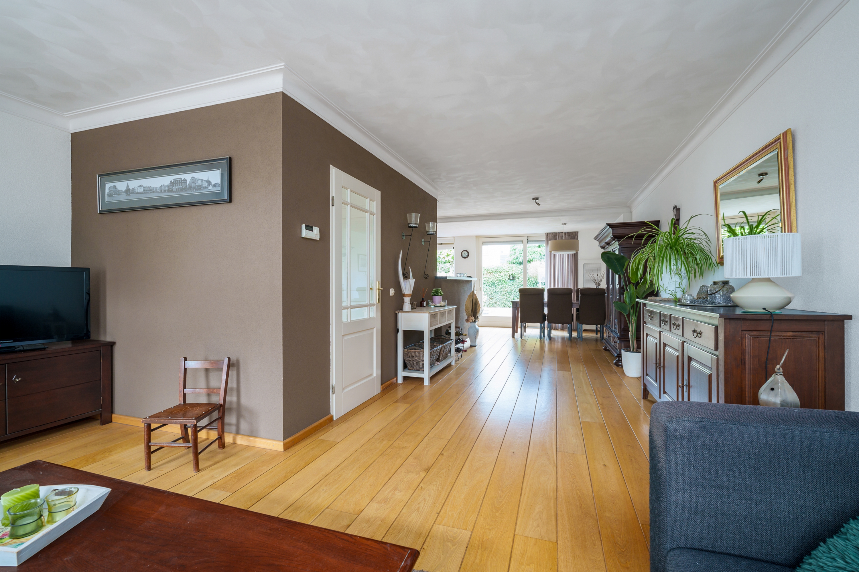 Via de entree met hal en toilet kom je in de lichte en ruime woonkamer. De afwerking is hoogwaardig met een massief eiken vloer, spachtelputz wanden en een glad gestuuct plafond met sierlijsten, wat samen zorgt voor een warme en luxe uitstraling.