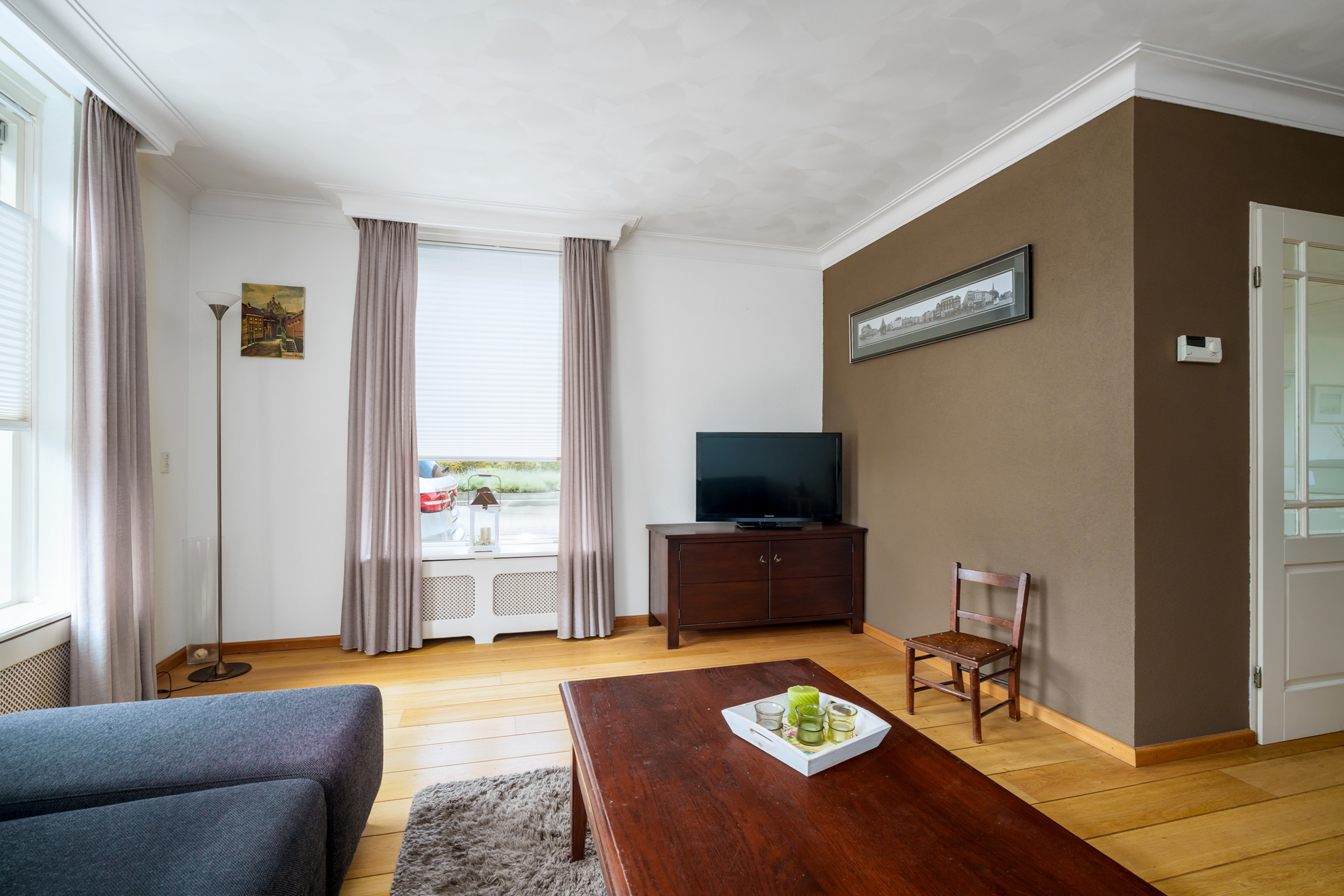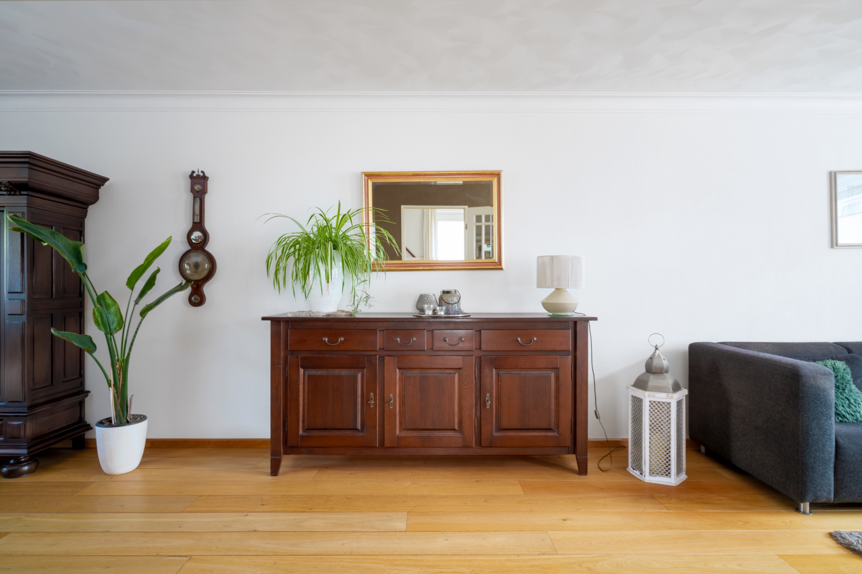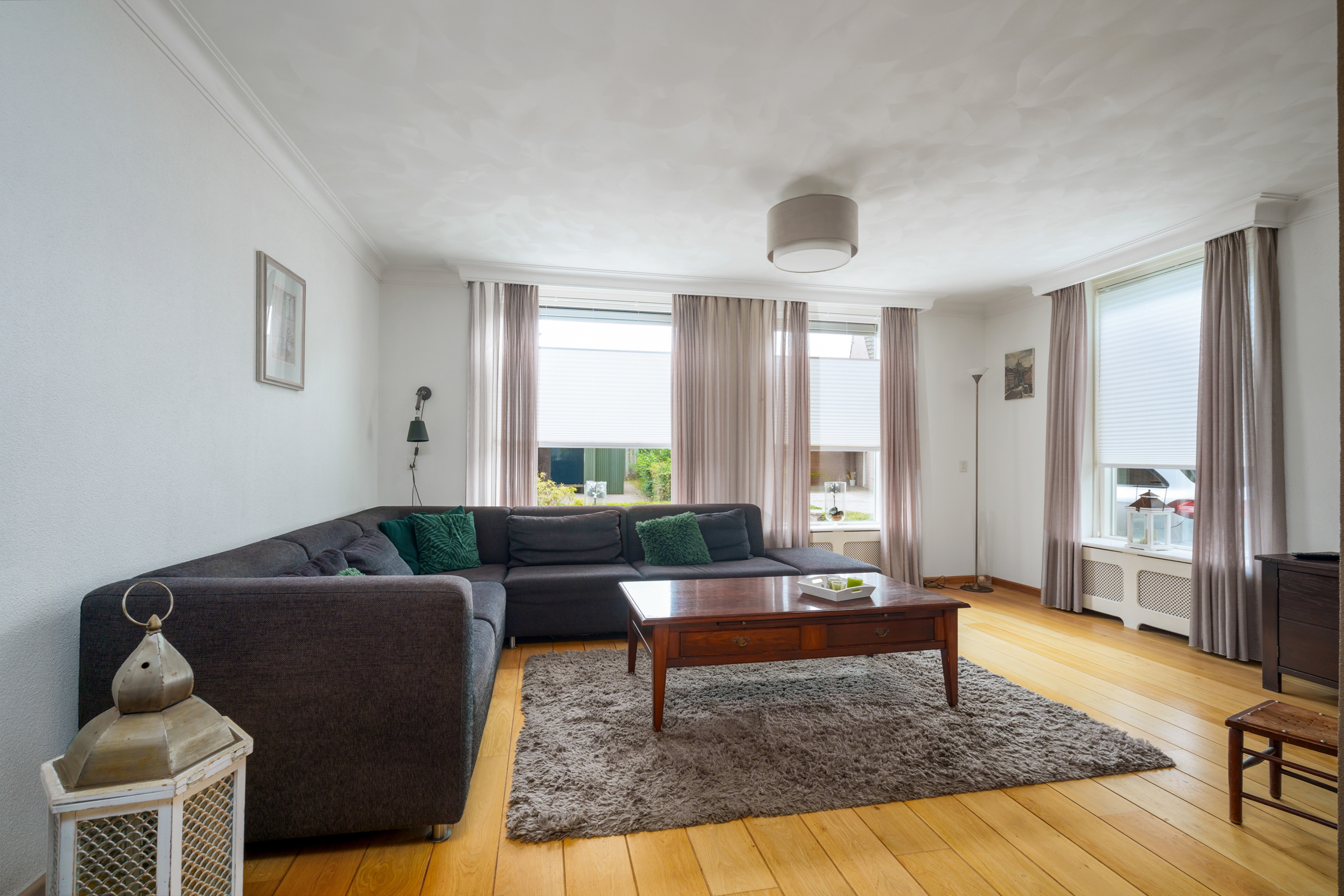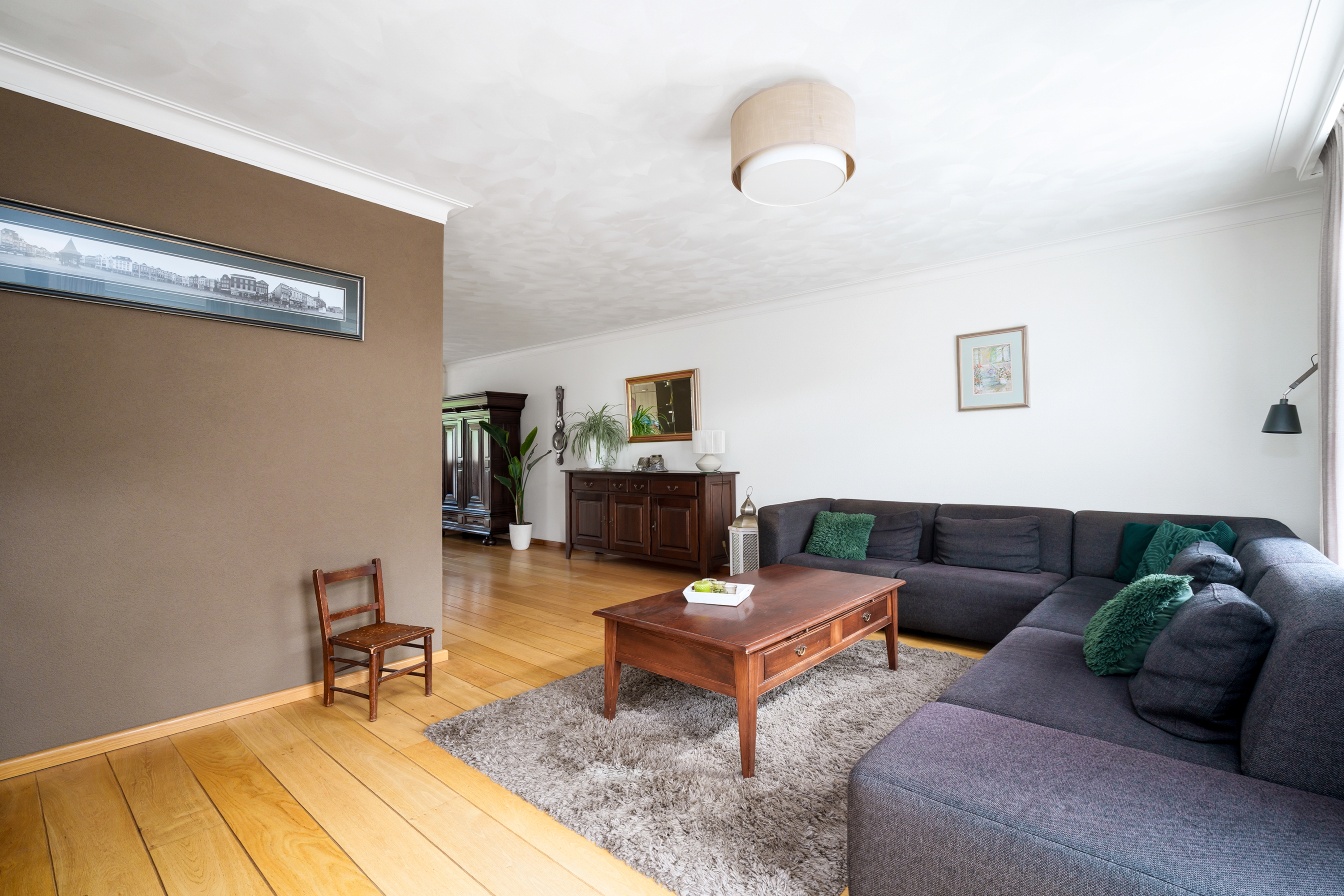 Via de entree met hal en toilet kom je in de lichte en ruime woonkamer. De afwerking is hoogwaardig met een massief eiken vloer, spachtelputz wanden en een glad gestuuct plafond met sierlijsten, wat samen zorgt voor een warme en luxe uitstraling.