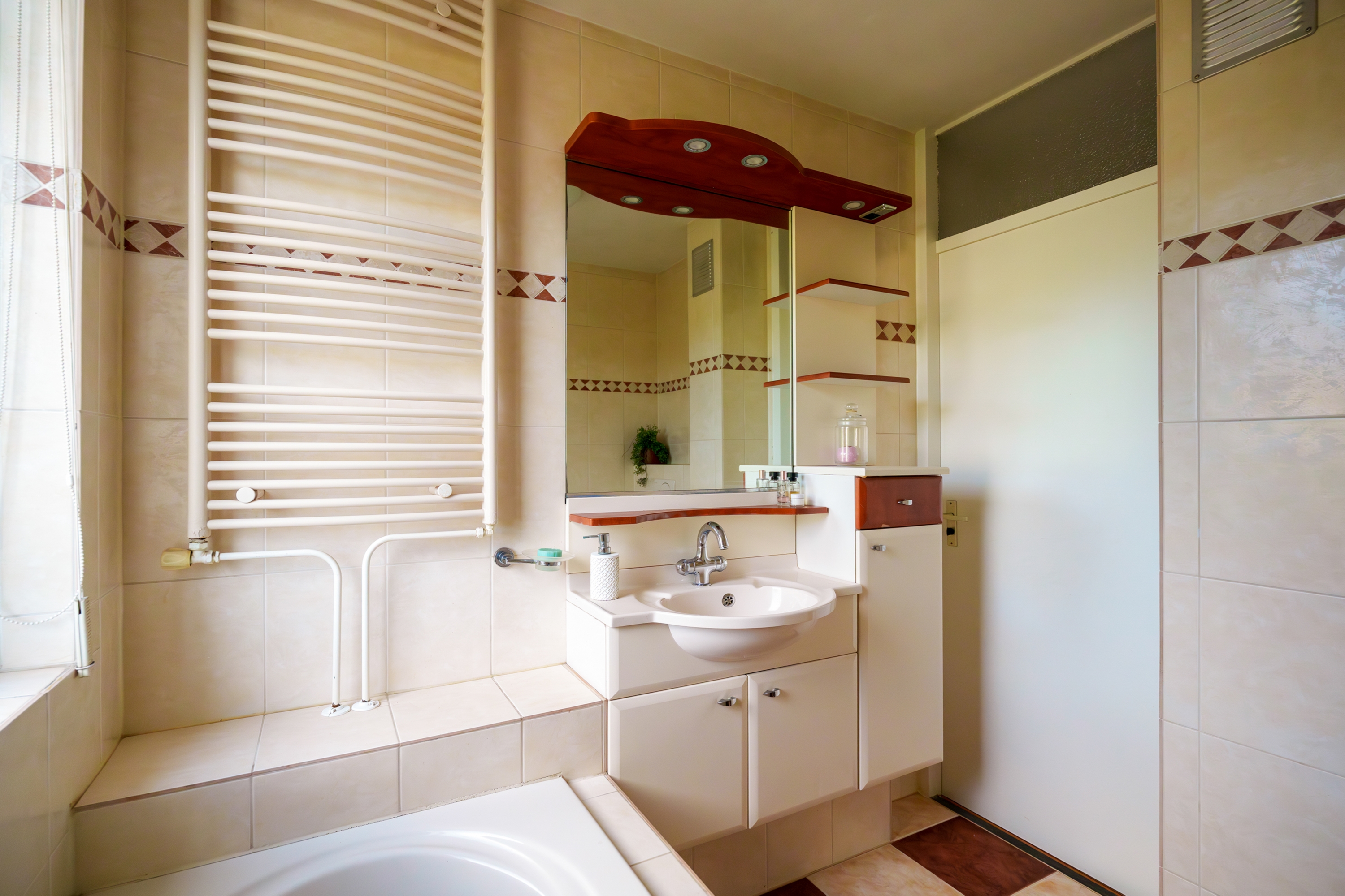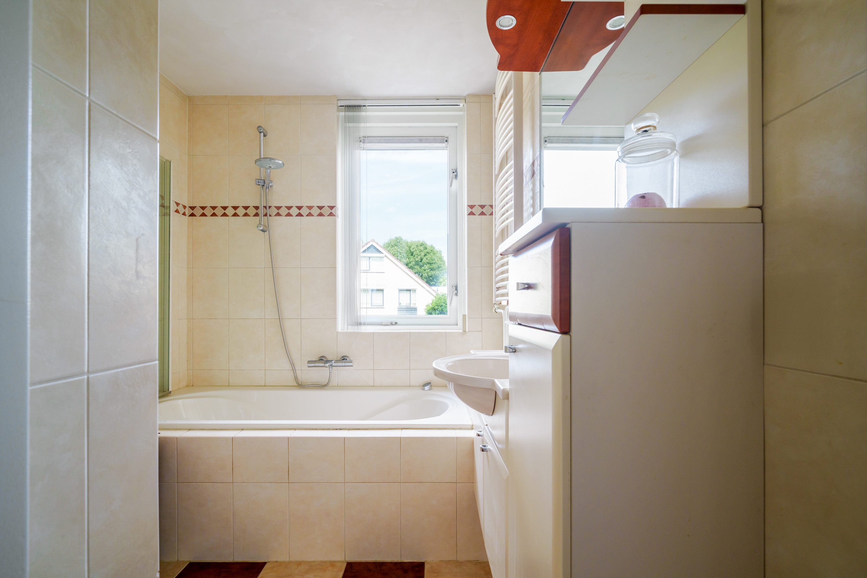 De overloop geeft toegang tot drie ruim bemeten slaapkamers en een complete badkamer. De badkamer is voorzien van een hangcloset, een ligbad met bubbelfunctie en een elegant wastafelmeubel. Het geheel is uitgevoerd in een warme, Mediterrane terracottakleurige betegeling, wat zorgt voor een sfeervolle en tijdloze uitstraling.