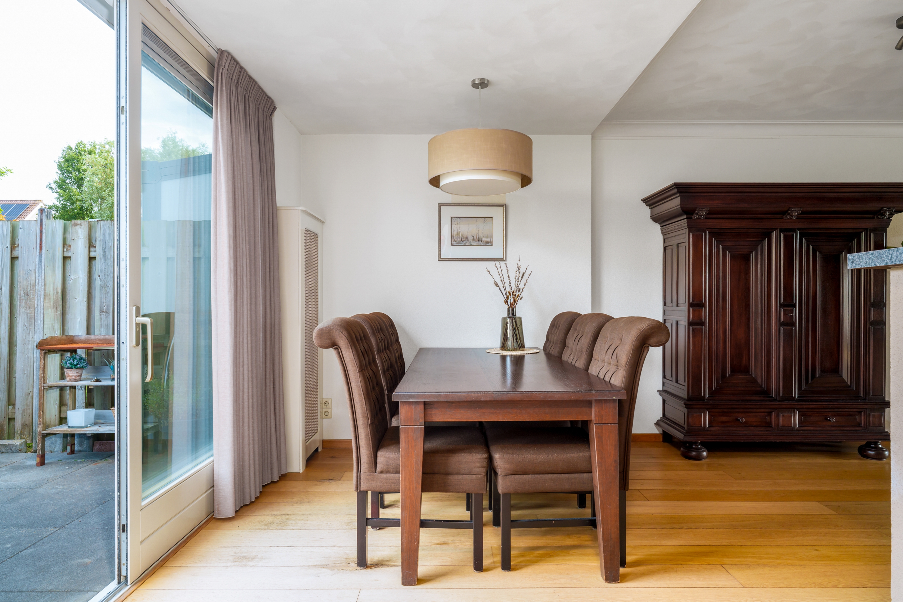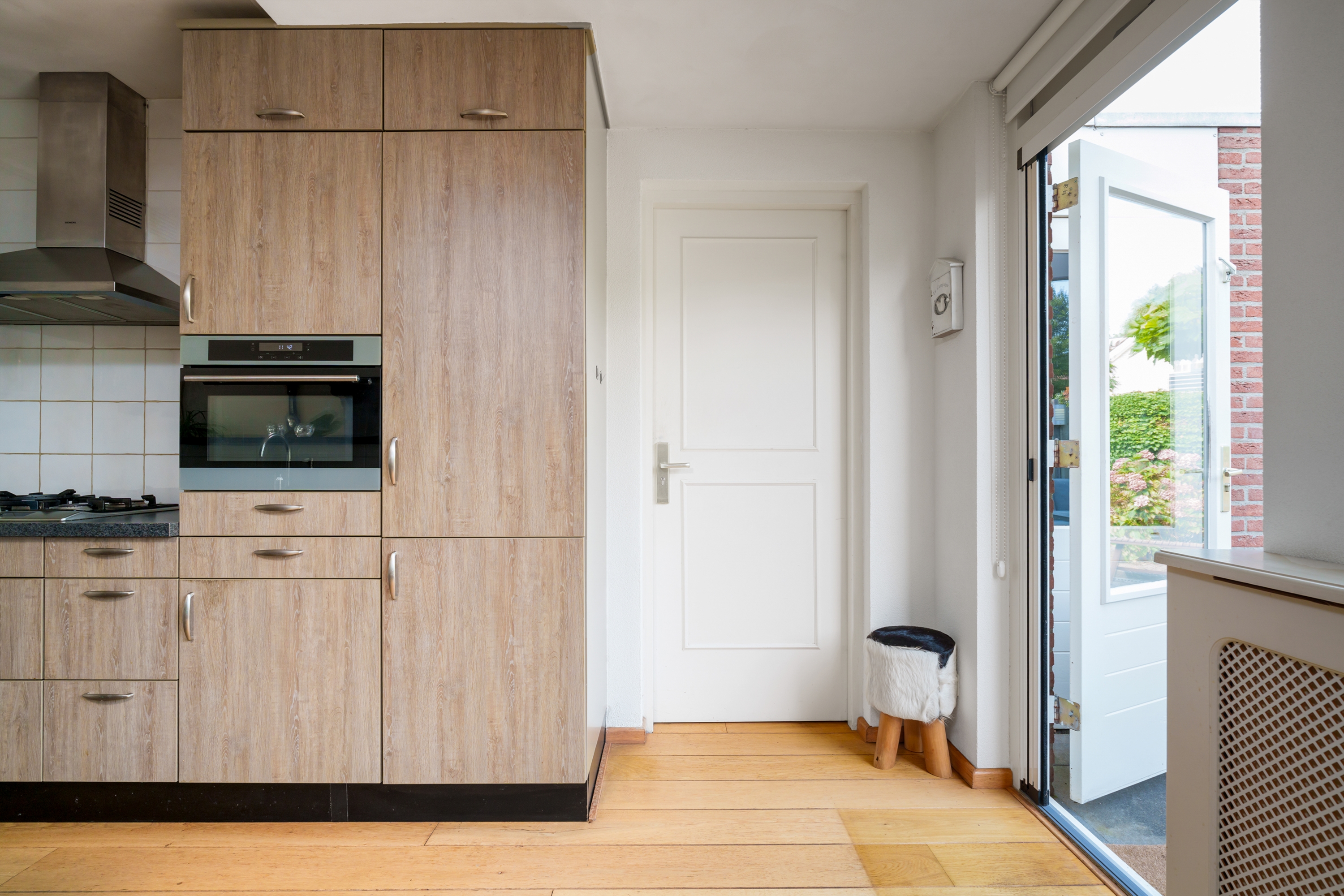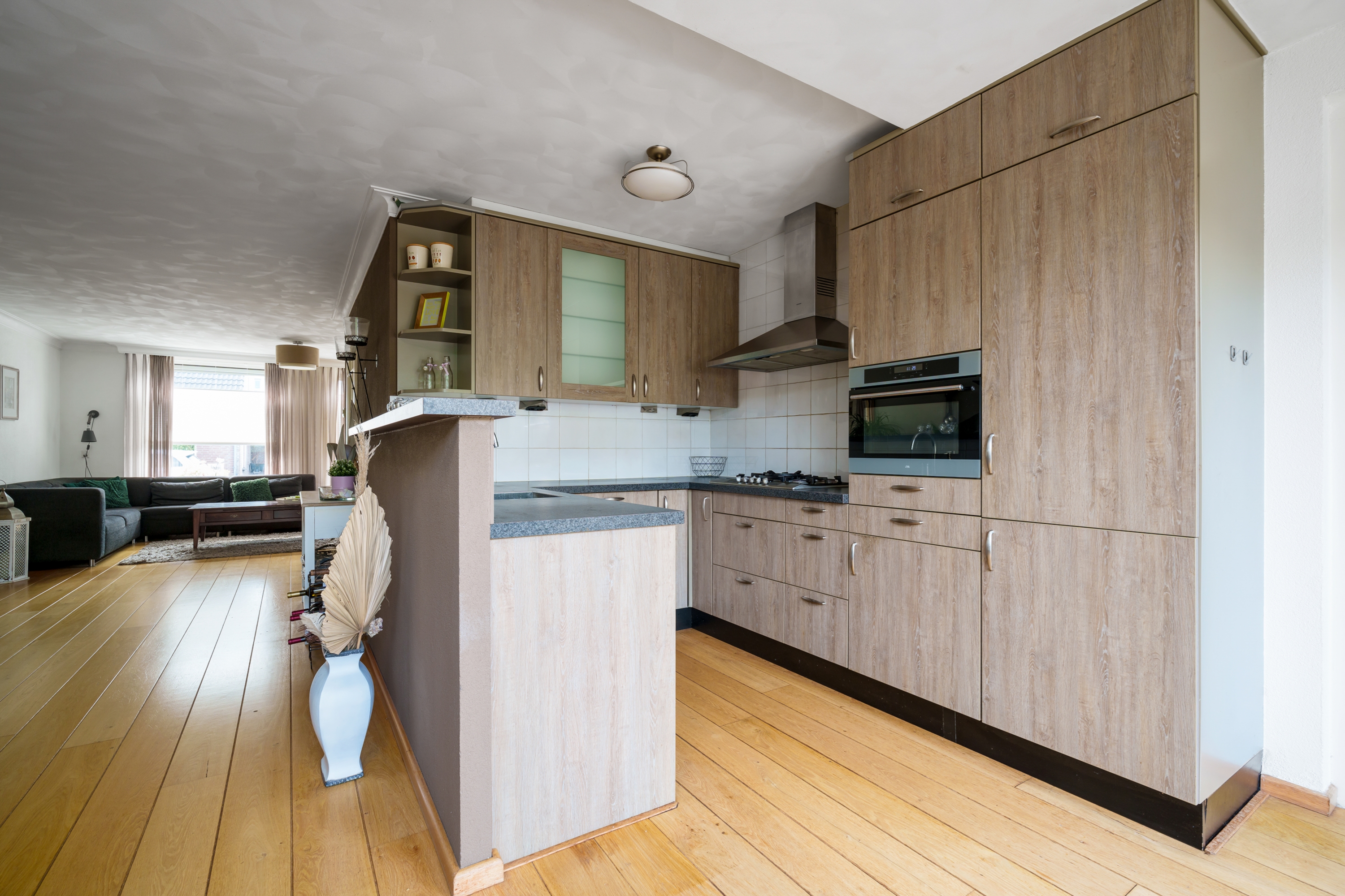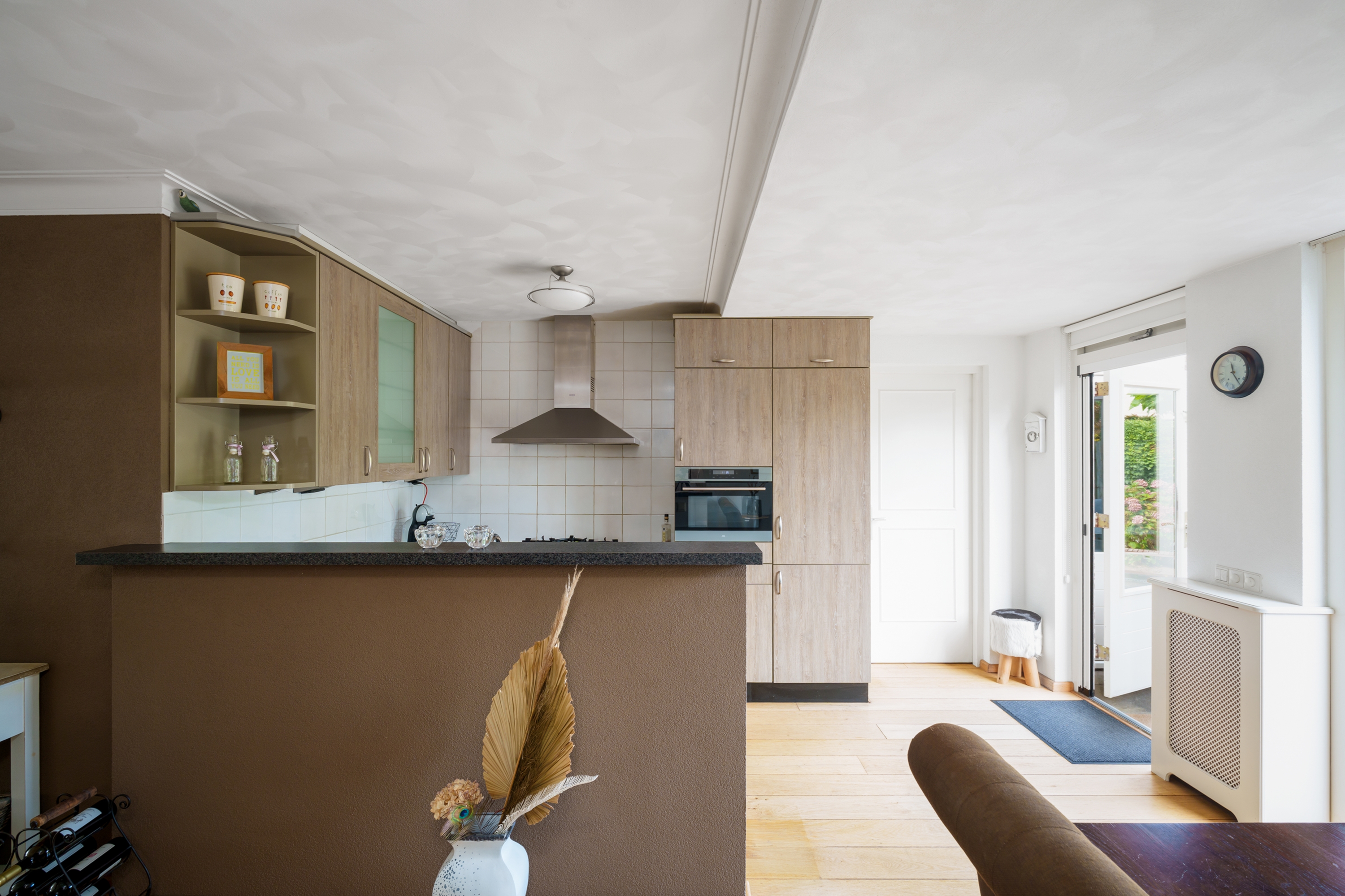 De royale leefkeuken in U-opstelling vormt het hart van de woning. Dankzij deze opstelling is er zeer veel werkruimte, ideaal voor de kookliefhebber. De keuken is verder uitgerust met een bar, een 5-pits kookplaat, combi-oven en een vaatwasser. Vanuit de keuken loop je via de schuifpui of de loopdeur direct het terras op een fijne verbinding tussen binnen en buiten, perfect voor lange zomeravonden en etentjes in de tuin.