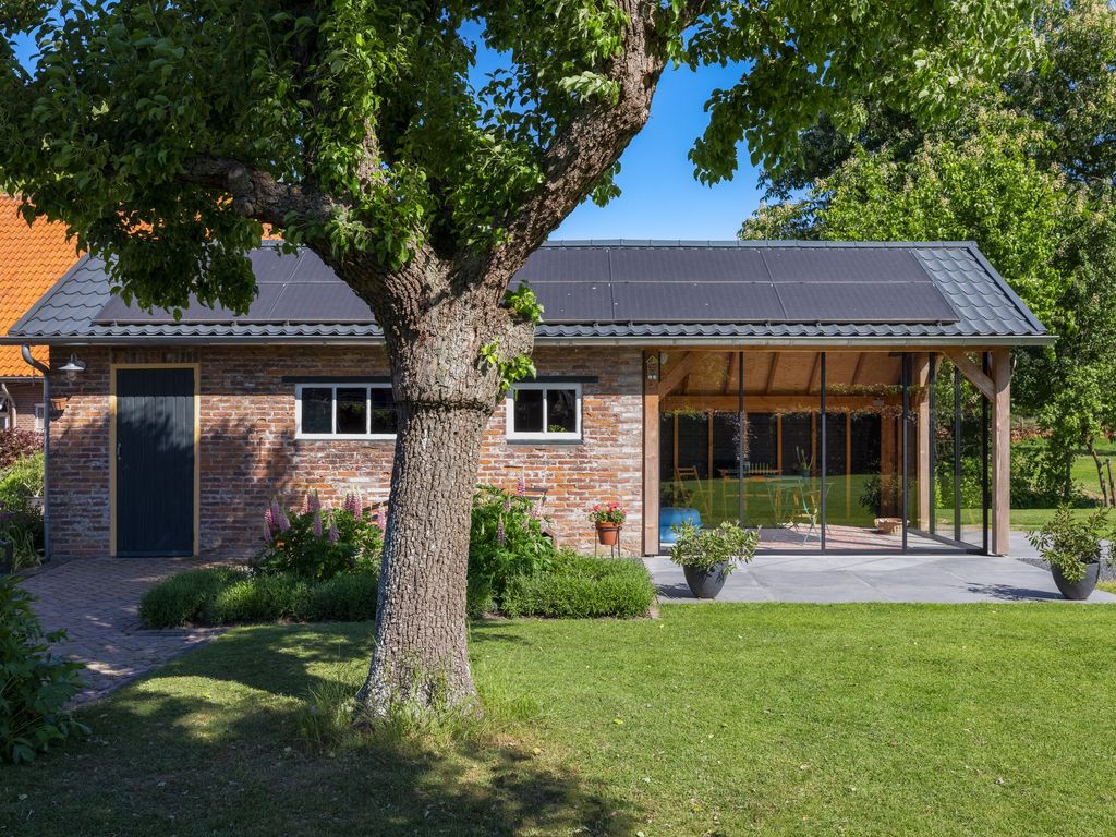 Voor en naast de woning ligt een klassieke siertuin. Aan de achterzijde strekt zich een weidetuin uit, met grazende robotmaaier voor een altijd strak gazon. Oude bomen zorgen voor natuurlijke schaduw, terwijl het tuinpaviljoen met glazen schuifwanden uitnodigt tot lange avonden buiten.