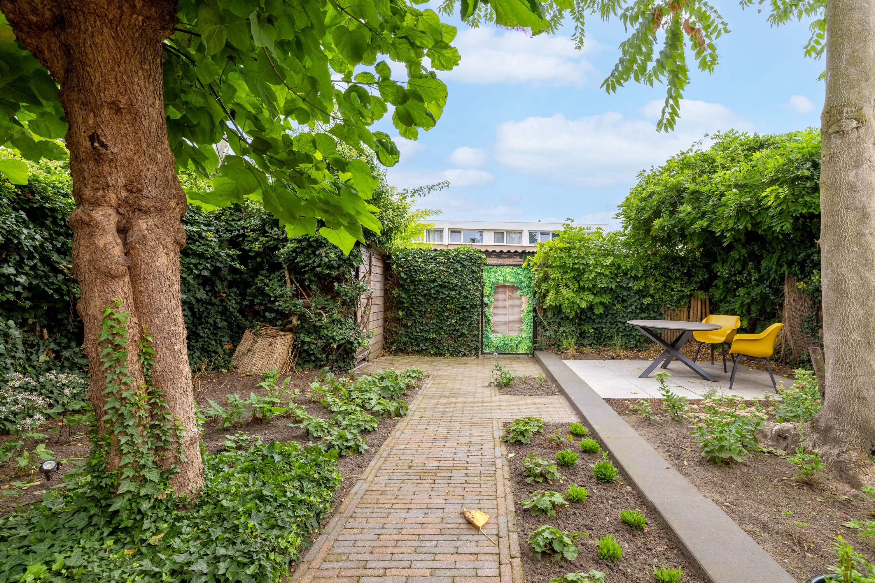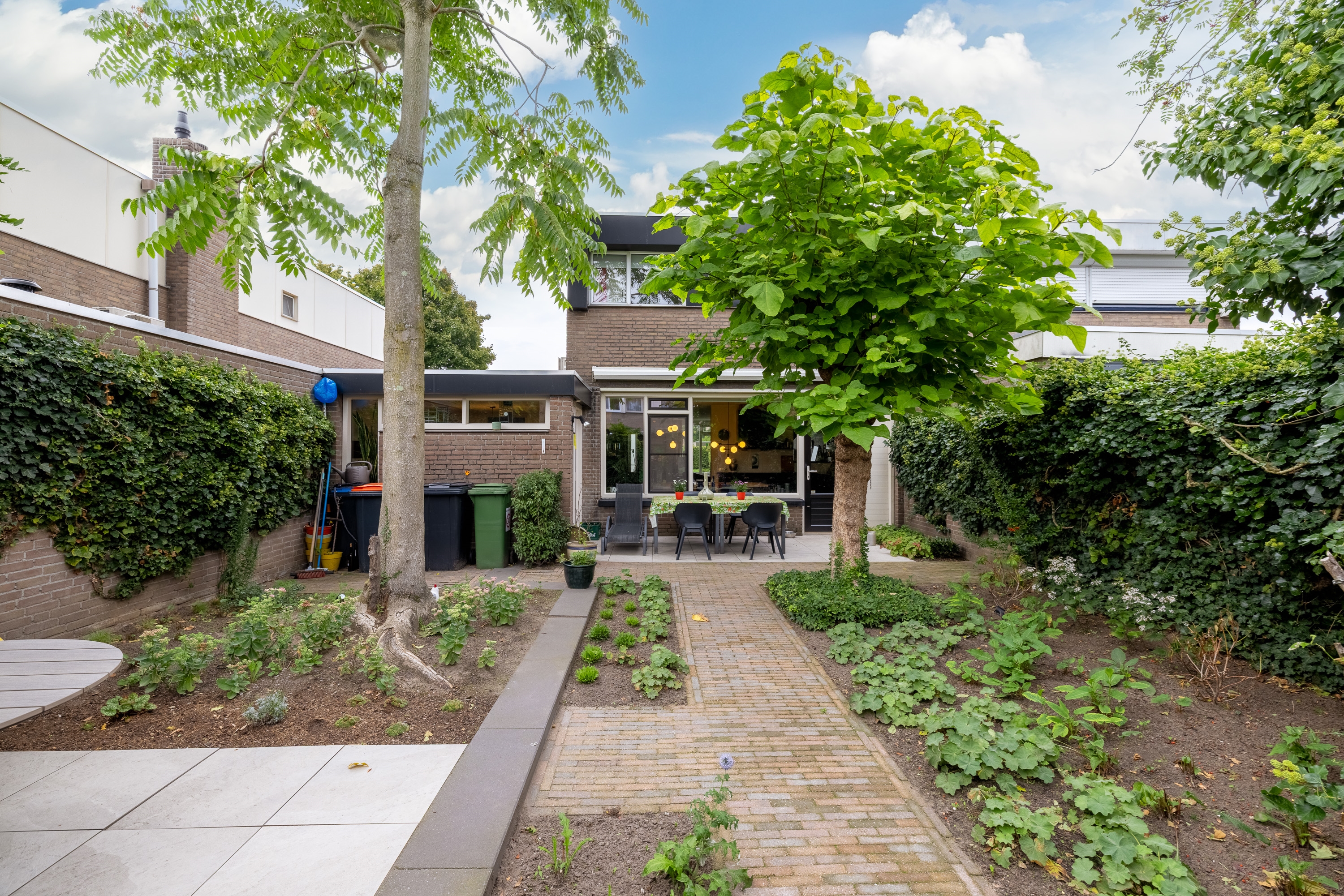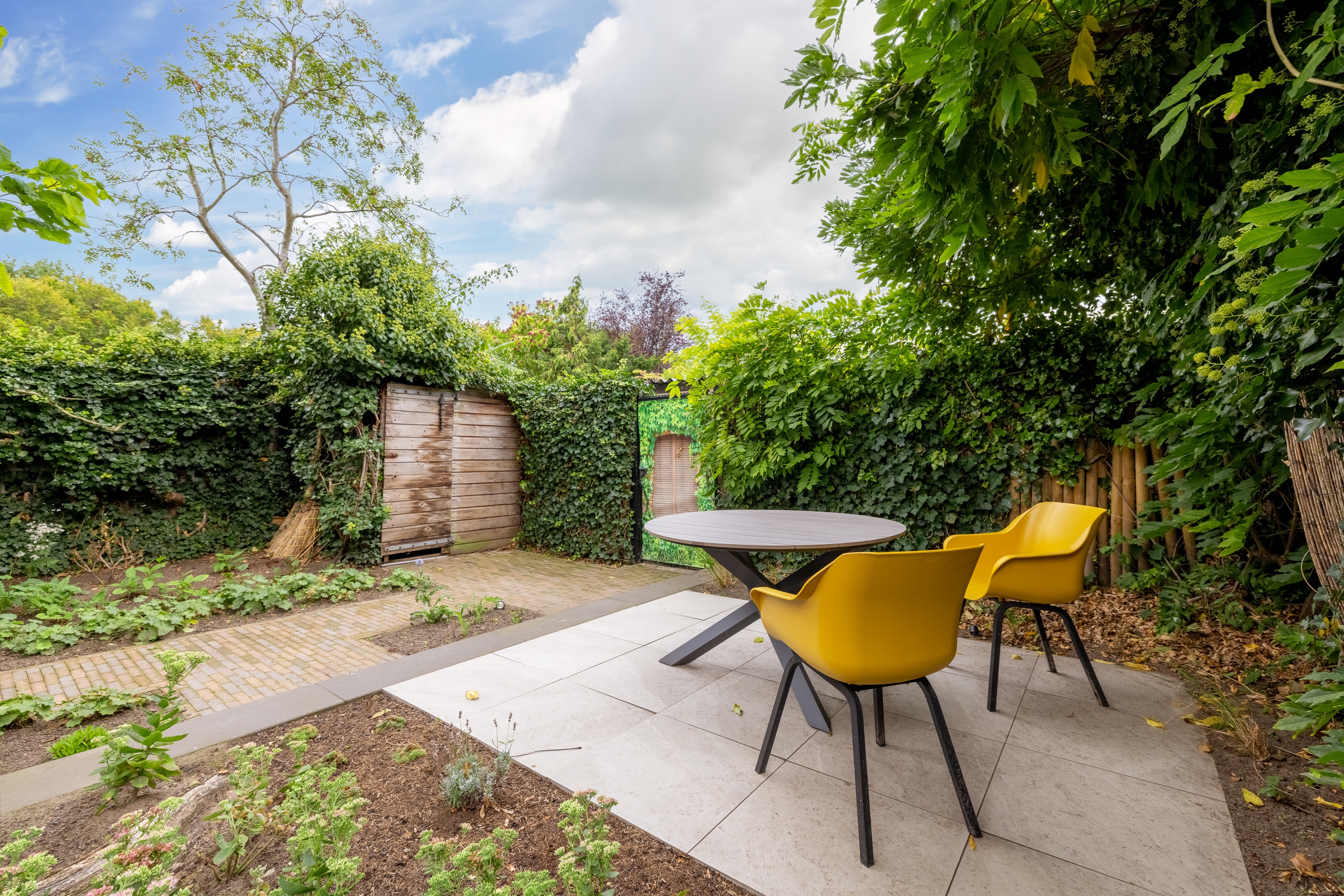 De diepe achtertuin op het zuidwesten is formeel aangelegd, maar door de volwassen beplanting en bomen waant u zich in mediterrane sferen – een vleugje Ibiza in eigen achtertuin. De tuin is bovendien goed bereikbaar via een brede brandgang.
