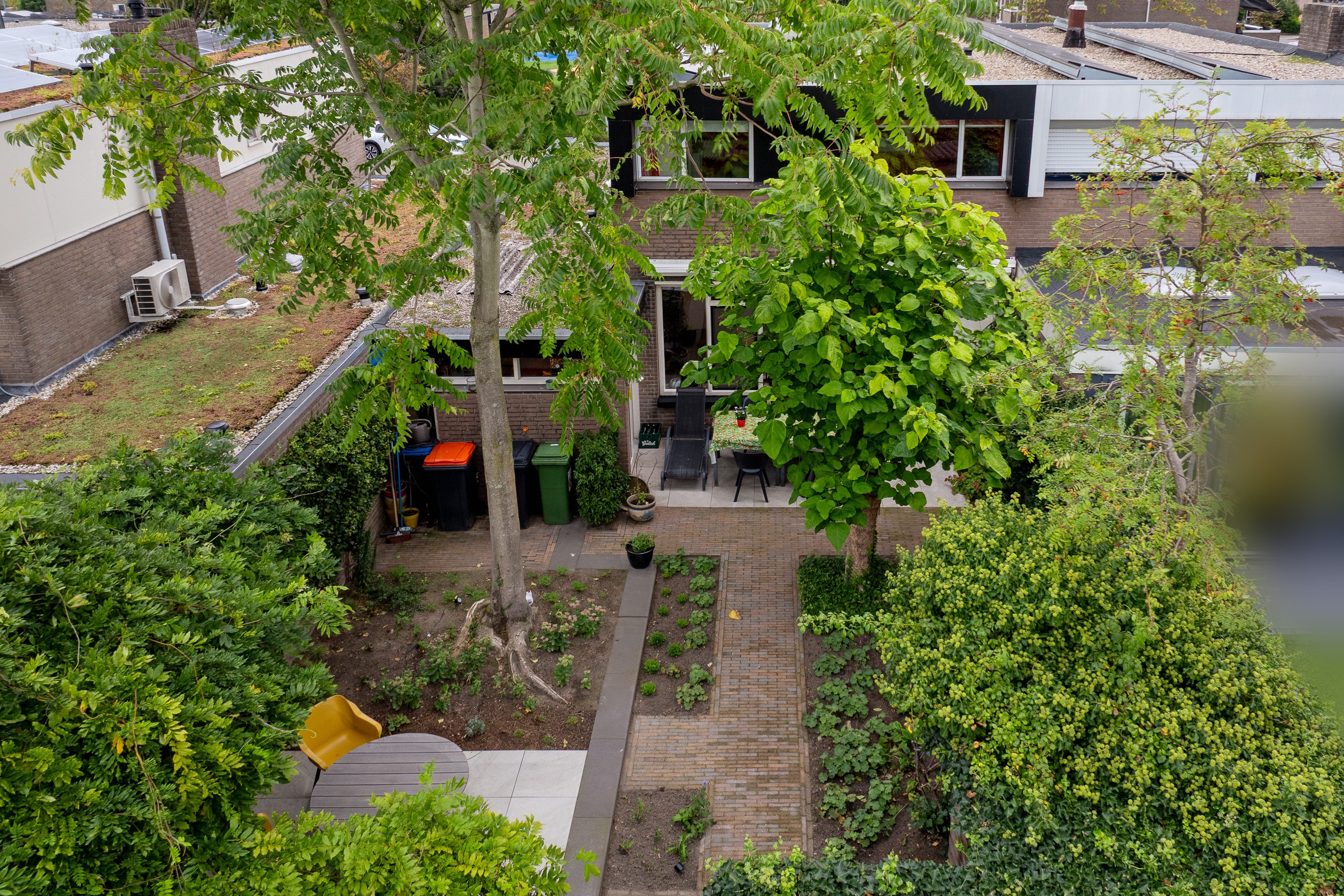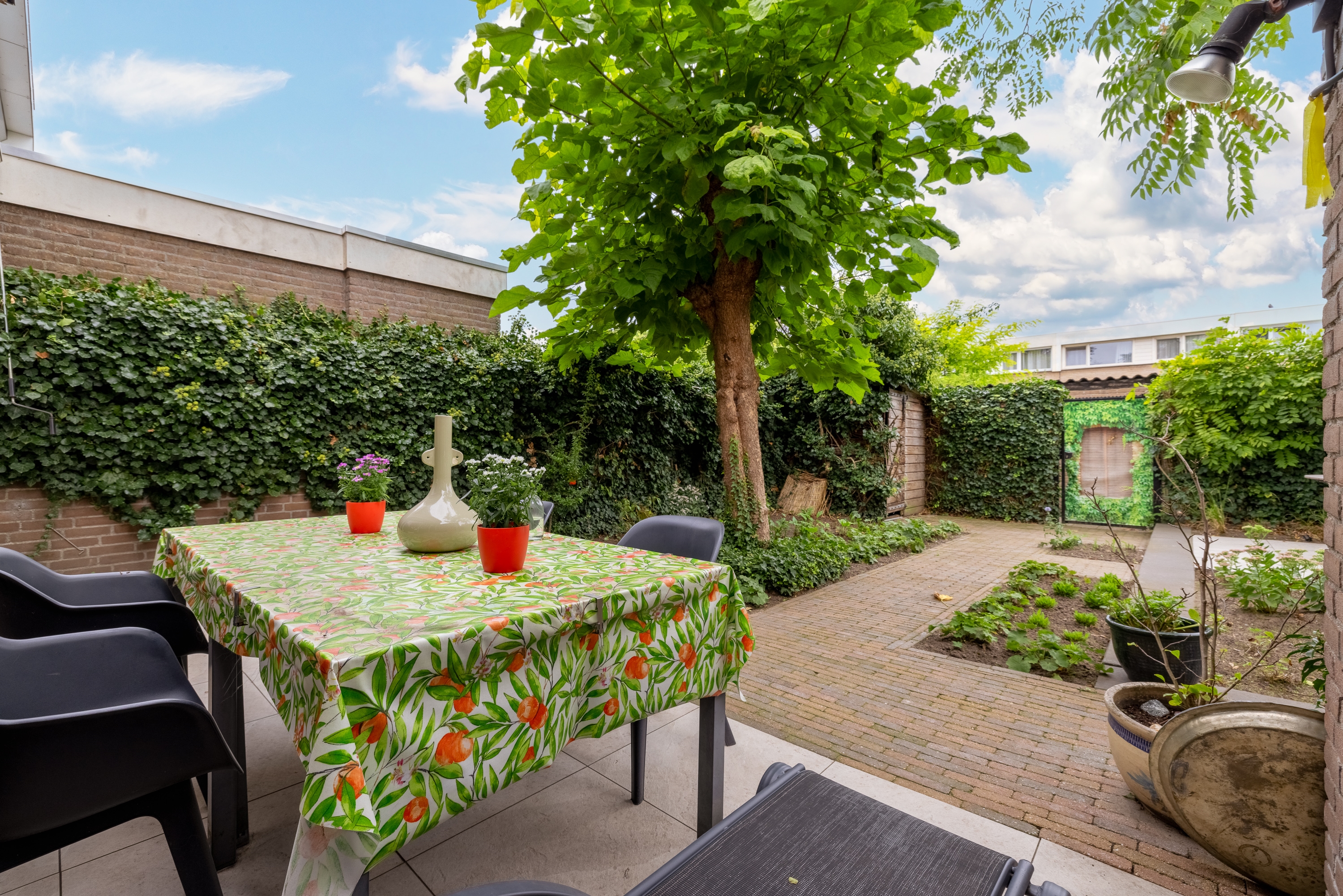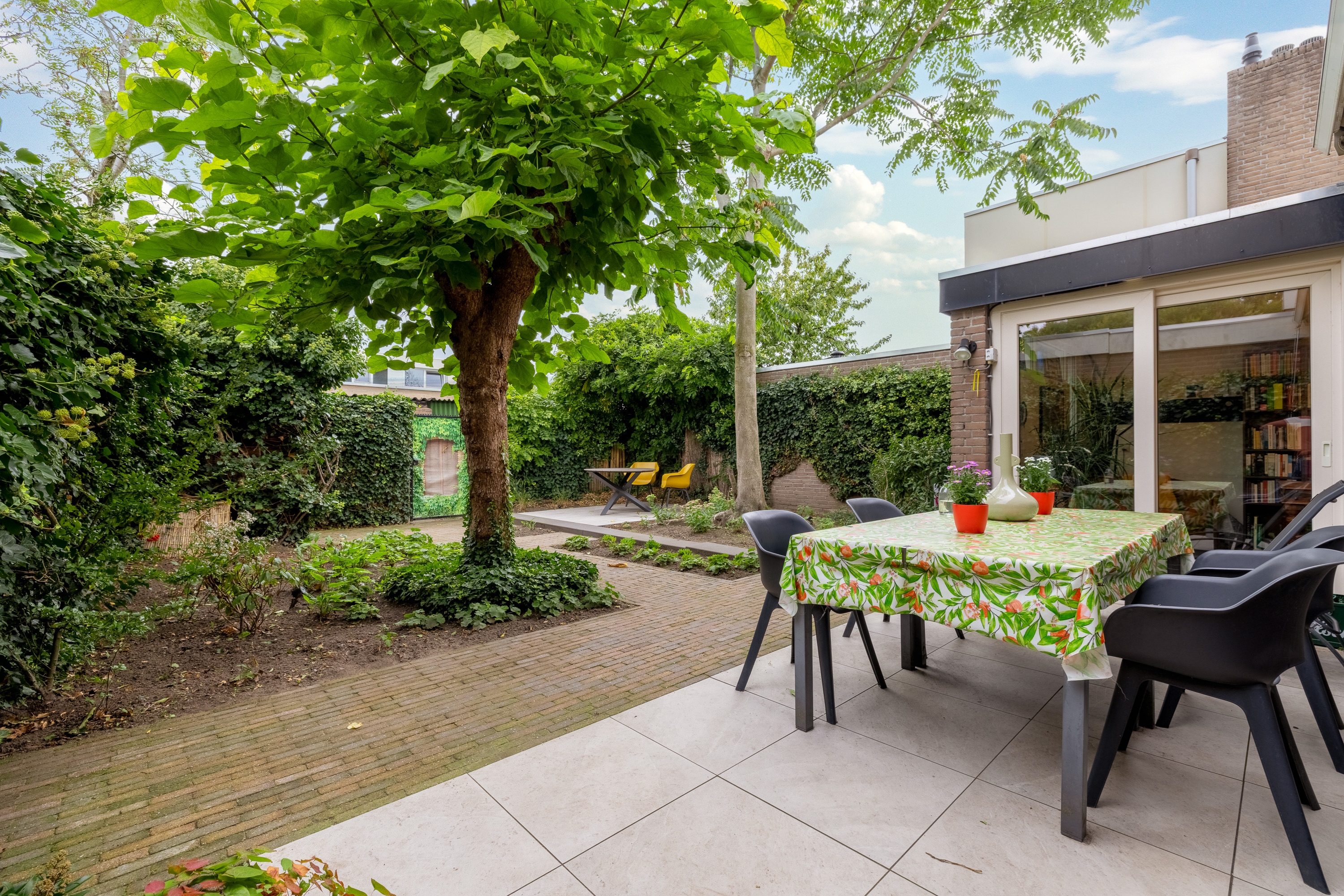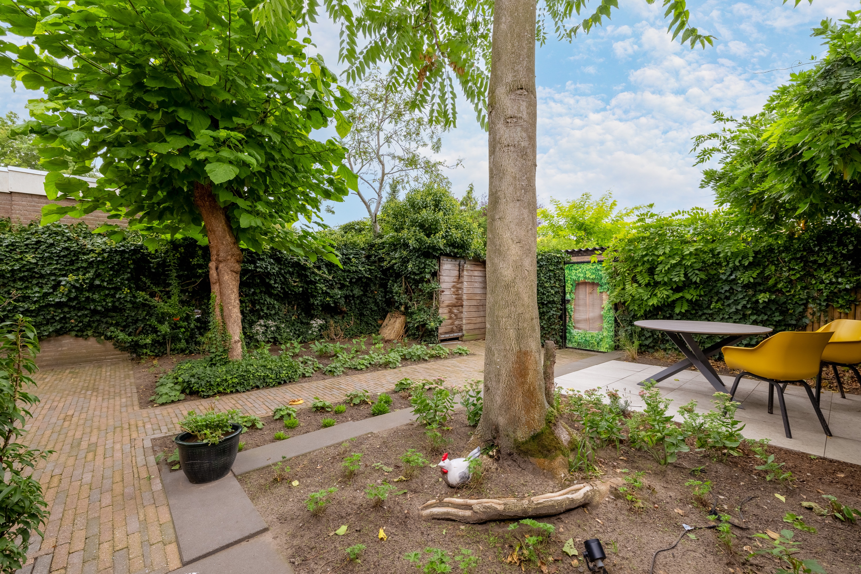 De diepe achtertuin op het zuidwesten is formeel aangelegd, maar door de volwassen beplanting en bomen waant u zich in mediterrane sferen – een vleugje Ibiza in eigen achtertuin. De tuin is bovendien goed bereikbaar via een brede brandgang.