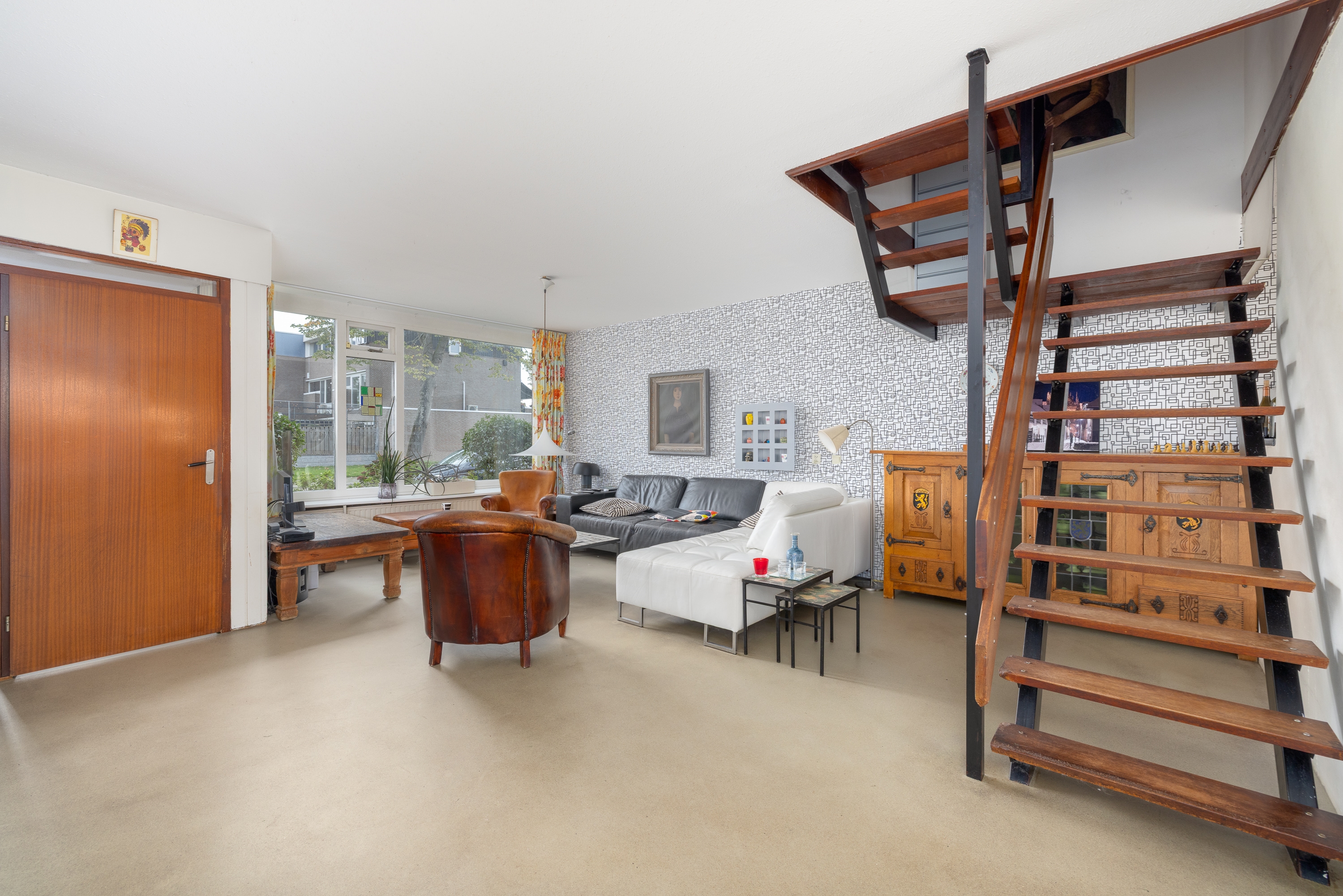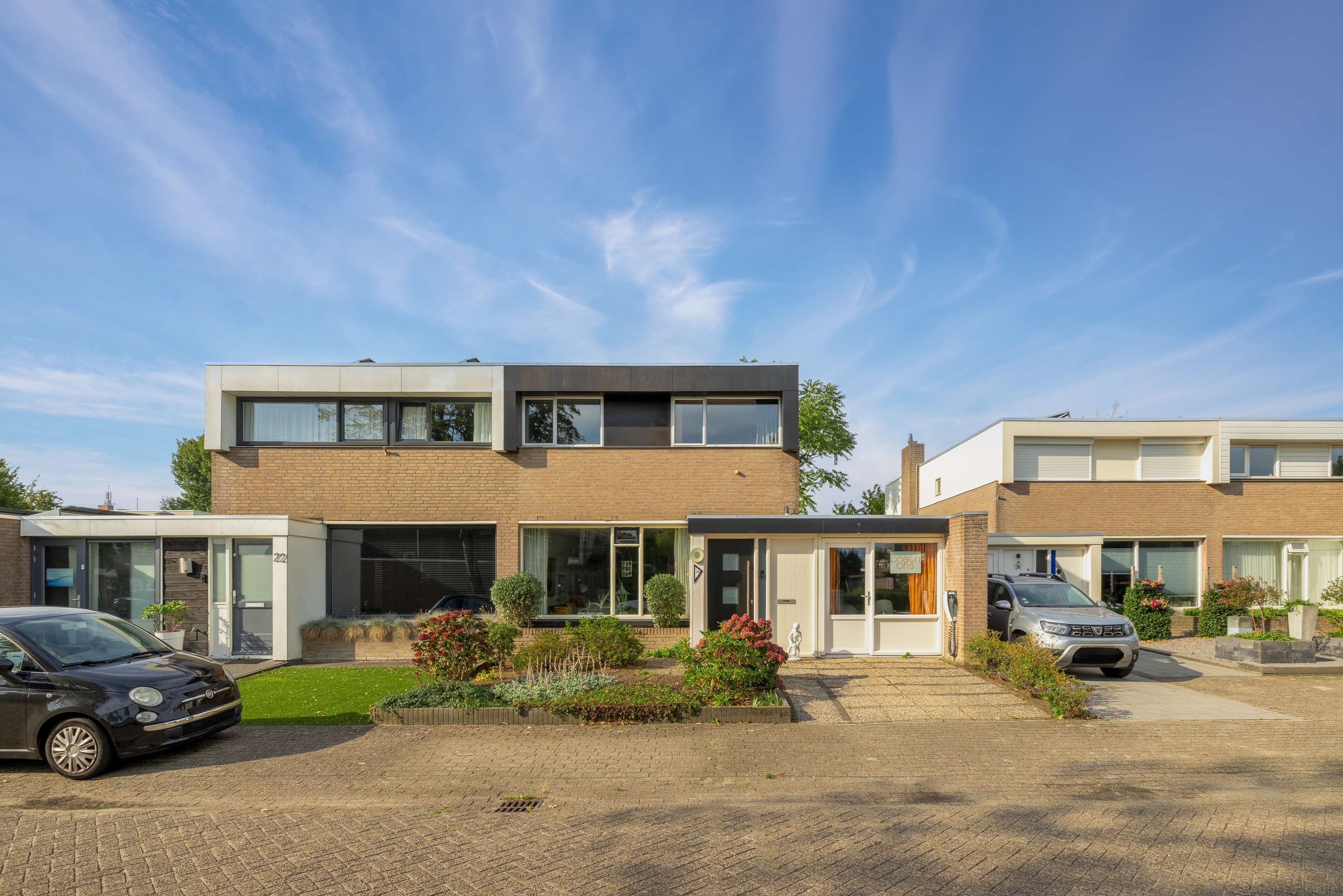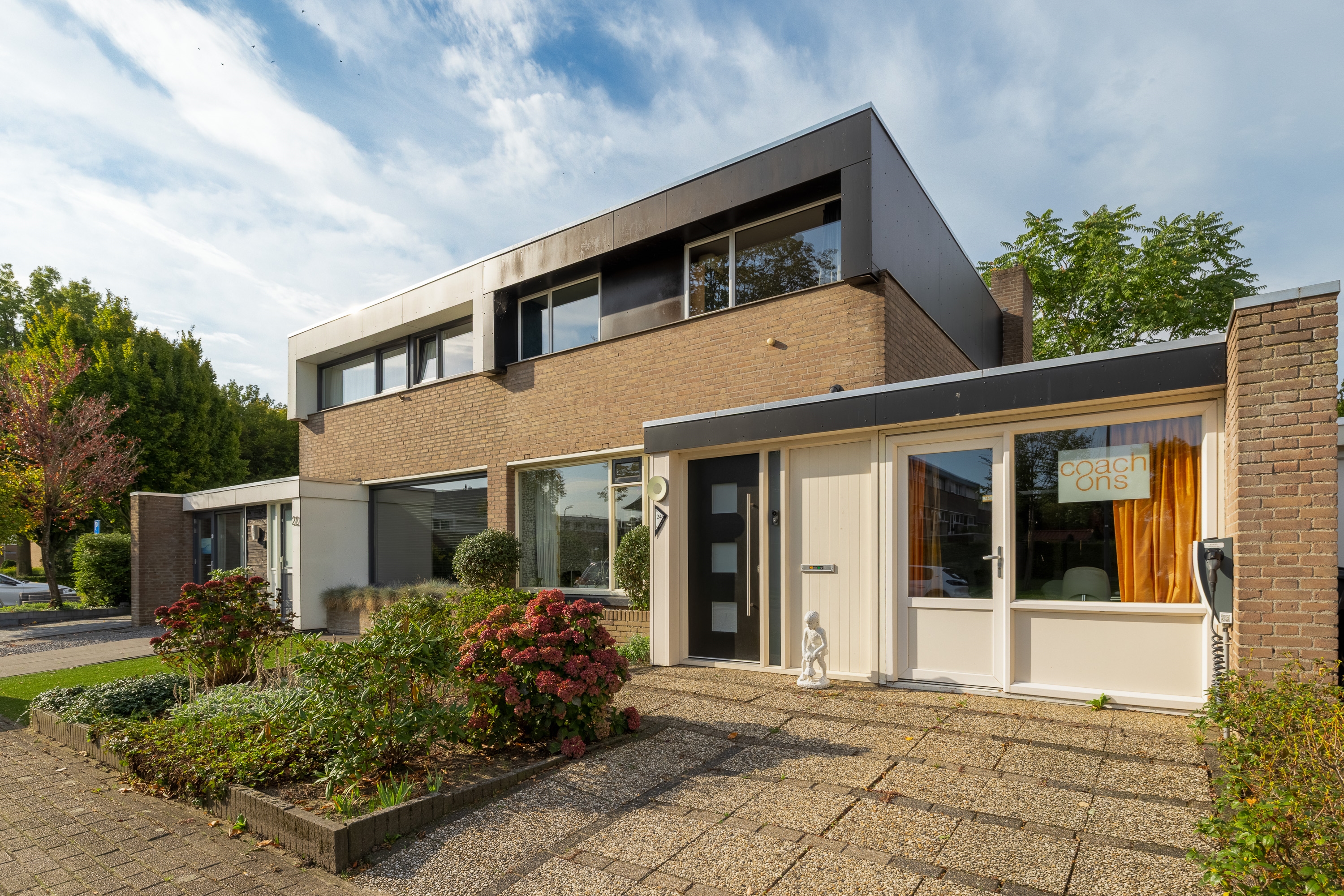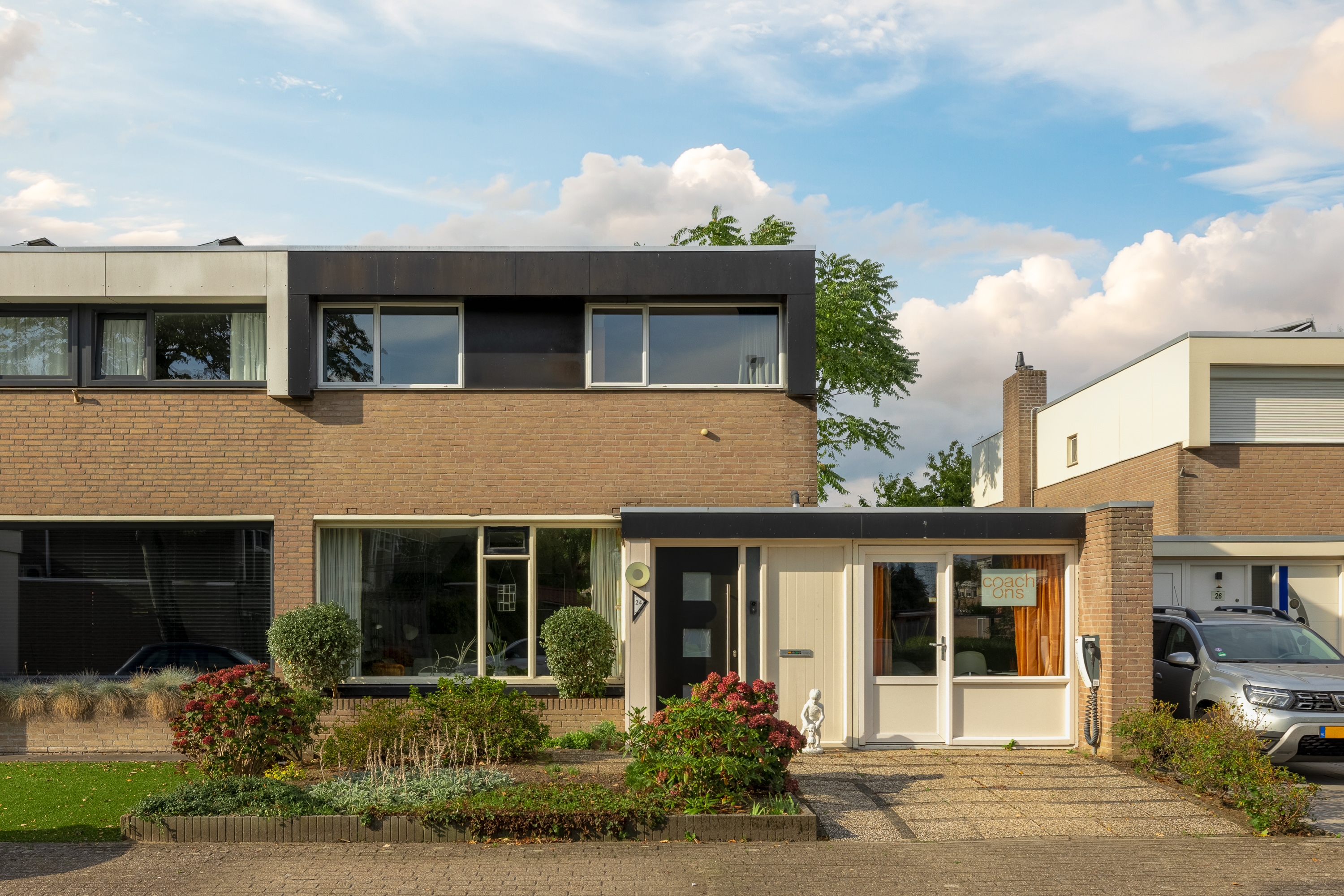 De voortuin met brede stoep geeft de woning direct een uitnodigende uitstraling.