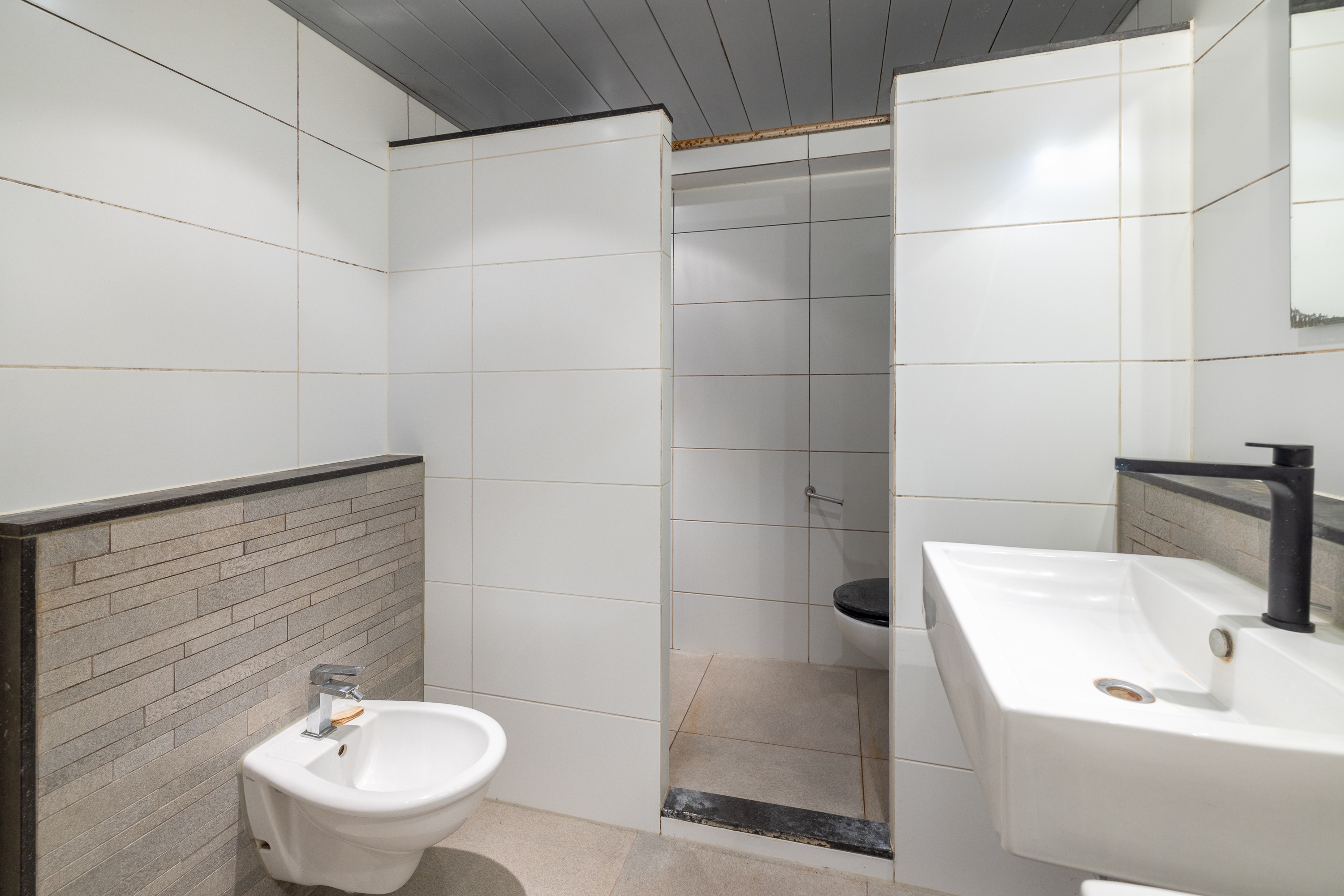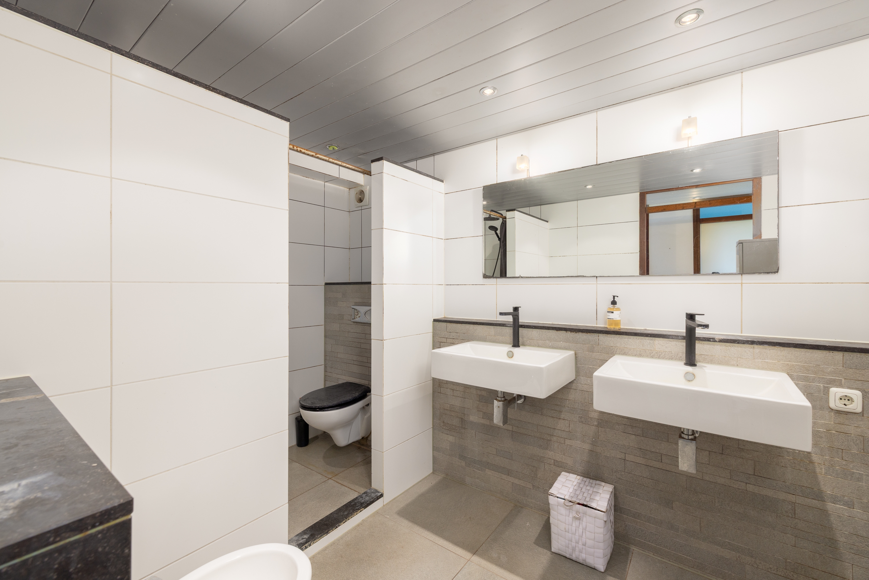 De verdieping biedt een grote overloop en een ruime badkamer met douche, toilet, bidet en dubbele wastafel, voorzien van stijlvol sanitair en modern tegelwerk. Daarnaast zijn er twee ruime slaapkamers en een royale master bedroom over de volledige breedte van de woning.
