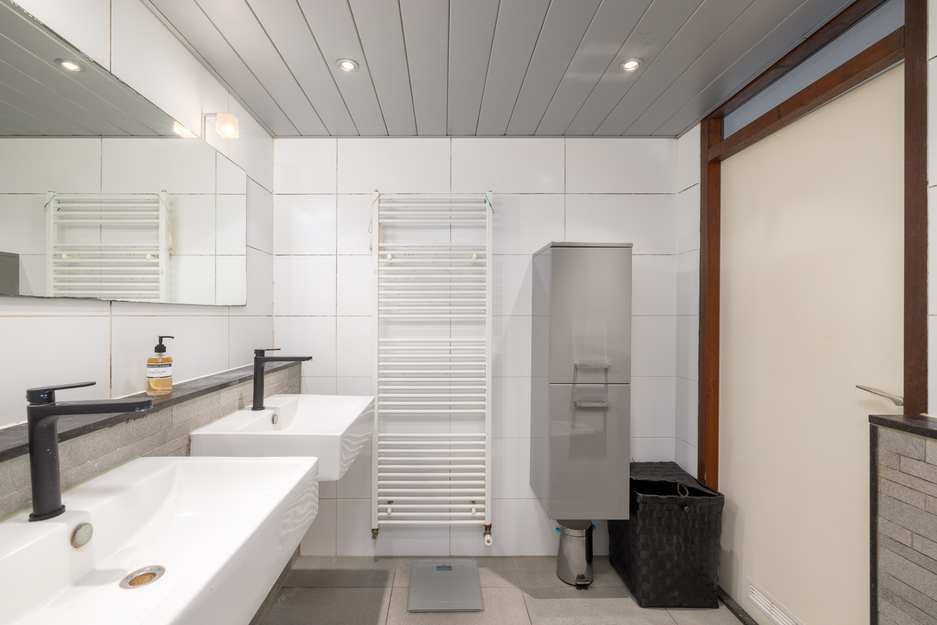 Via een brede toog bereikt u de studeerkamer, momenteel ingericht als bibliotheek. Met de schuifpui open vormt deze ruimte een mooi geheel met de tuin. Ideaal om rustig te werken, lezen of studeren, terwijl de rest van het gezin zich in de woonkamer vermaakt.