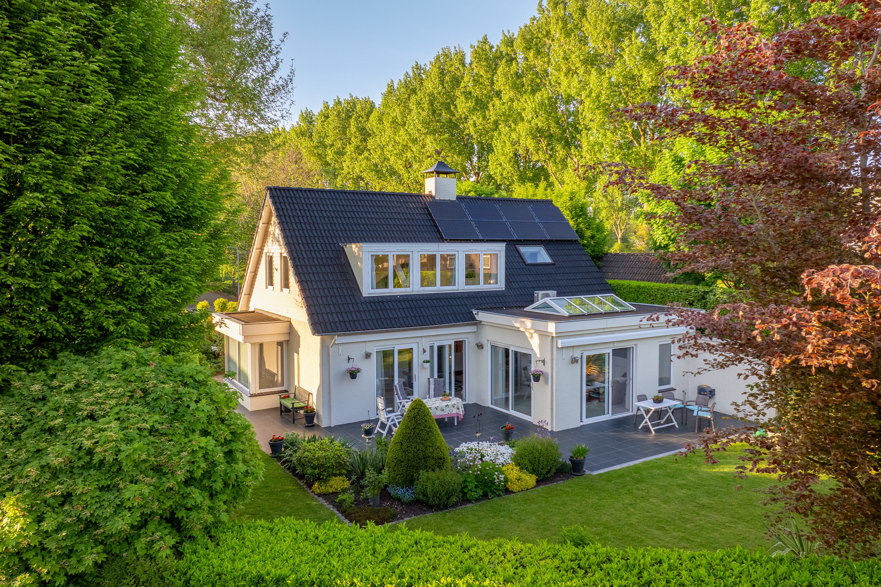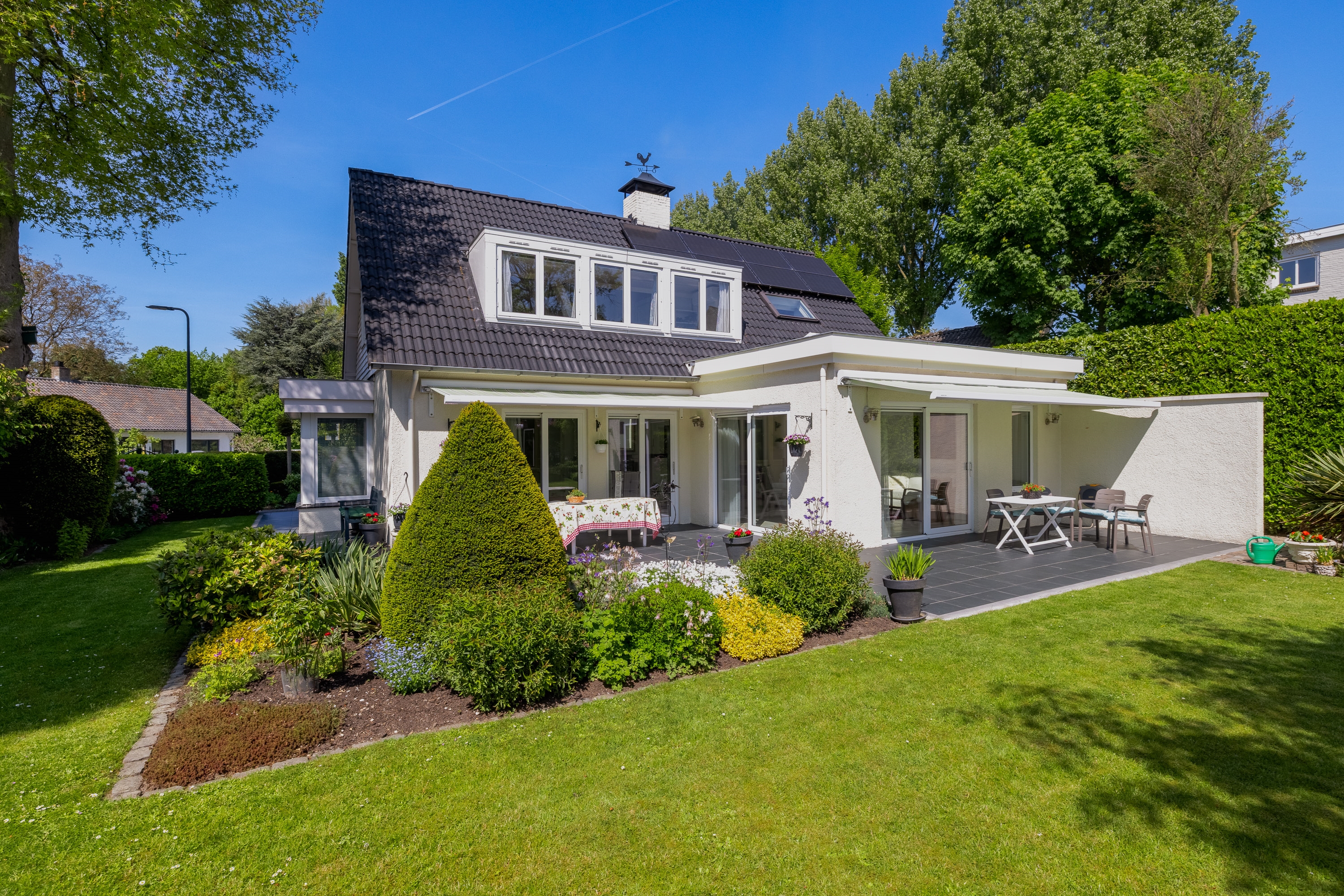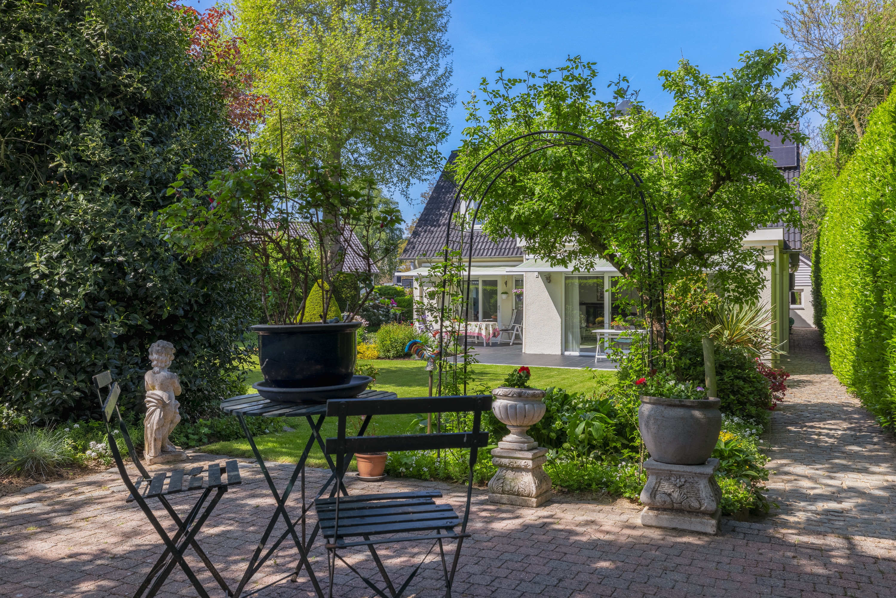 De volledig omsloten tuin is parkachtig aangelegd met volwassen beplanting en meerdere terrassen. Zon en schaduw wisselen elkaar de hele dag af. Rust en privacy staan hier centraal.