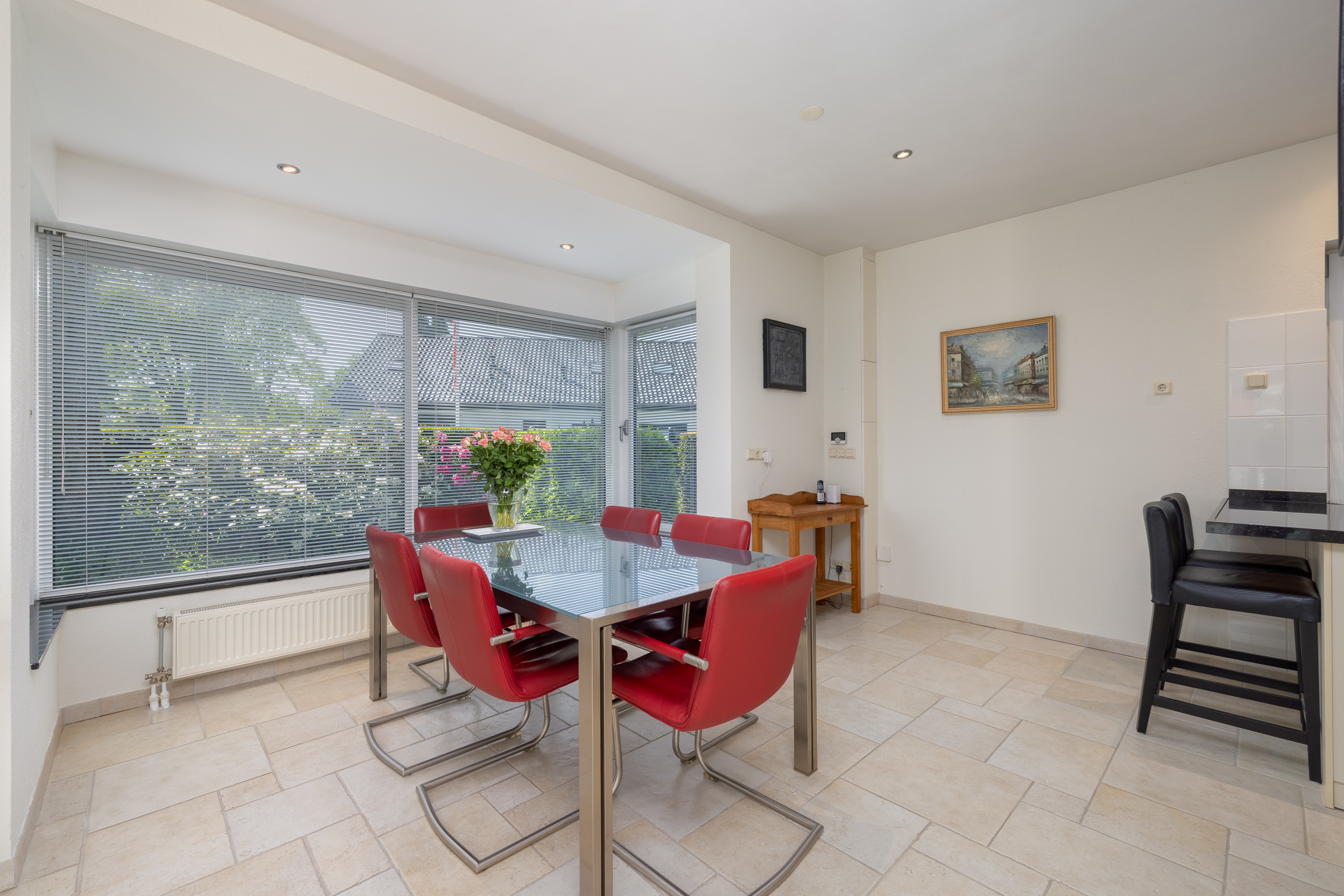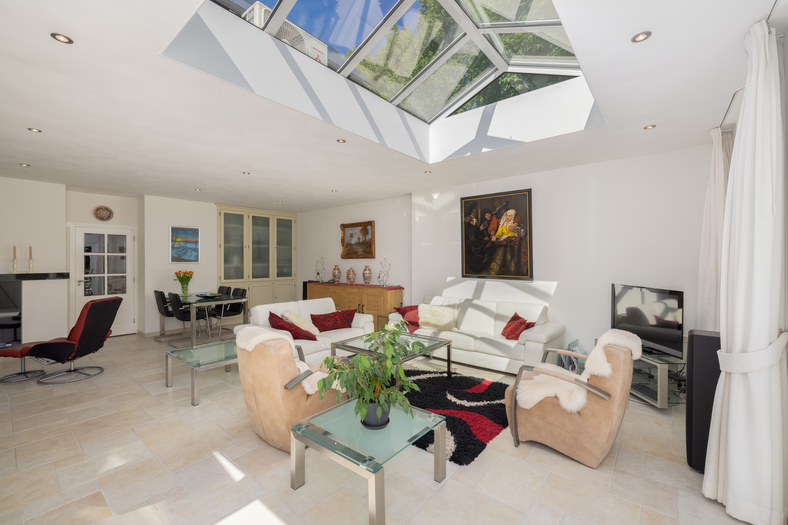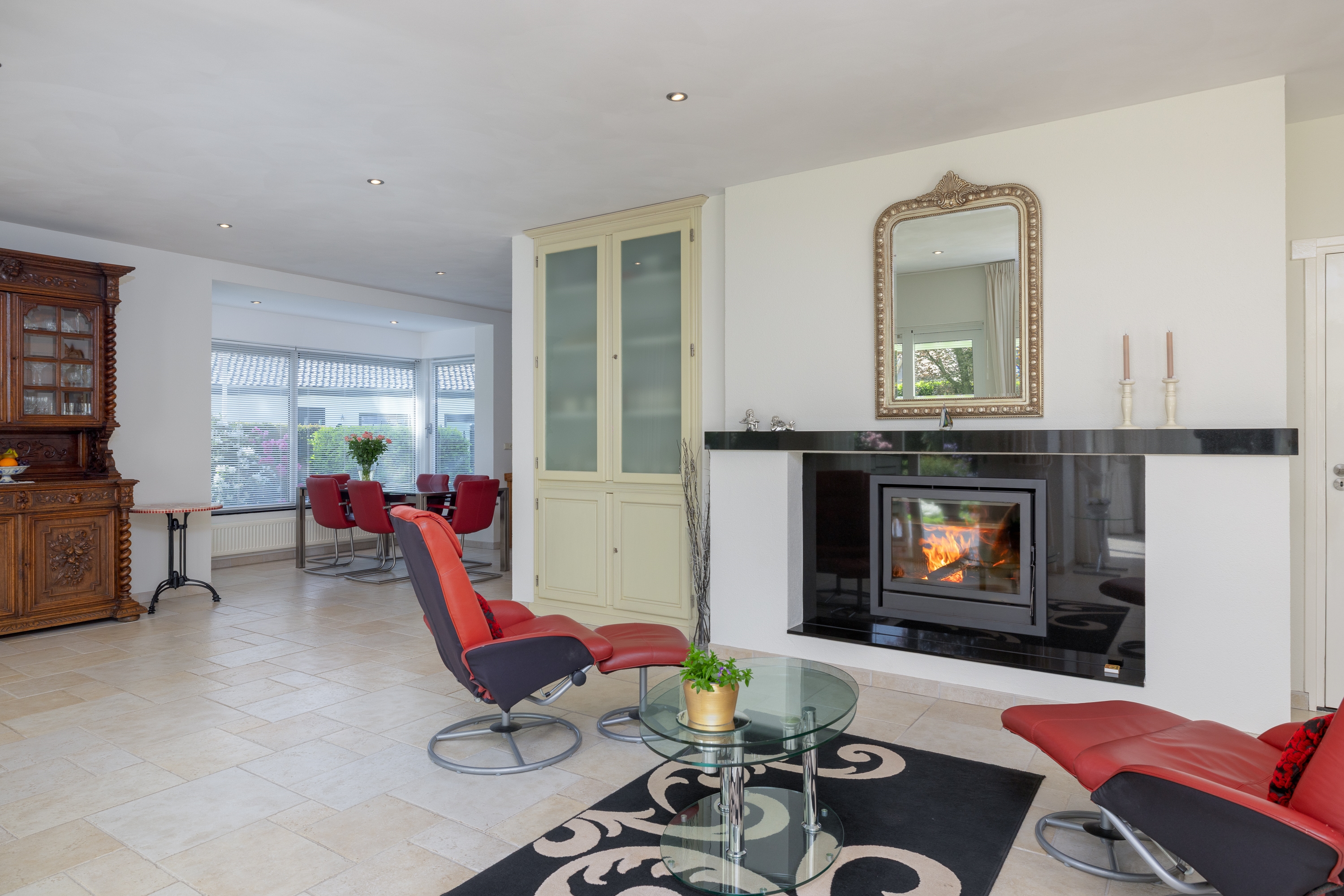 De woonkamer is licht en rustig, voorzien van een lichtstraat en open haard. De leefkeuken beschikt over een Boretti gasfornuis, granieten werkblad en vloerverwarming. Op de begane grond bevinden zich meerdere multifunctionele ruimtes, geschikt voor werken aan huis of extra slaapvertrekken.