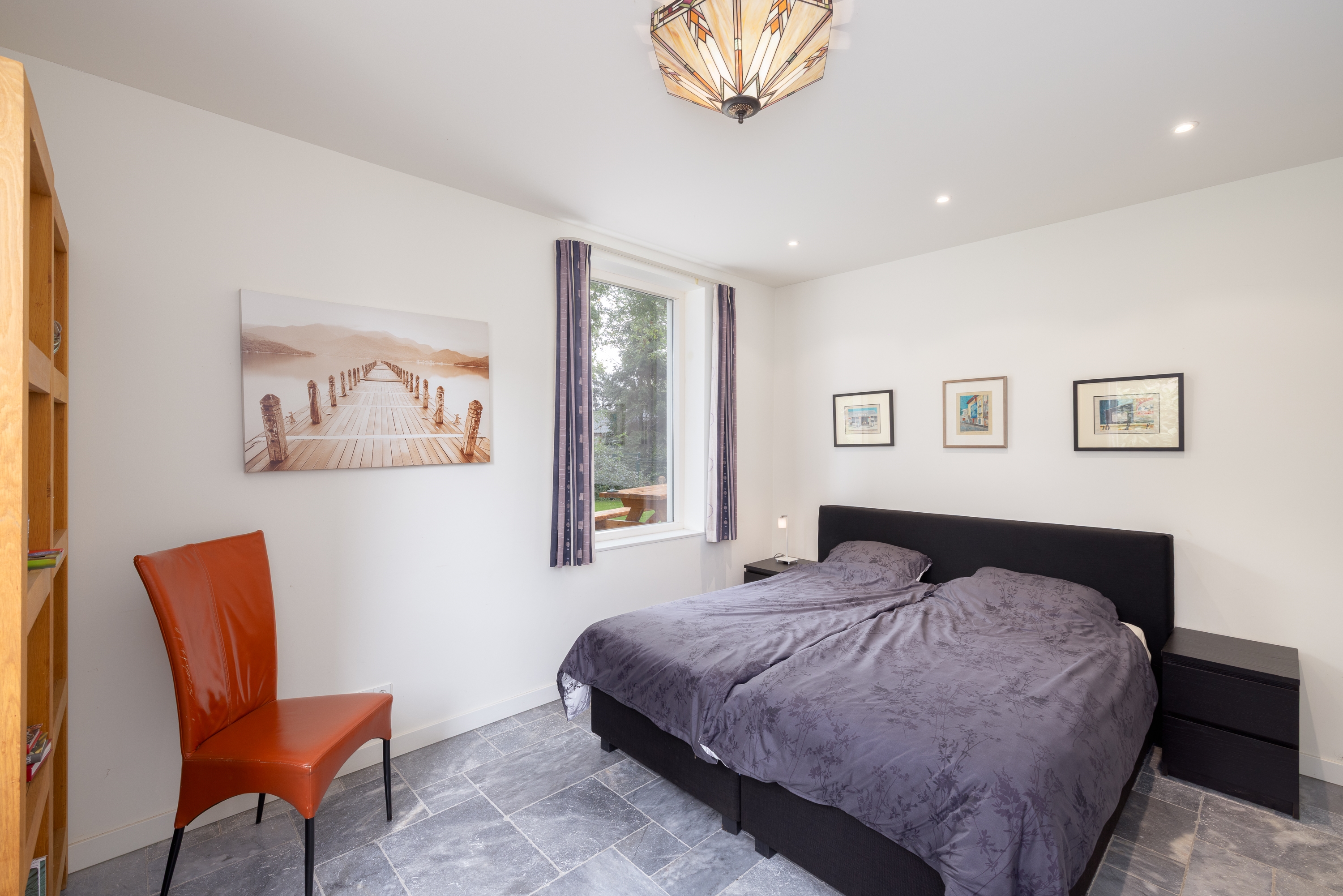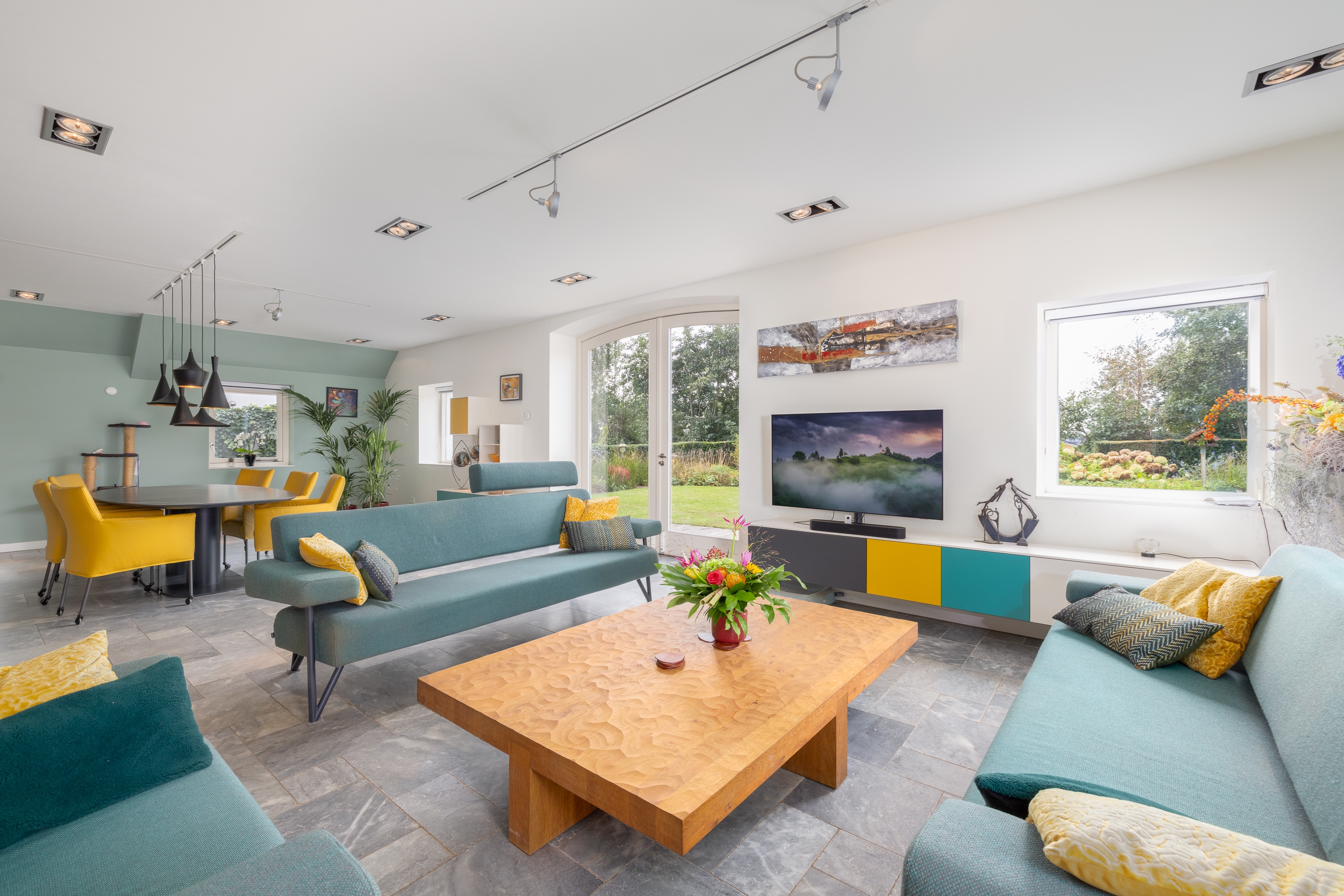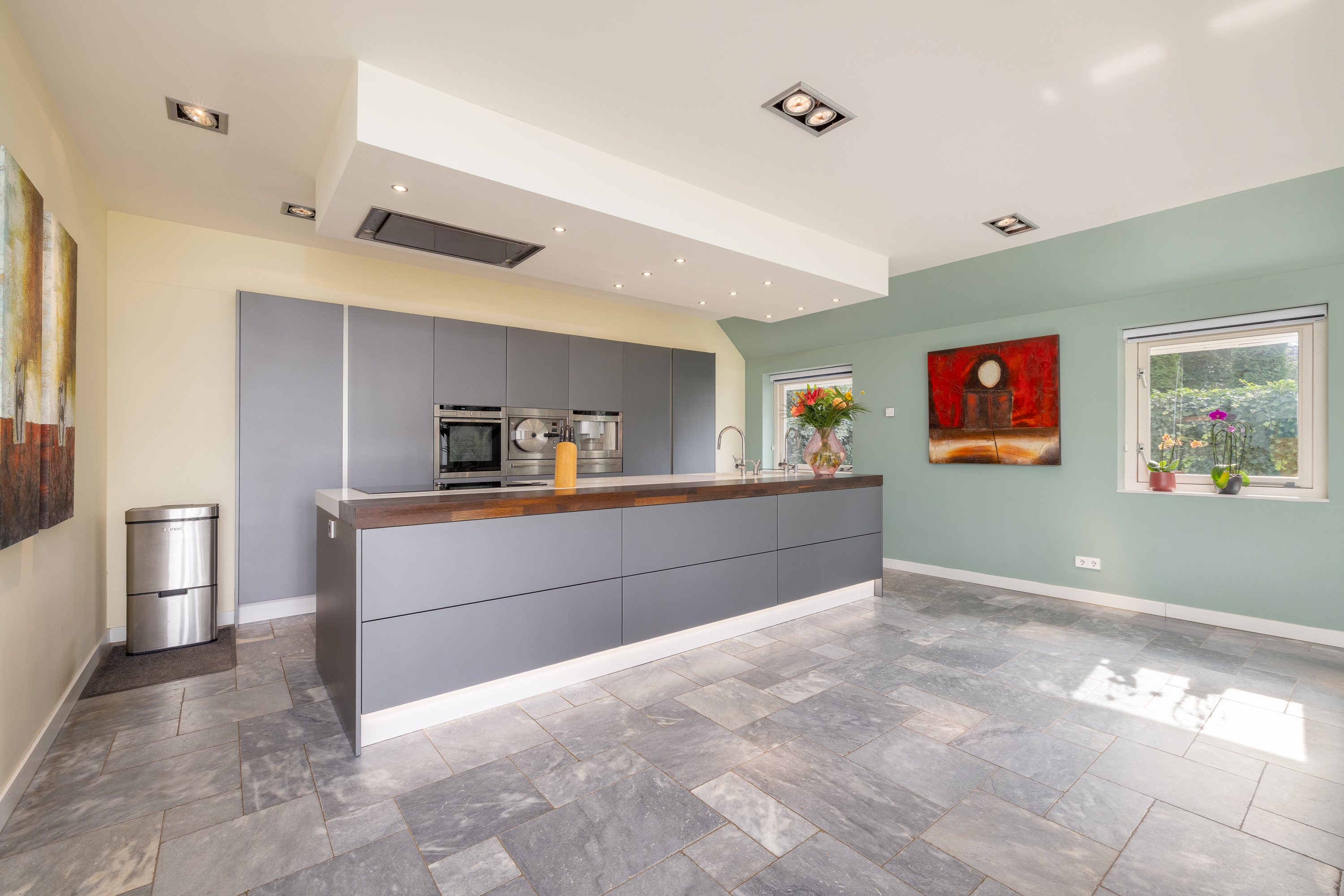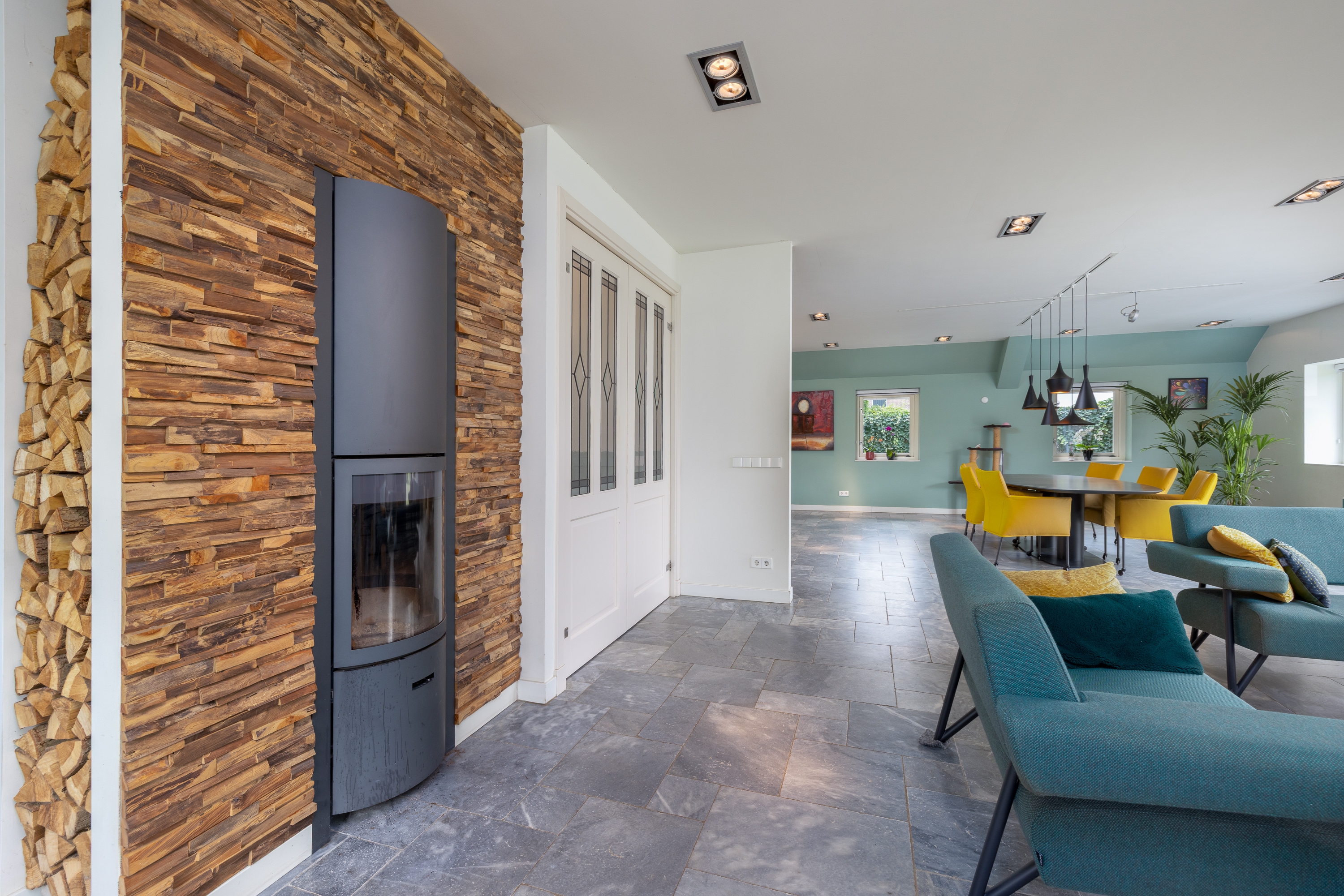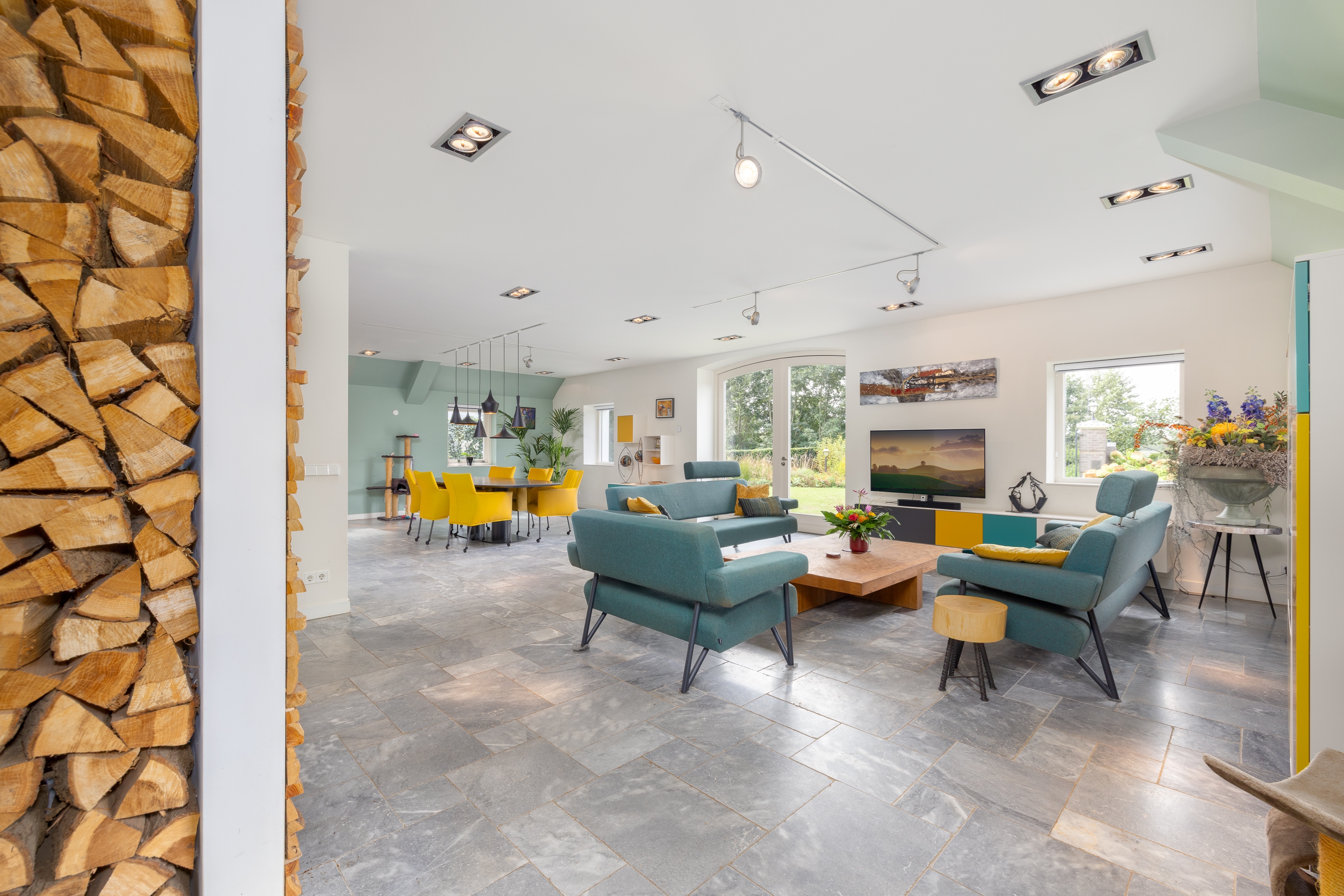 De lichte living met meerdere zithoeken, grote raampartijen en openslaande deuren naar de tuin vormt het hart van het huis. Hier geniet u van een vrij uitzicht over het omliggende groen. De natuurstenen vloer met vloerverwarming, de moderne houtkachel en het met spots geïntegreerde plafond creëren een perfecte balans tussen landelijkheid en moderne elegantie.