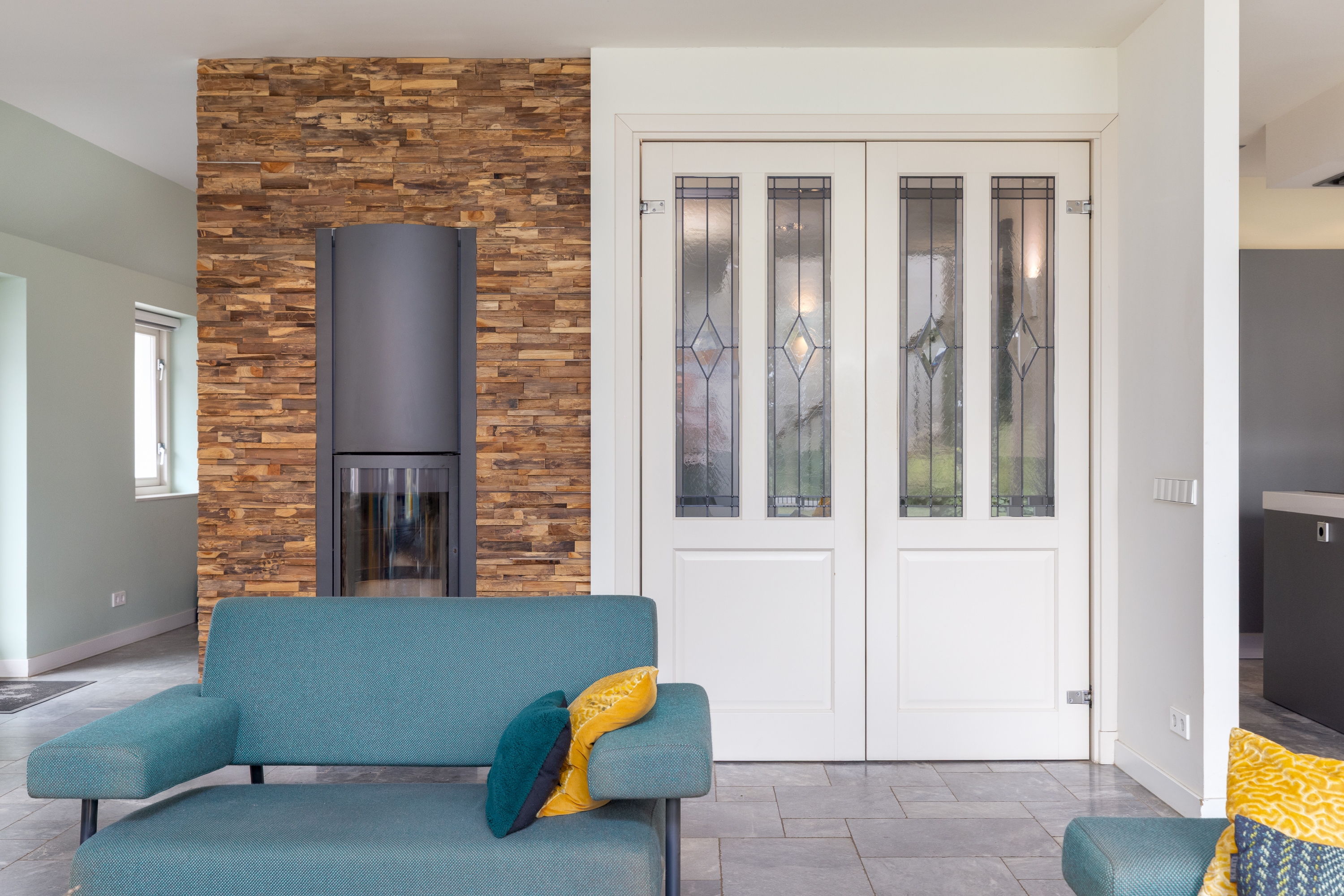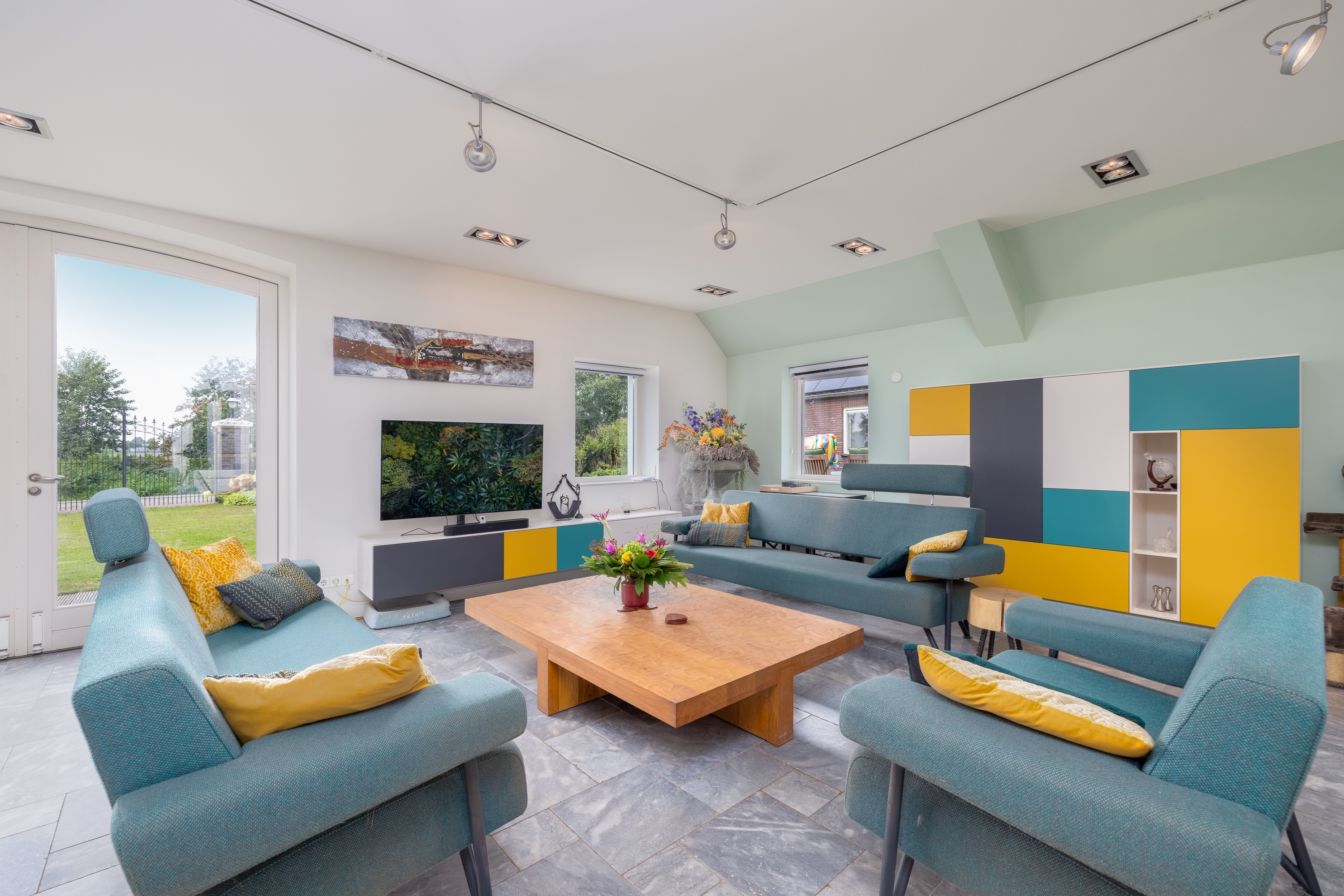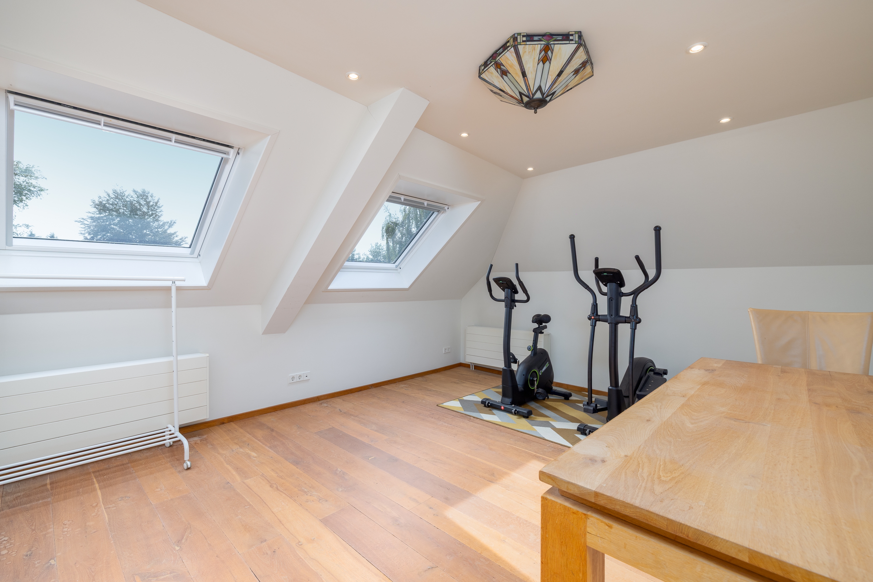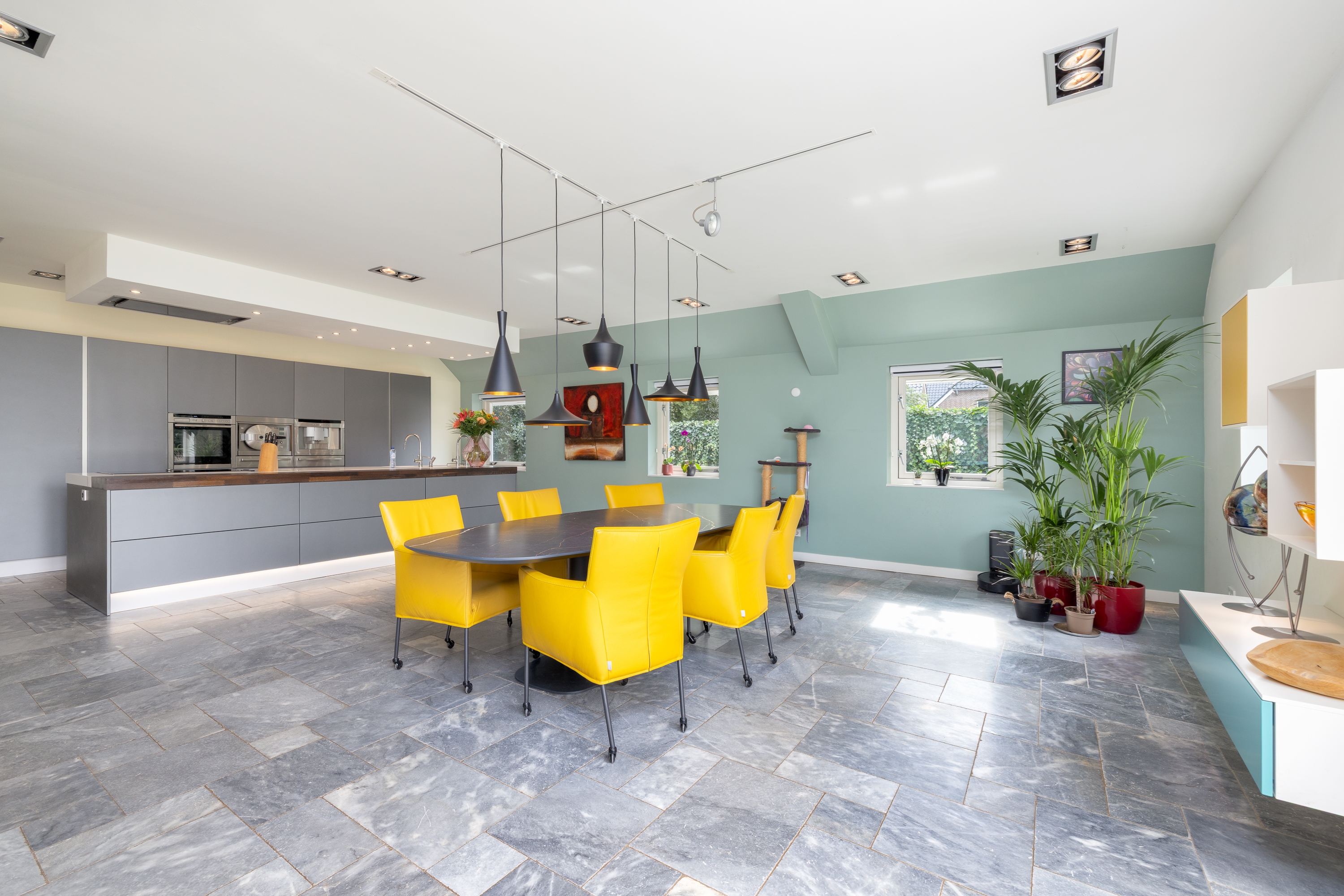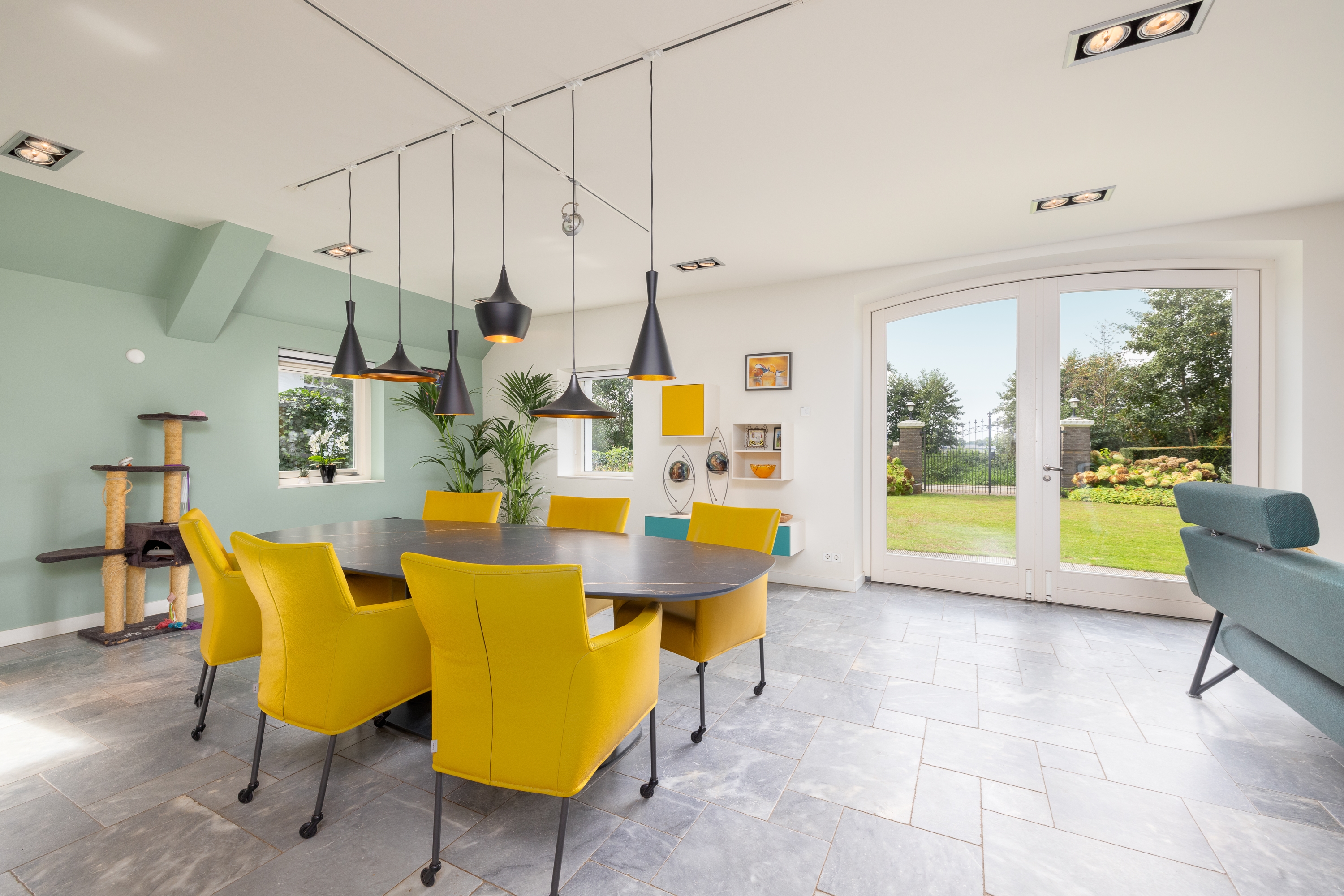 De lichte living met meerdere zithoeken, grote raampartijen en openslaande deuren naar de tuin vormt het hart van het huis. Hier geniet u van een vrij uitzicht over het omliggende groen. De natuurstenen vloer met vloerverwarming, de moderne houtkachel en het met spots geïntegreerde plafond creëren een perfecte balans tussen landelijkheid en moderne elegantie.