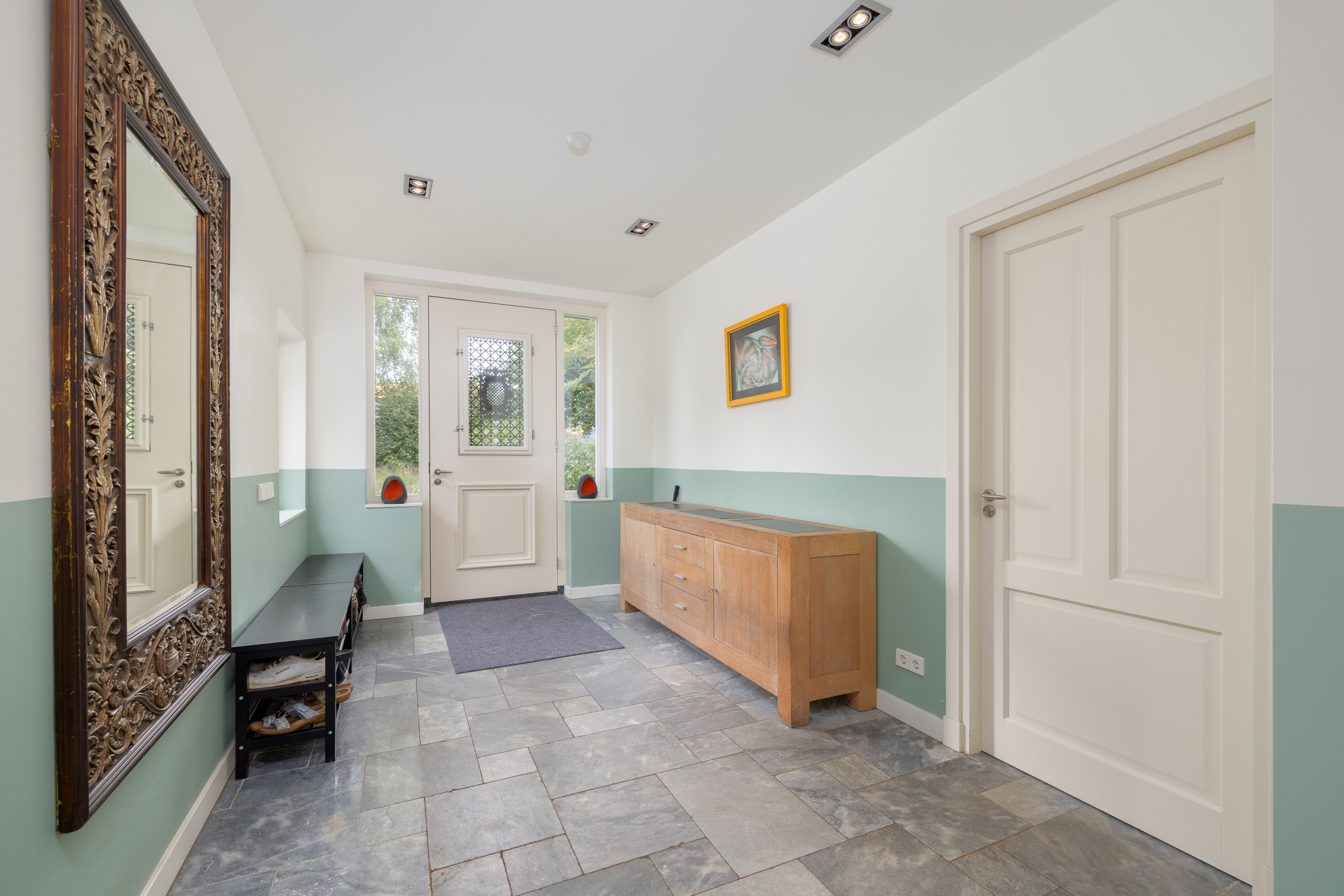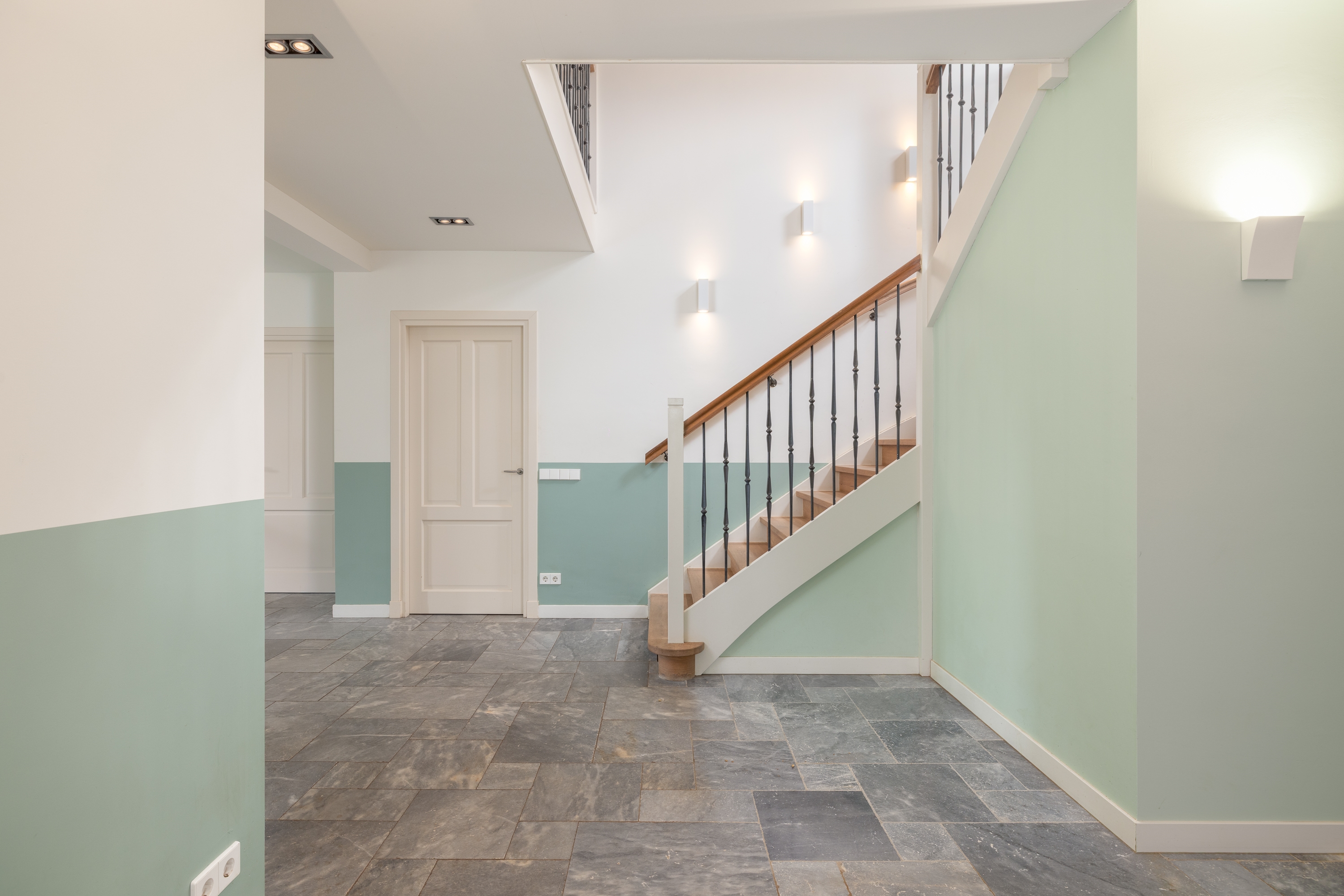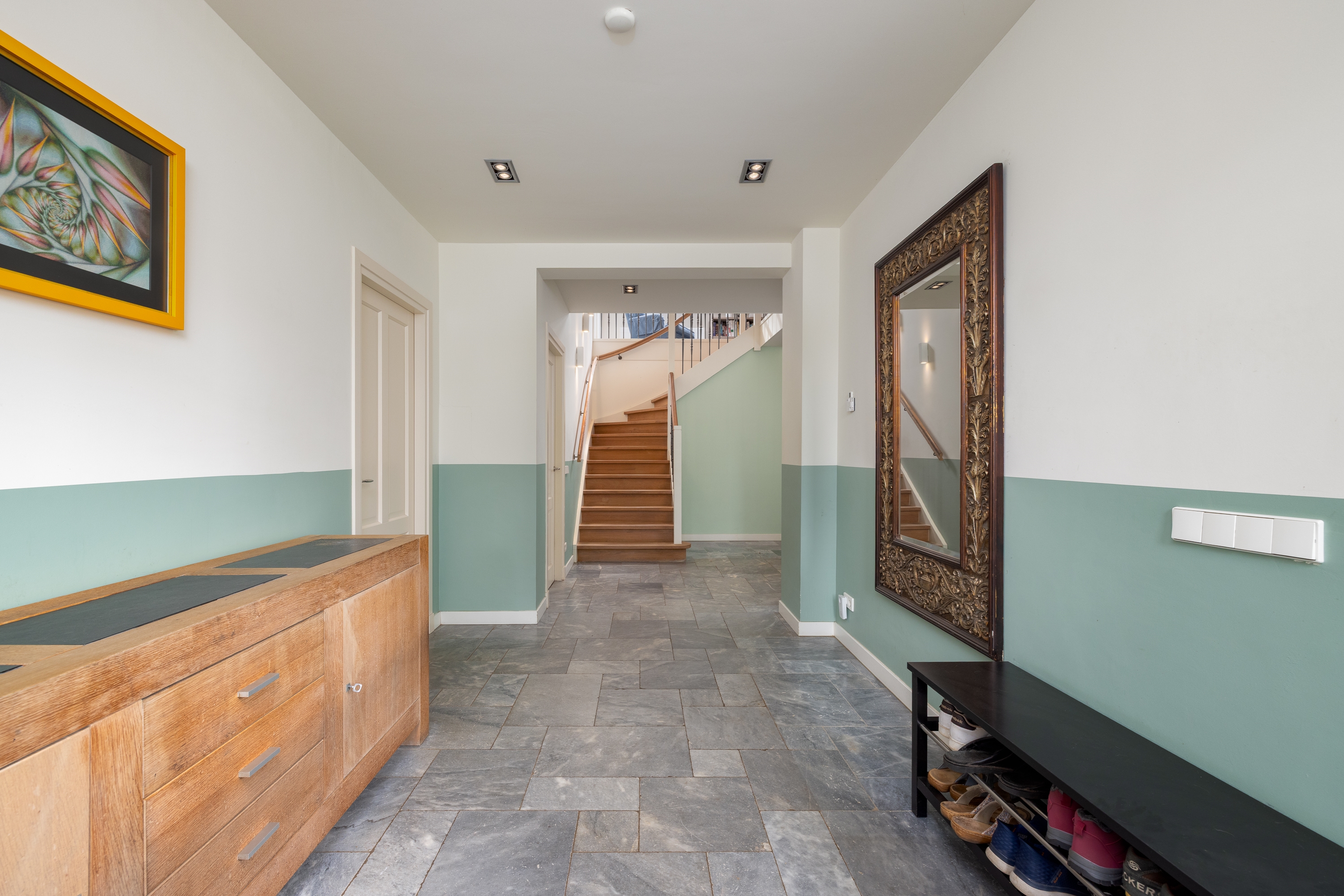 Bij binnenkomst wordt u verwelkomd in een royale entreehal met een open trapopgang. De ruimte baadt in het licht en zet direct de toon voor de rest van de woning: stijlvol, warm en verfijnd.