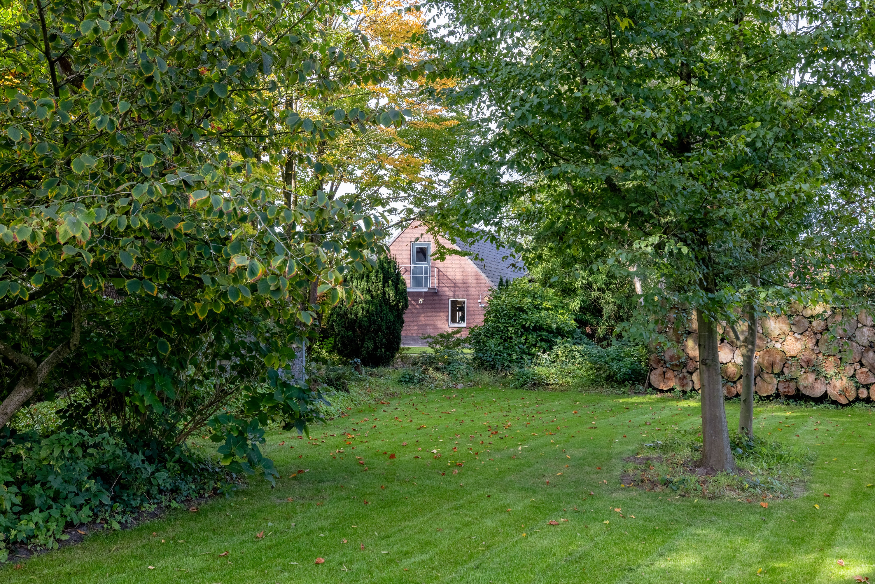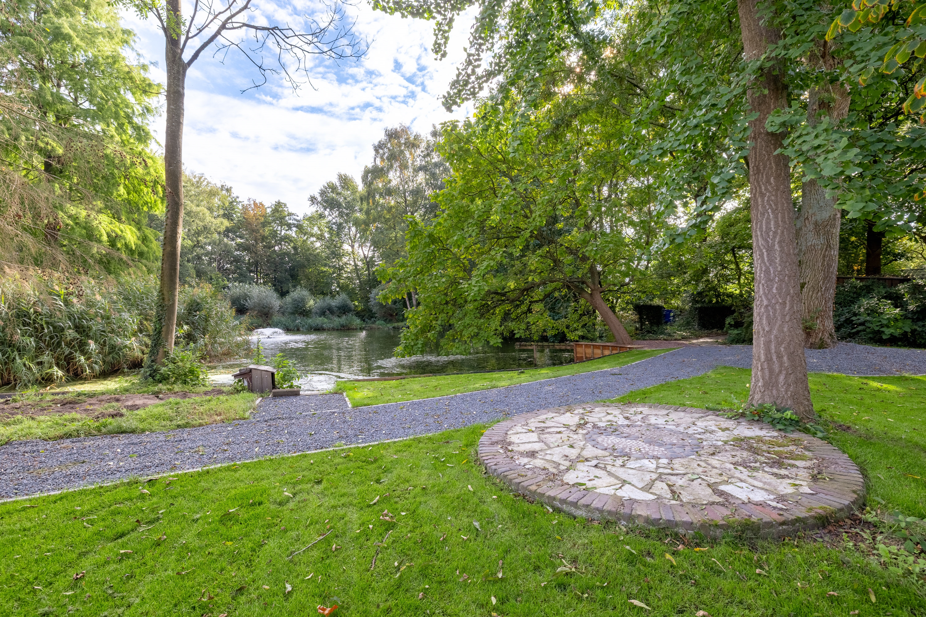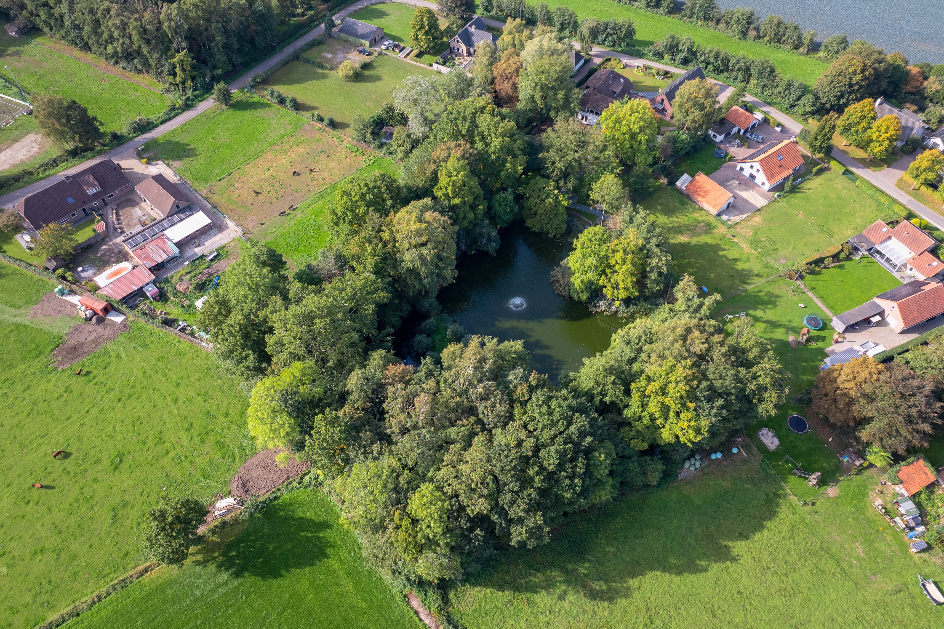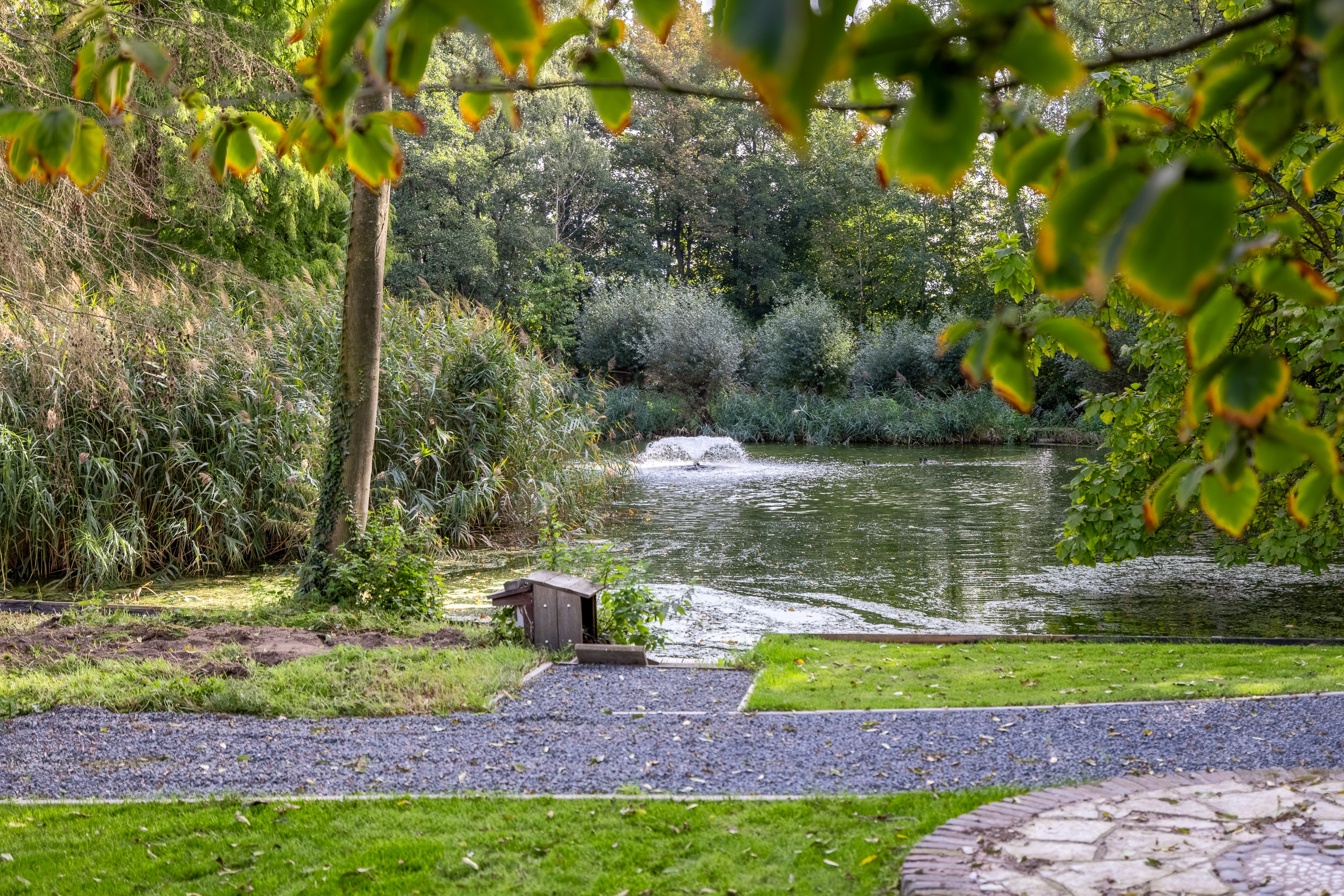 Zodra u het erf betreedt, ervaart u onmiddellijk de rust en ruimte die deze plek zo bijzonder maken. De tuin ontvouwt zich als een parkachtig landschap met glooiende gazons, volwassen bomen en zorgvuldig geplaatste beplanting die het geheel een natuurlijke elegantie geven. Achter op het perceel ligt een vijver met fontein, omringd door houten steigers en een karakteristieke ijsvogelmuur een zeldzaam stukje natuurbeleving in eigen tuin. Hier luistert u naar het zachte kabbelende water, het gefluit van vogels en voelt u de serene stilte van het buitenleven alsof u midden in een privépark verblijft.
