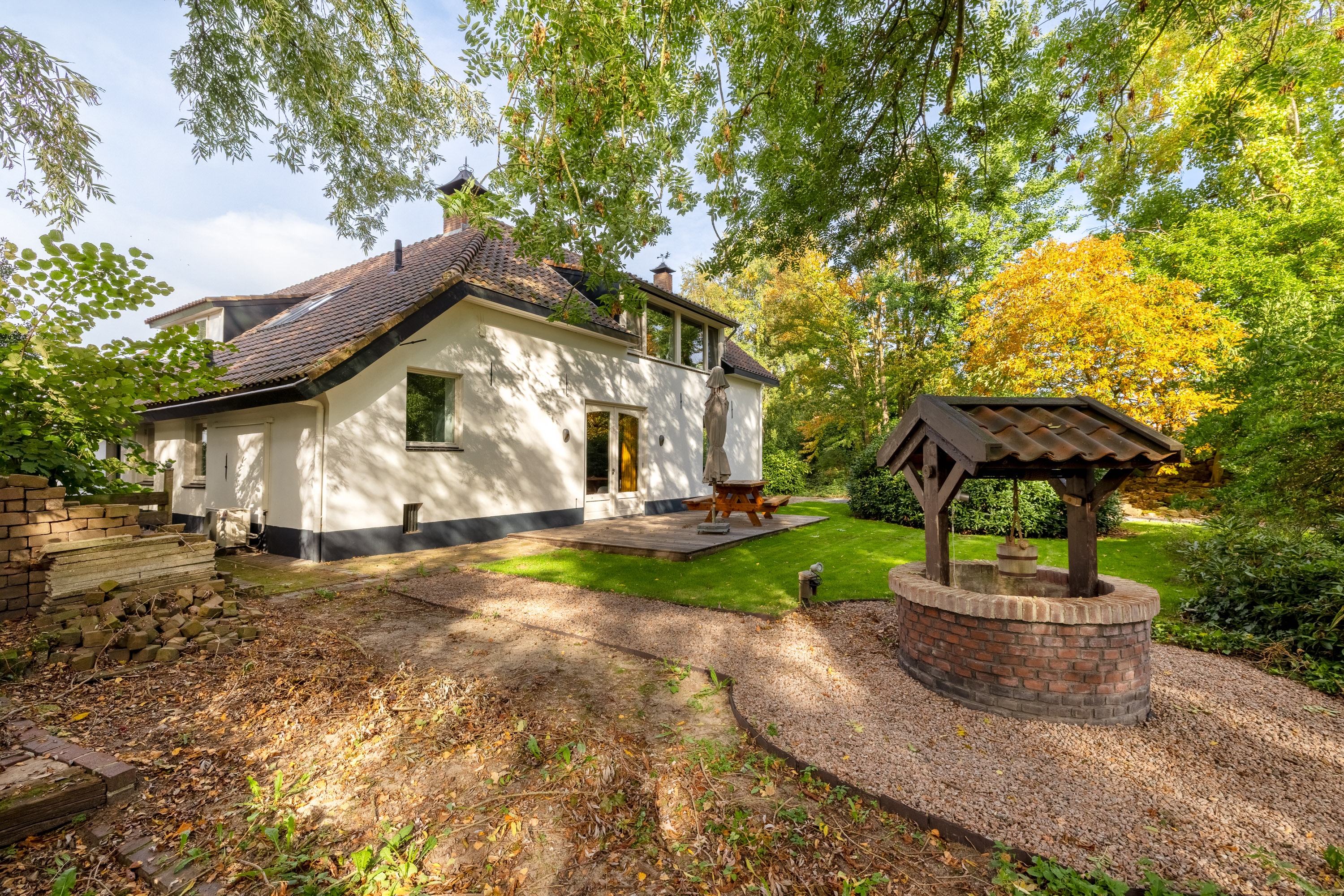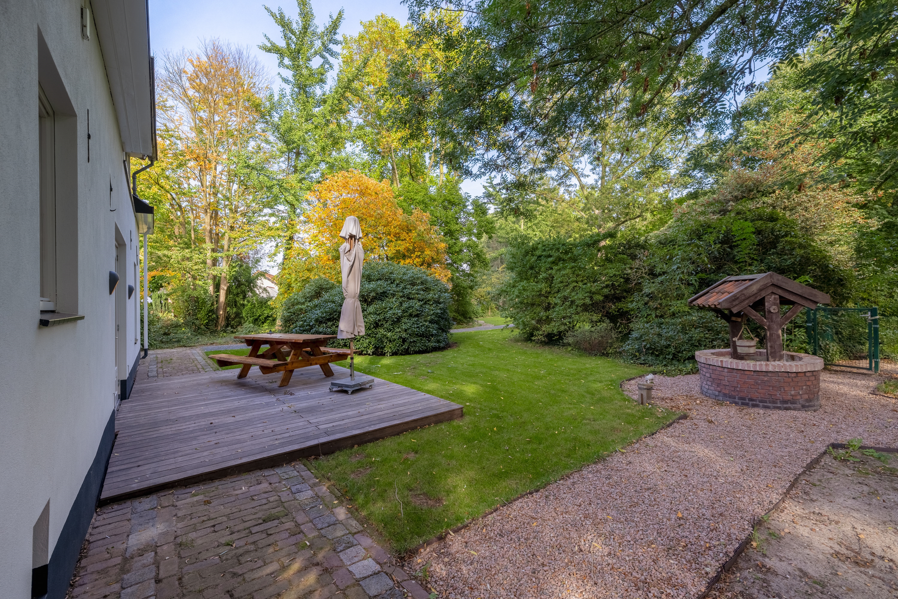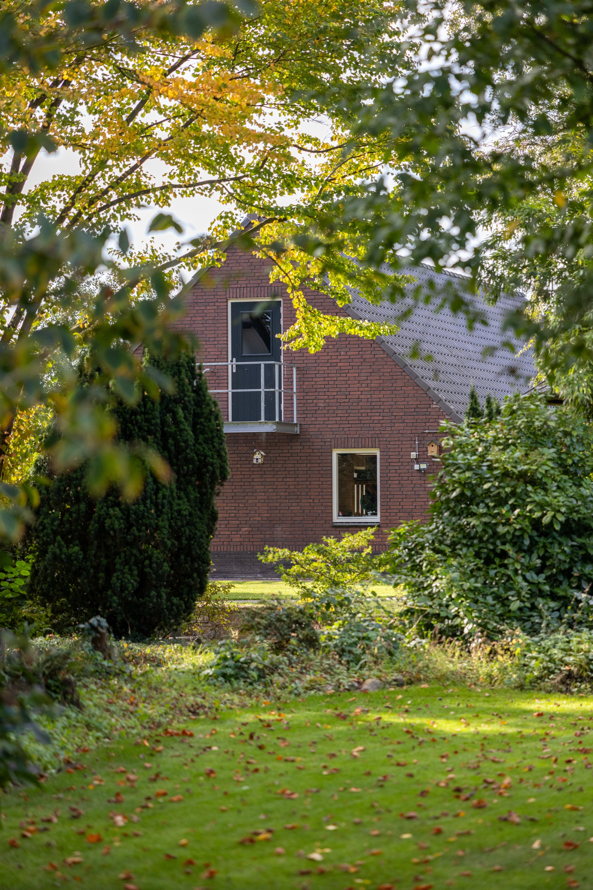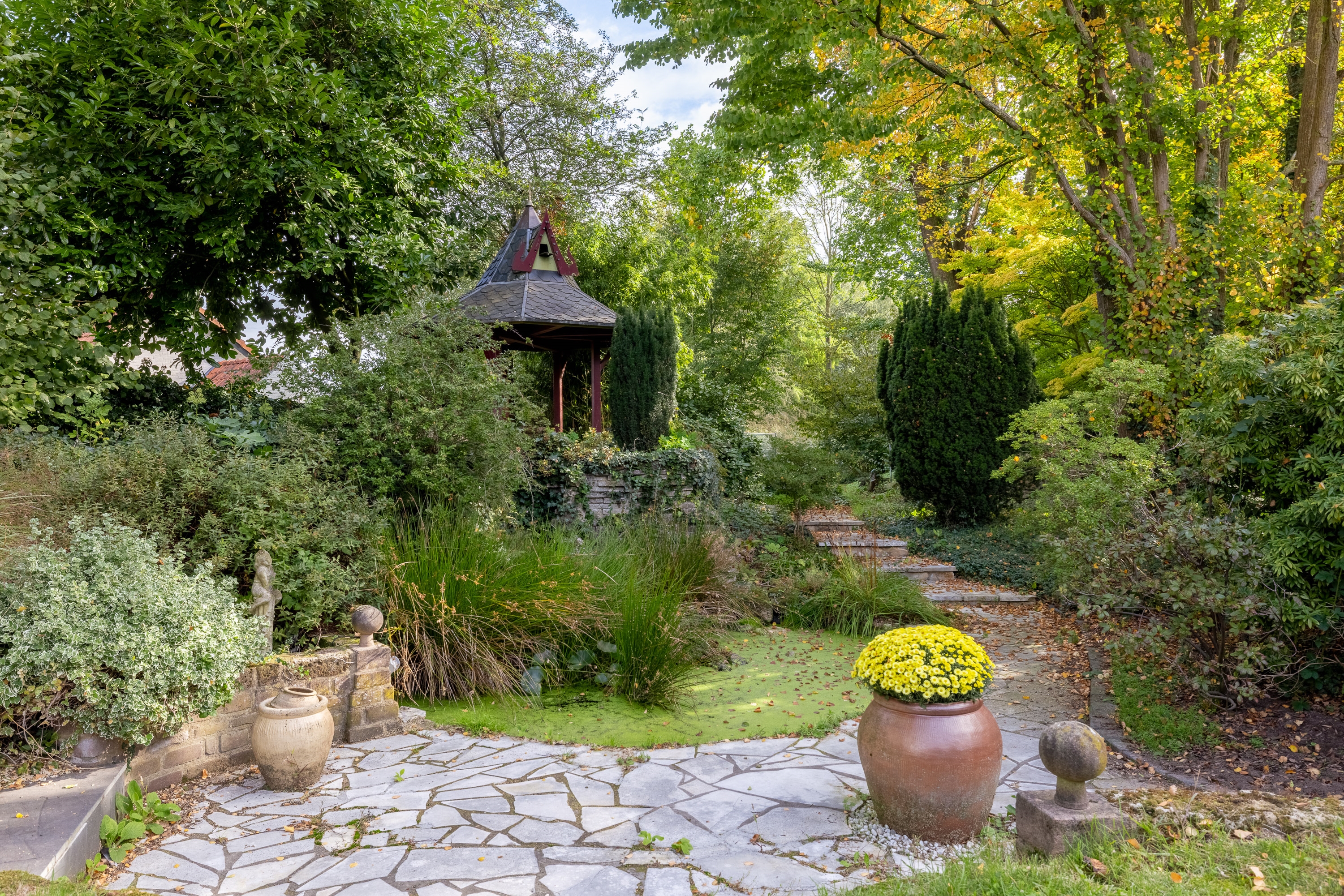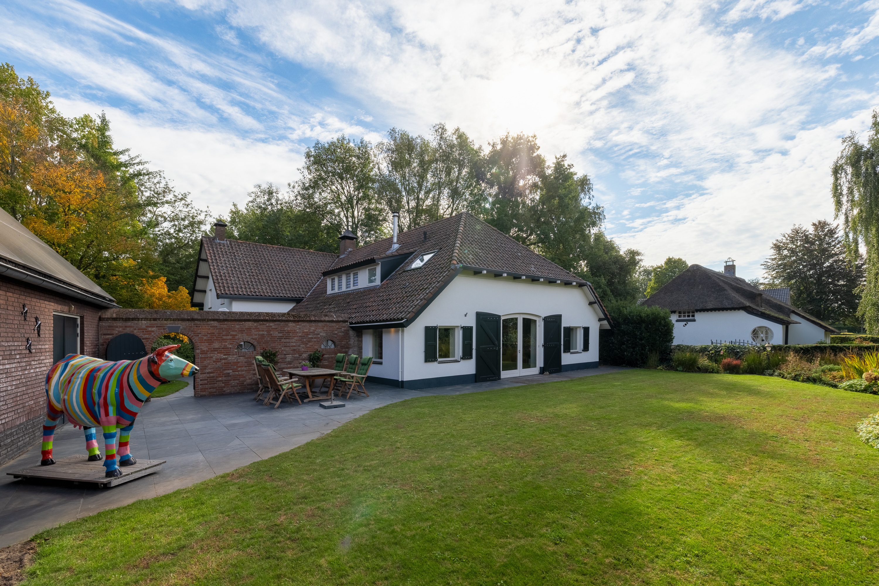 Zodra u het erf betreedt, ervaart u onmiddellijk de rust en ruimte die deze plek zo bijzonder maken. De tuin ontvouwt zich als een parkachtig landschap met glooiende gazons, volwassen bomen en zorgvuldig geplaatste beplanting die het geheel een natuurlijke elegantie geven. Achter op het perceel ligt een vijver met fontein, omringd door houten steigers en een karakteristieke ijsvogelmuur een zeldzaam stukje natuurbeleving in eigen tuin. Hier luistert u naar het zachte kabbelende water, het gefluit van vogels en voelt u de serene stilte van het buitenleven alsof u midden in een privépark verblijft.