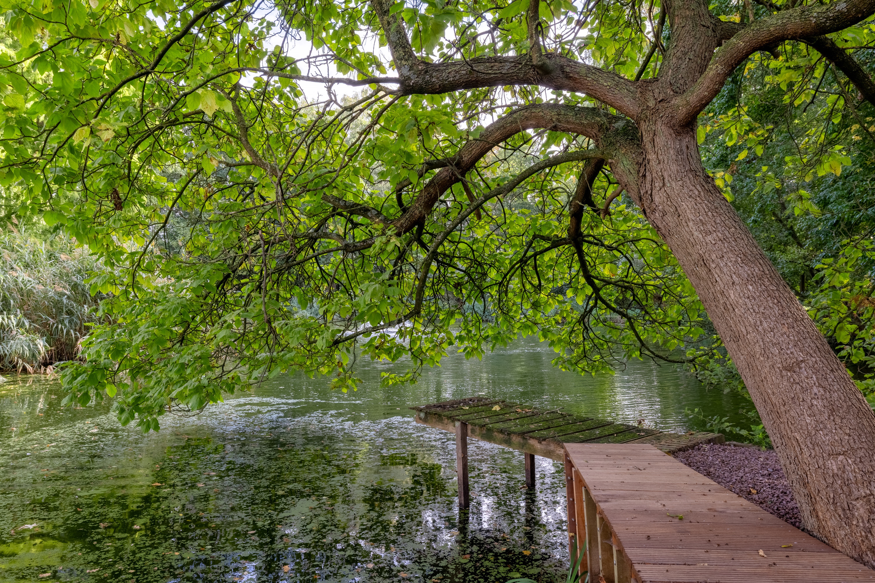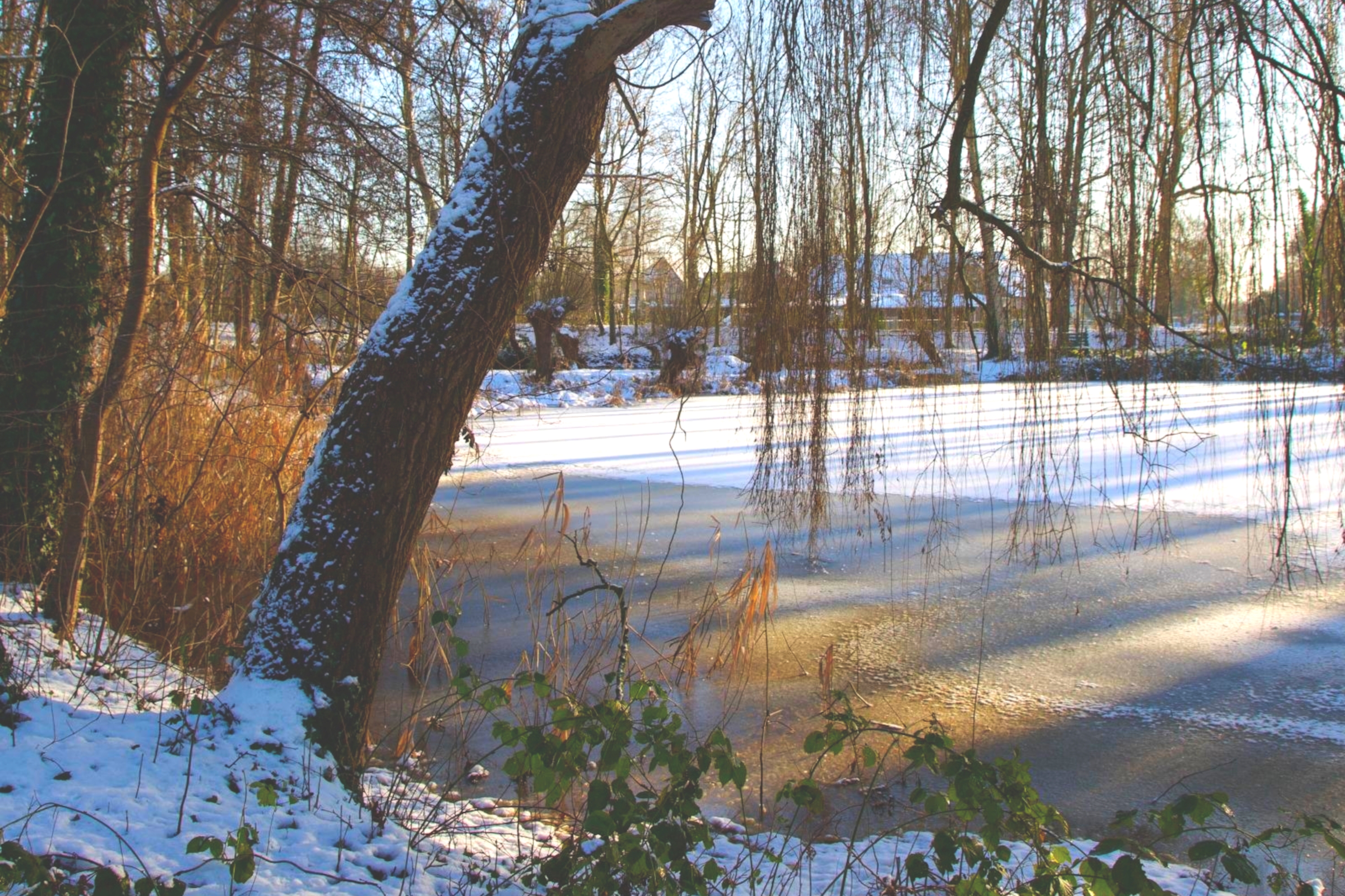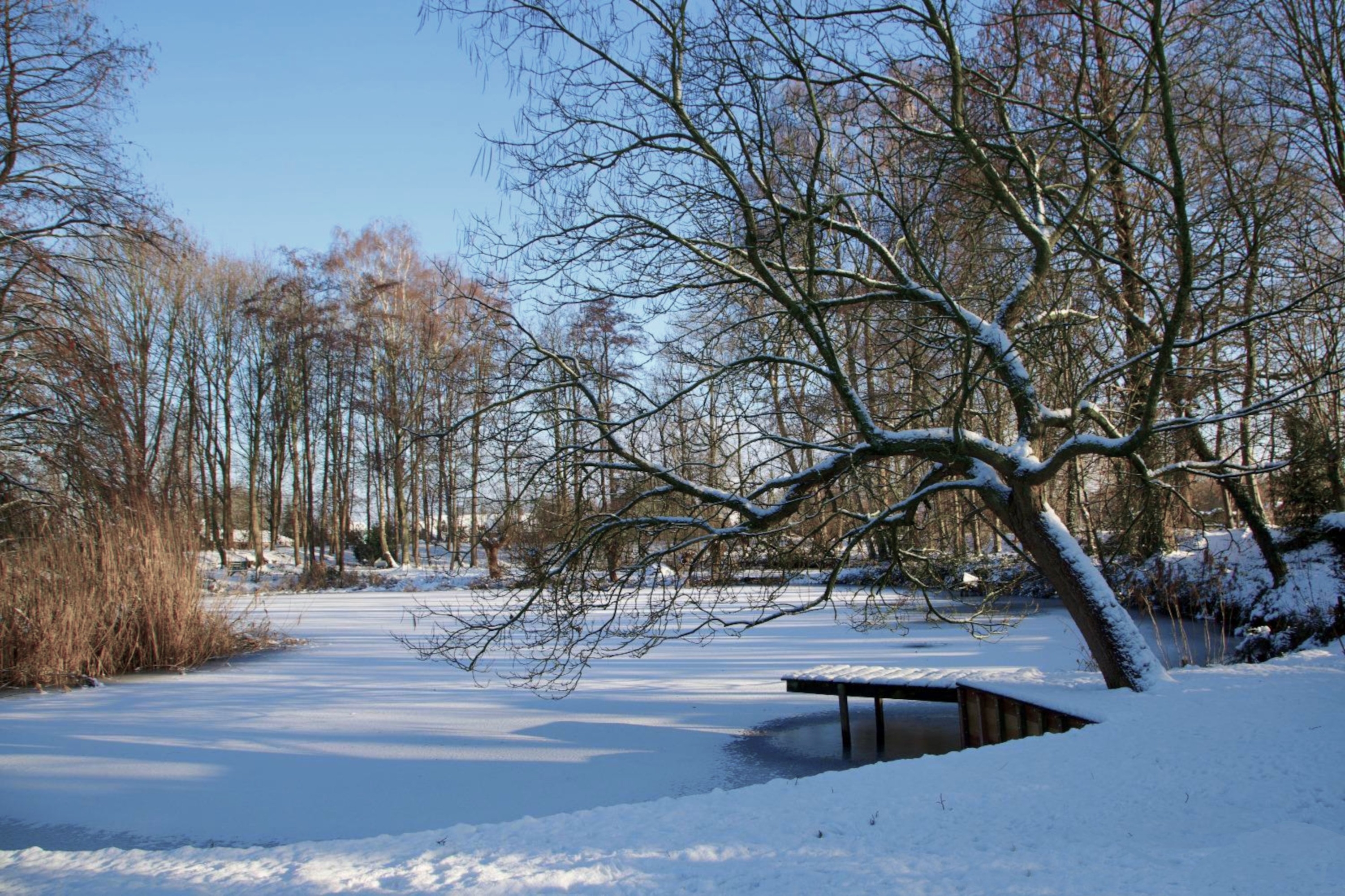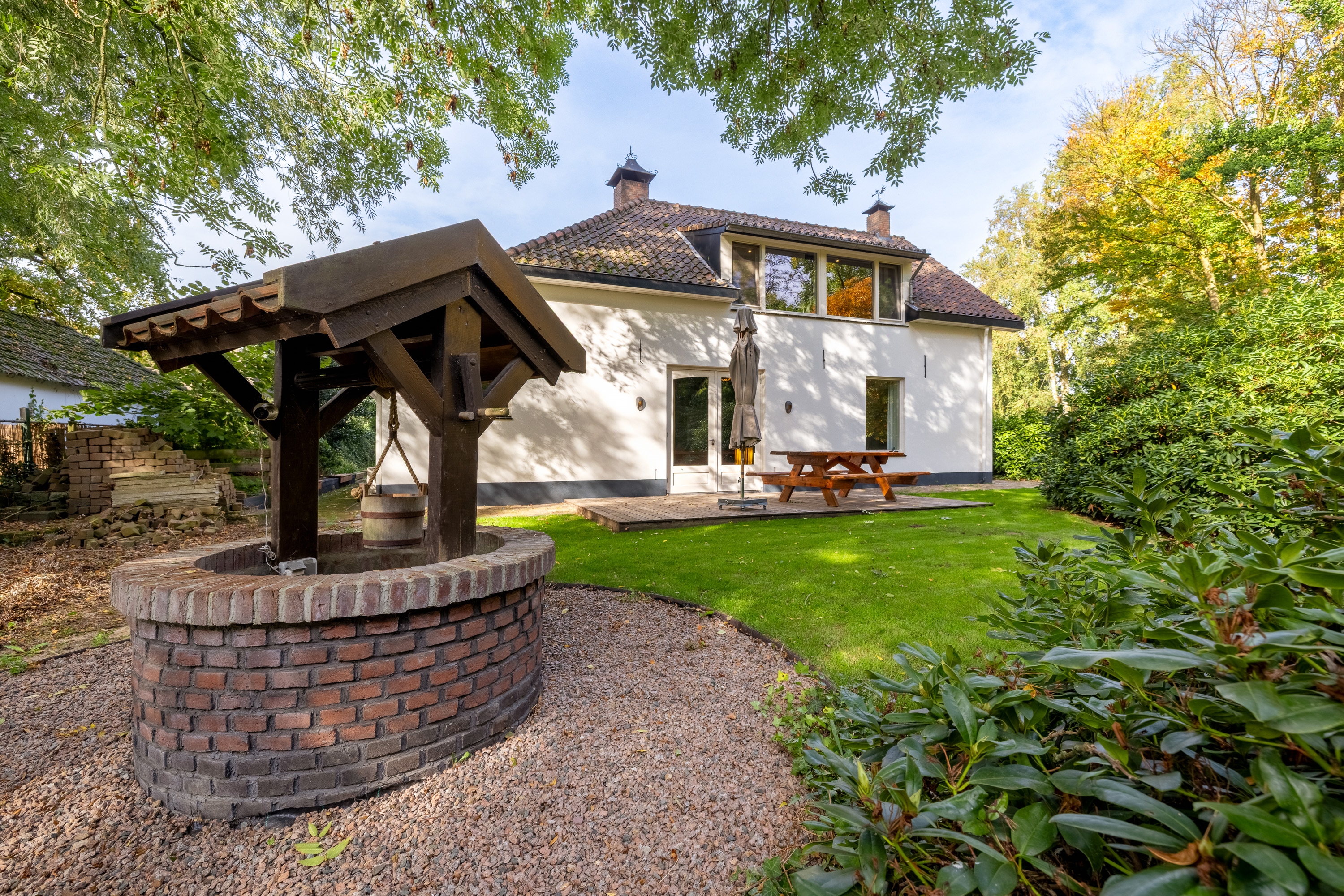 Zodra u het erf betreedt, ervaart u onmiddellijk de rust en ruimte die deze plek zo bijzonder maken. De tuin ontvouwt zich als een parkachtig landschap met glooiende gazons, volwassen bomen en zorgvuldig geplaatste beplanting die het geheel een natuurlijke elegantie geven. Achter op het perceel ligt een vijver met fontein, omringd door houten steigers en een karakteristieke ijsvogelmuur een zeldzaam stukje natuurbeleving in eigen tuin. Hier luistert u naar het zachte kabbelende water, het gefluit van vogels en voelt u de serene stilte van het buitenleven alsof u midden in een privépark verblijft.