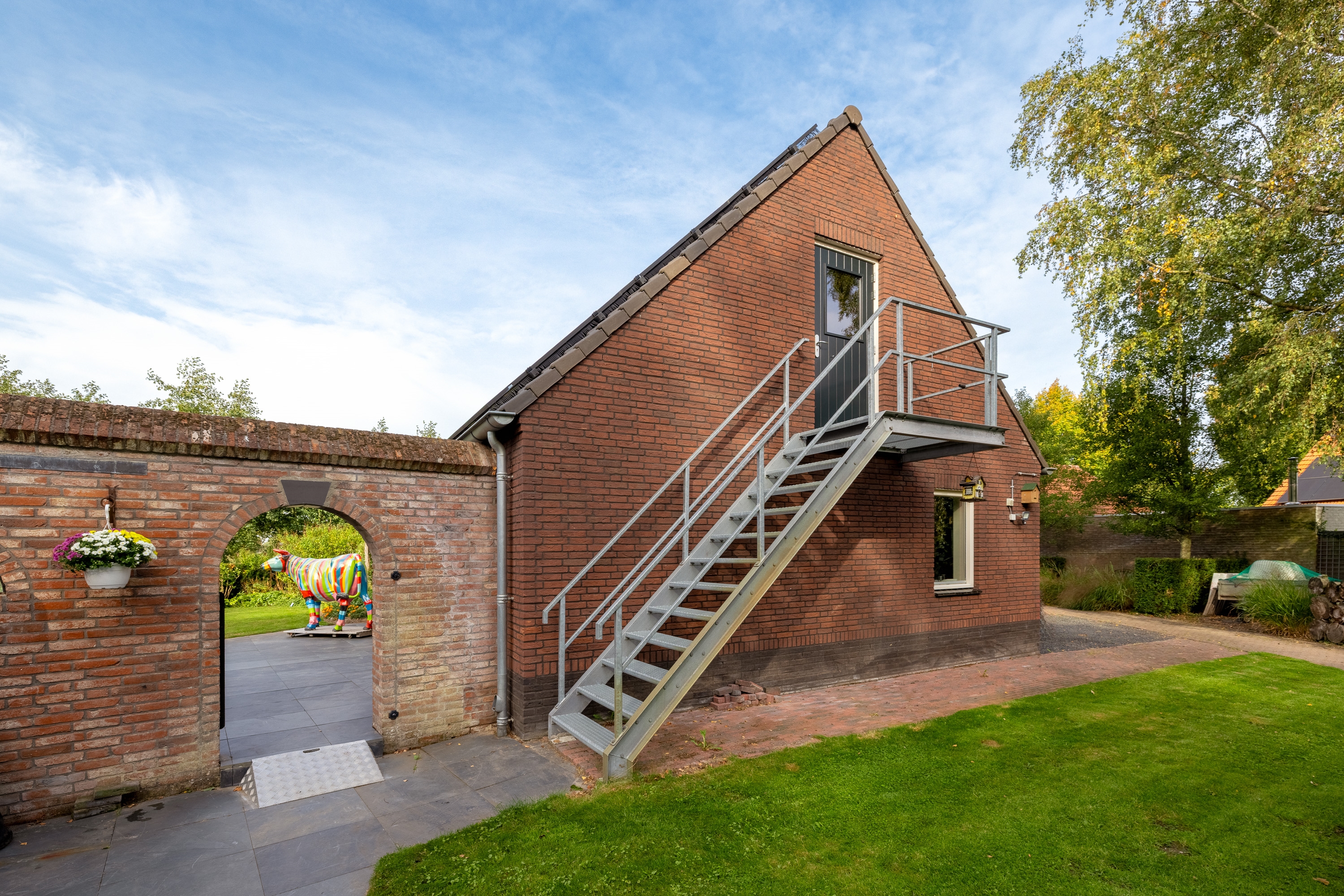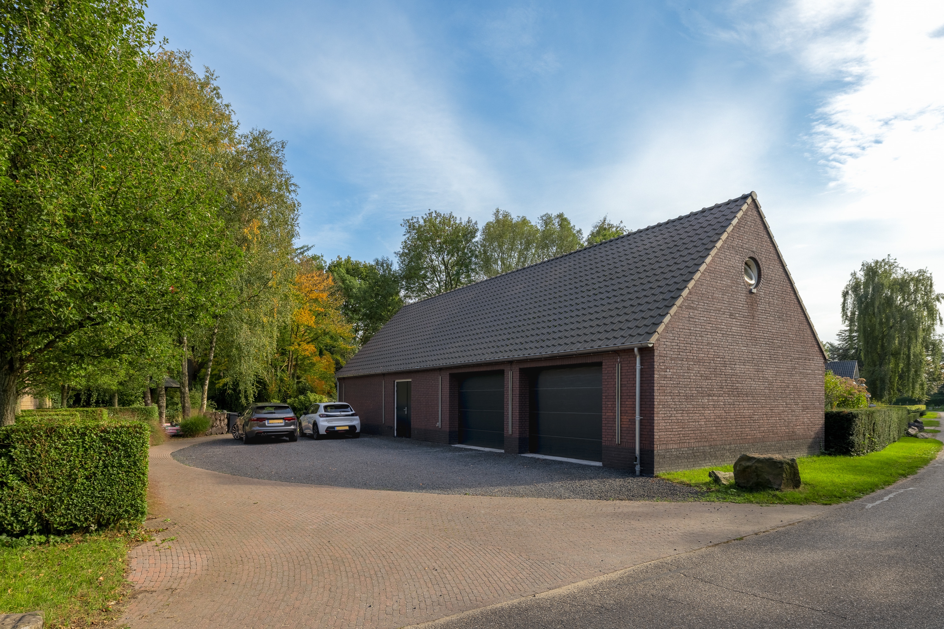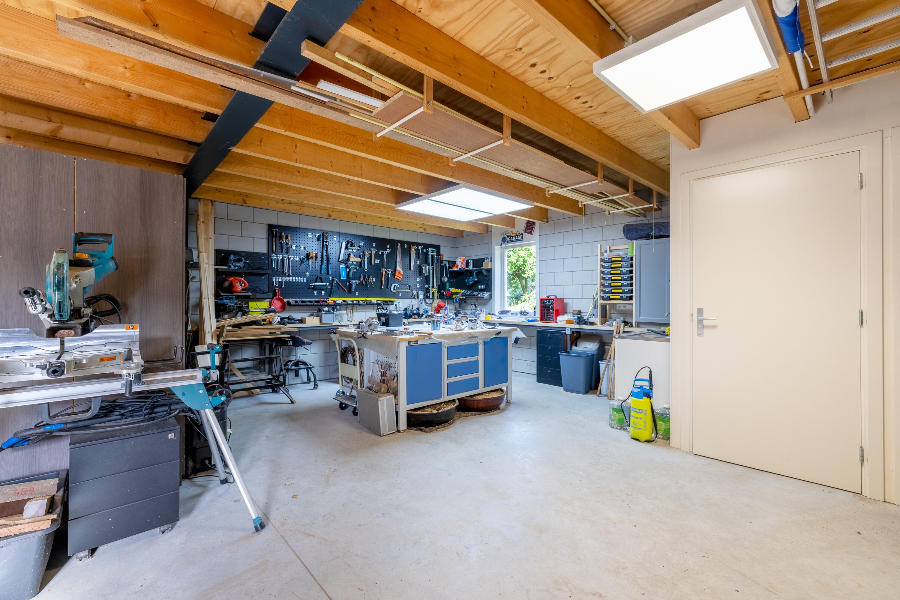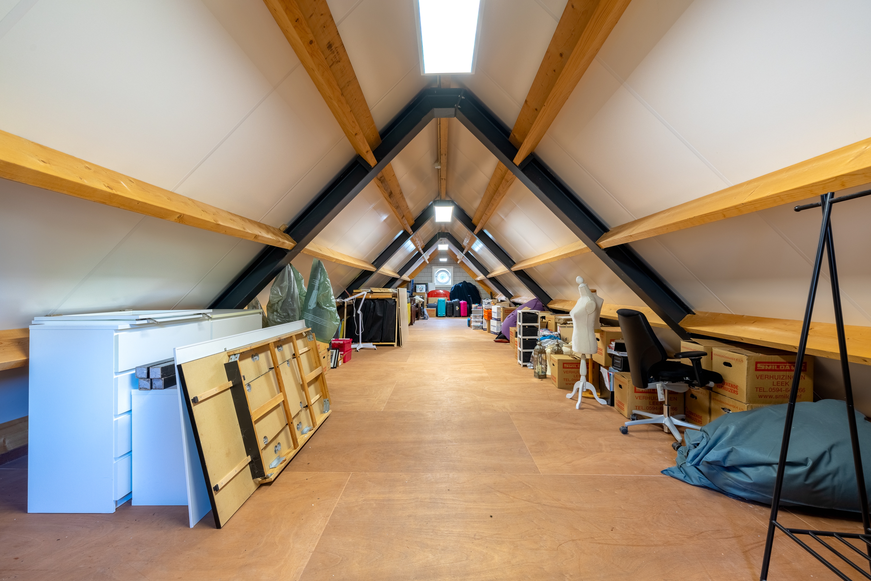Schuur & garage De vrijstaande schuur en luxe garage zijn in stijl, maatvoering en afwerkingsniveau volledig afgestemd op de woonboerderij. Daardoor ogen ze niet als bijgebouwen, maar als een vanzelfsprekende uitbreiding van het geheel zowel esthetisch als functioneel. Het gebouw is hoogwaardig gebouwd, volledig geïsoleerd en voorzien van eigen sanitair en een ruime werkplaats. Boven de werkruimte bevindt zich een ruime bergzolder, bereikbaar via een buitentrap. Deze praktische indeling maakt het eenvoudig om de volledige hoogte van de schuur te benutten en grotere spullen, zoals loungesets of seizoensmeubilair, comfortabel op te bergen. De uitstraling en afwerking sluiten naadloos aan bij de woning, waardoor het geheel één harmonieus en exclusief ensemble vormt.