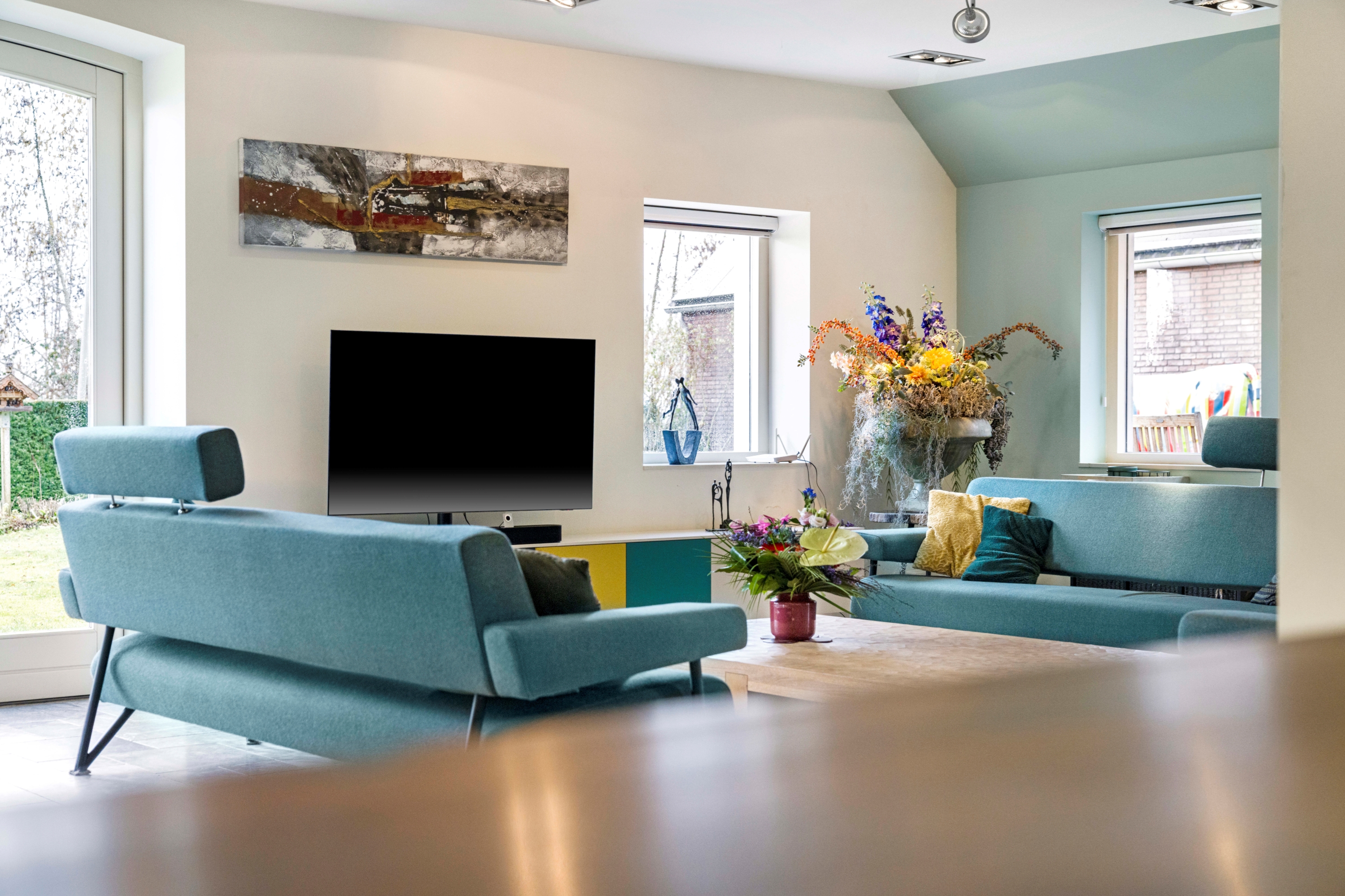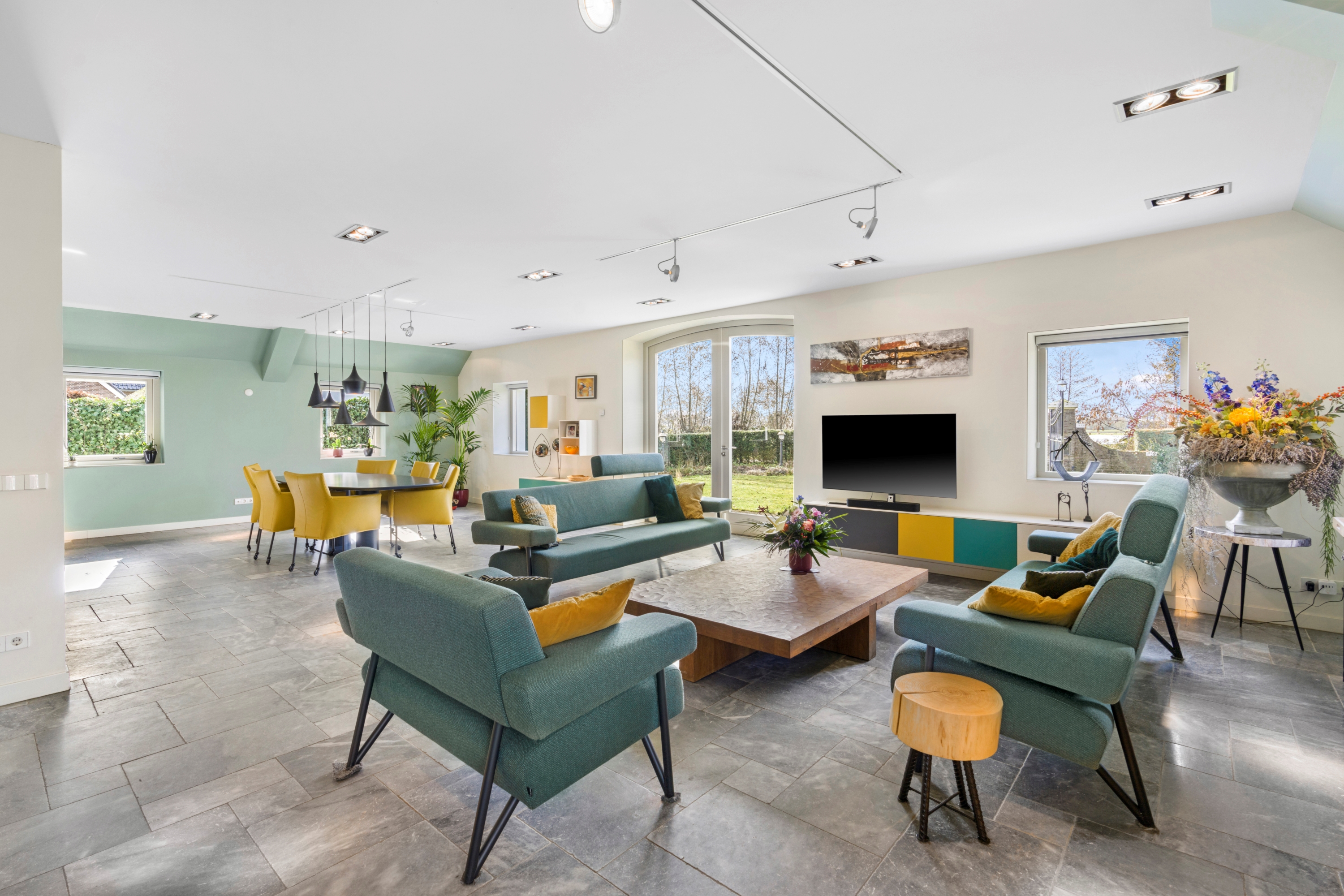 De ruime living met meerdere zithoeken beschikt over grote raampartijen en openslaande deuren naar de tuin, waardoor binnen en buiten naadloos in elkaar overlopen. Vanuit de woonkamer geniet u van een vrij uitzicht over het omliggende groen.