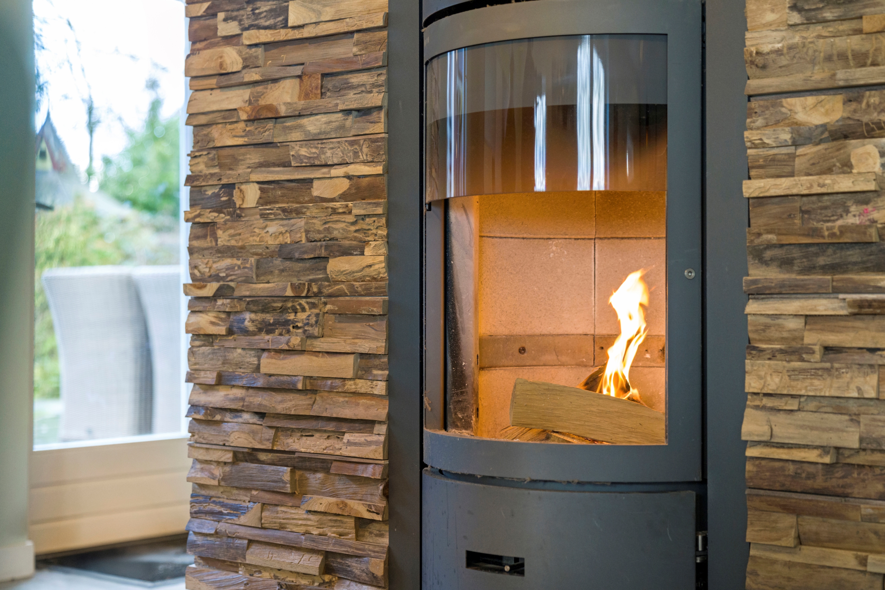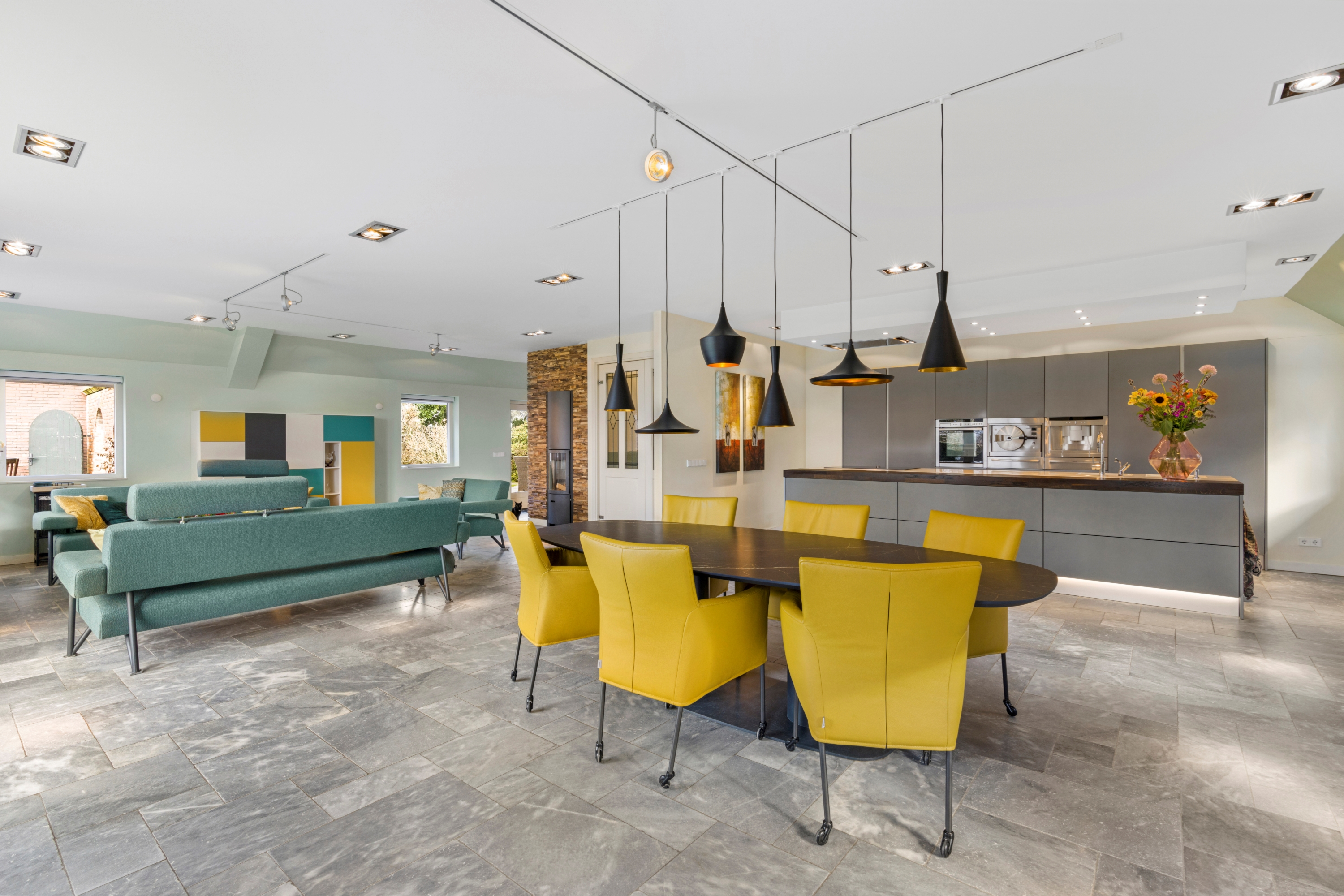 De natuurstenen vloer met vloerverwarming, een moderne houtkachel en een strak plafond met geïntegreerde verlichting zorgen voor een perfecte balans tussen landelijke charme en moderne luxe.