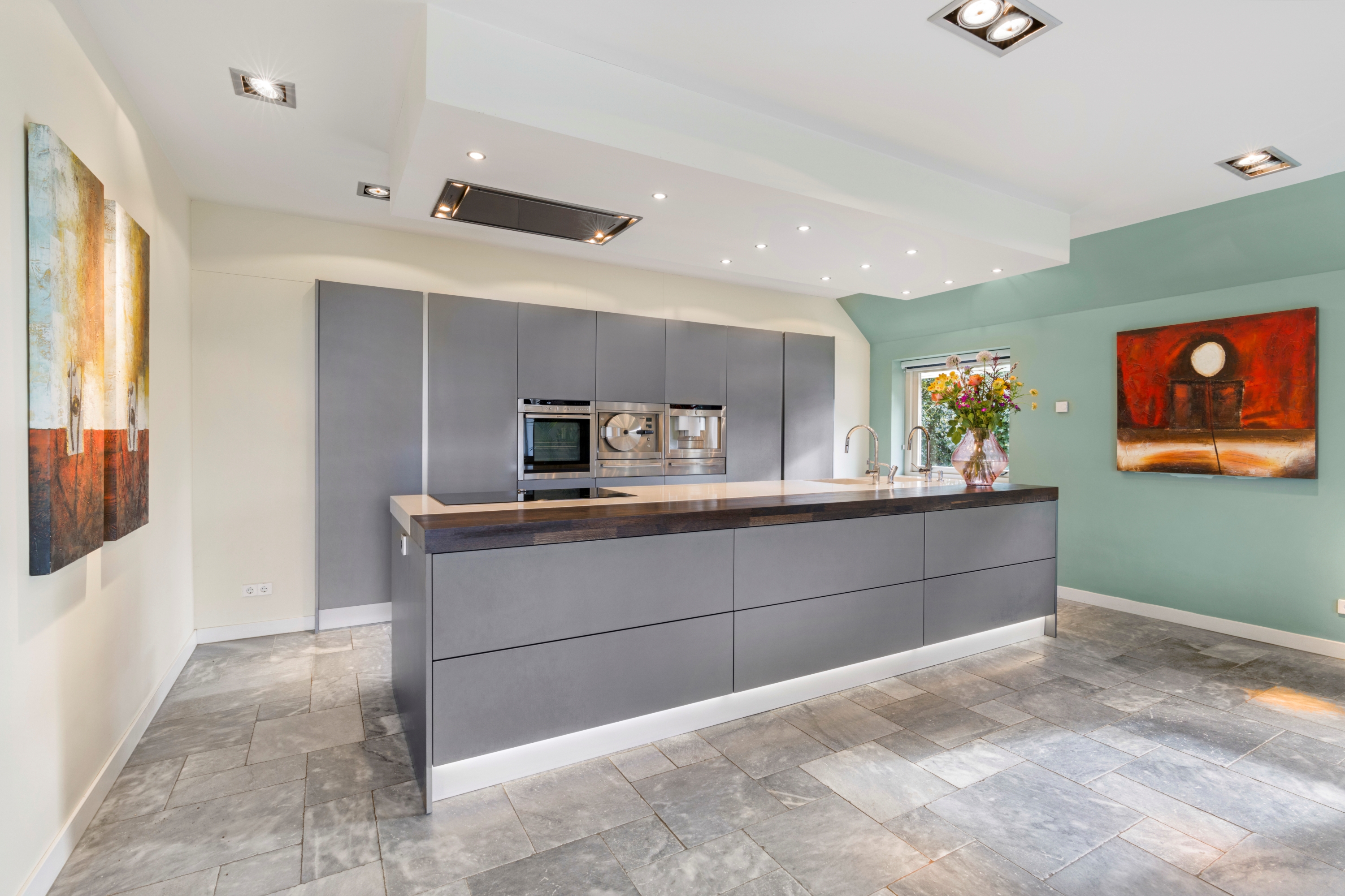 Het ruime kookeiland vormt een centrale plek waar koken, samenkomen en genieten naadloos samenkomen. Dankzij de slimme indeling en de luxe apparatuur is de keuken niet alleen een praktische werkruimte, maar ook een plek waar u met plezier uitgebreid kookt. Tegelijkertijd biedt de woonkeuken volop ruimte voor lange diners en gezellige momenten met familie en vrienden, waardoor het een echte leefruimte in huis is.