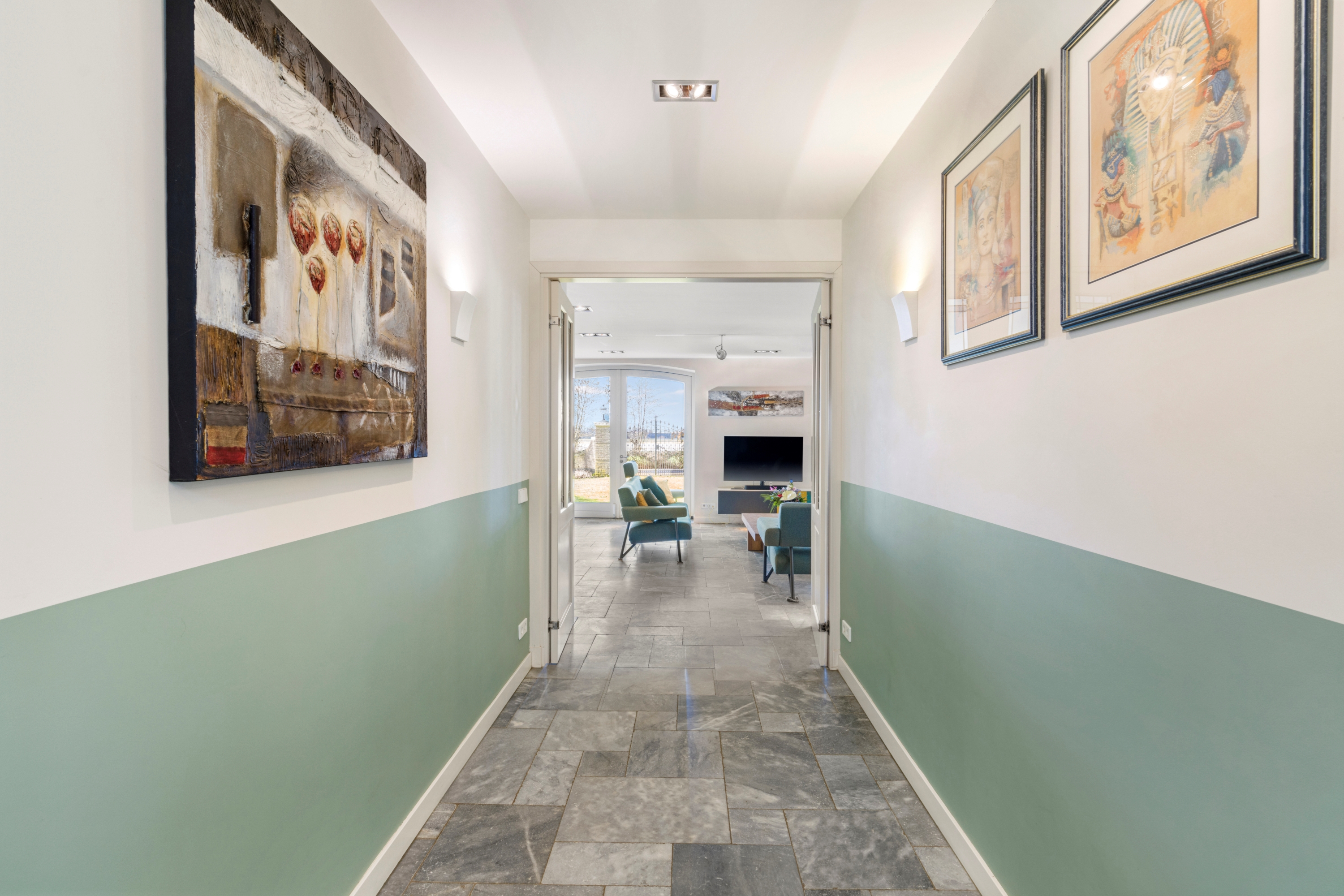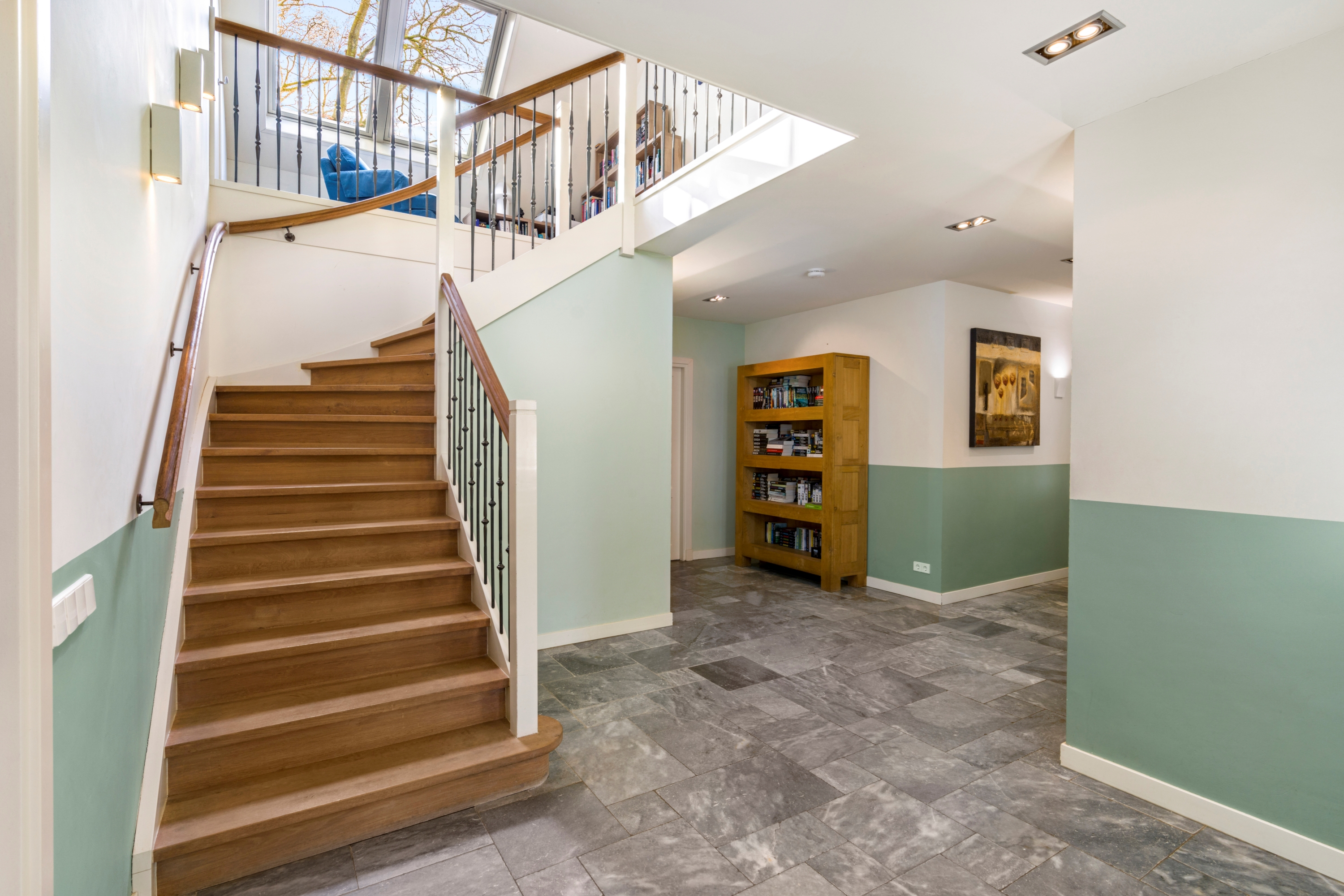 De royale entreehal met open trapopgang en veel lichtinval vormt een stijlvolle binnenkomst. De woning straalt direct warmte, ruimte en kwaliteit uit.