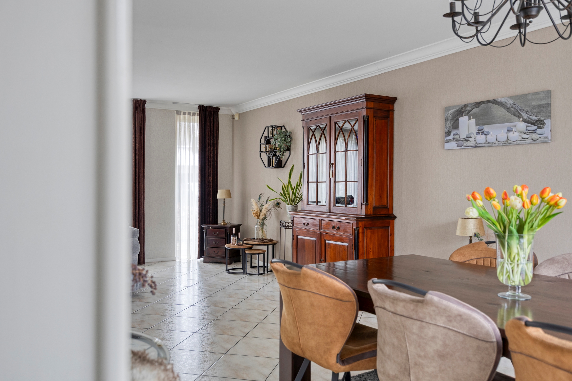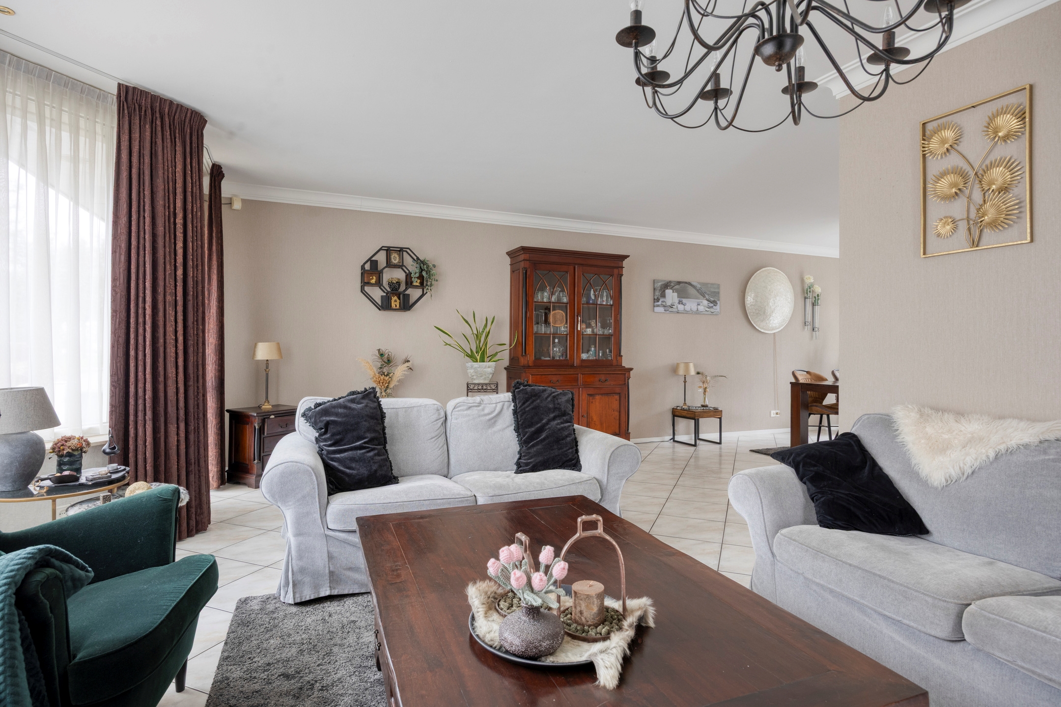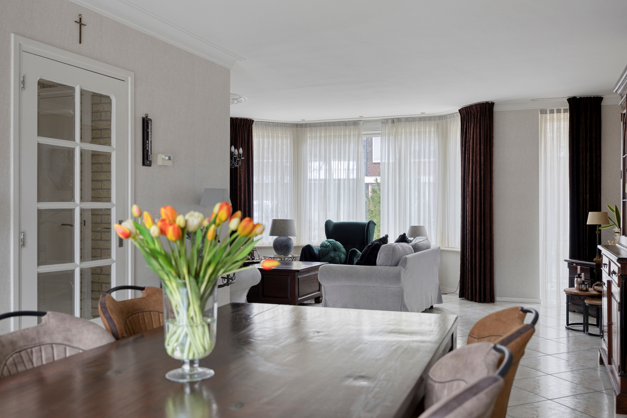 De woonkamer aan de voorzijde is licht en ruim opgezet, met grote raampartijen die zorgen voor een prettige daglichttoetreding. De zithoek en eetkamer staan in open verbinding met elkaar en bieden volop ruimte voor een royaal gezinsleven en lange diners.