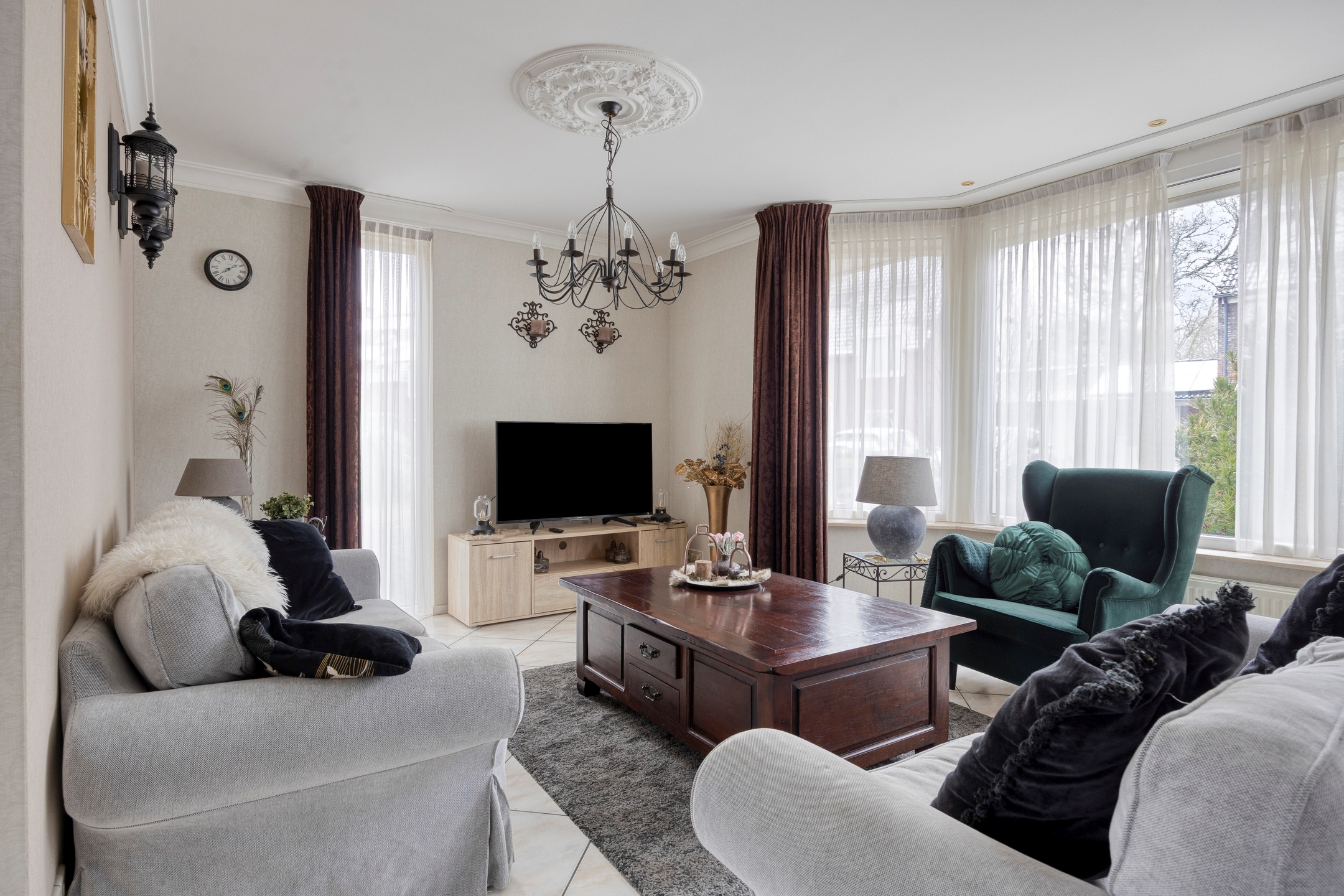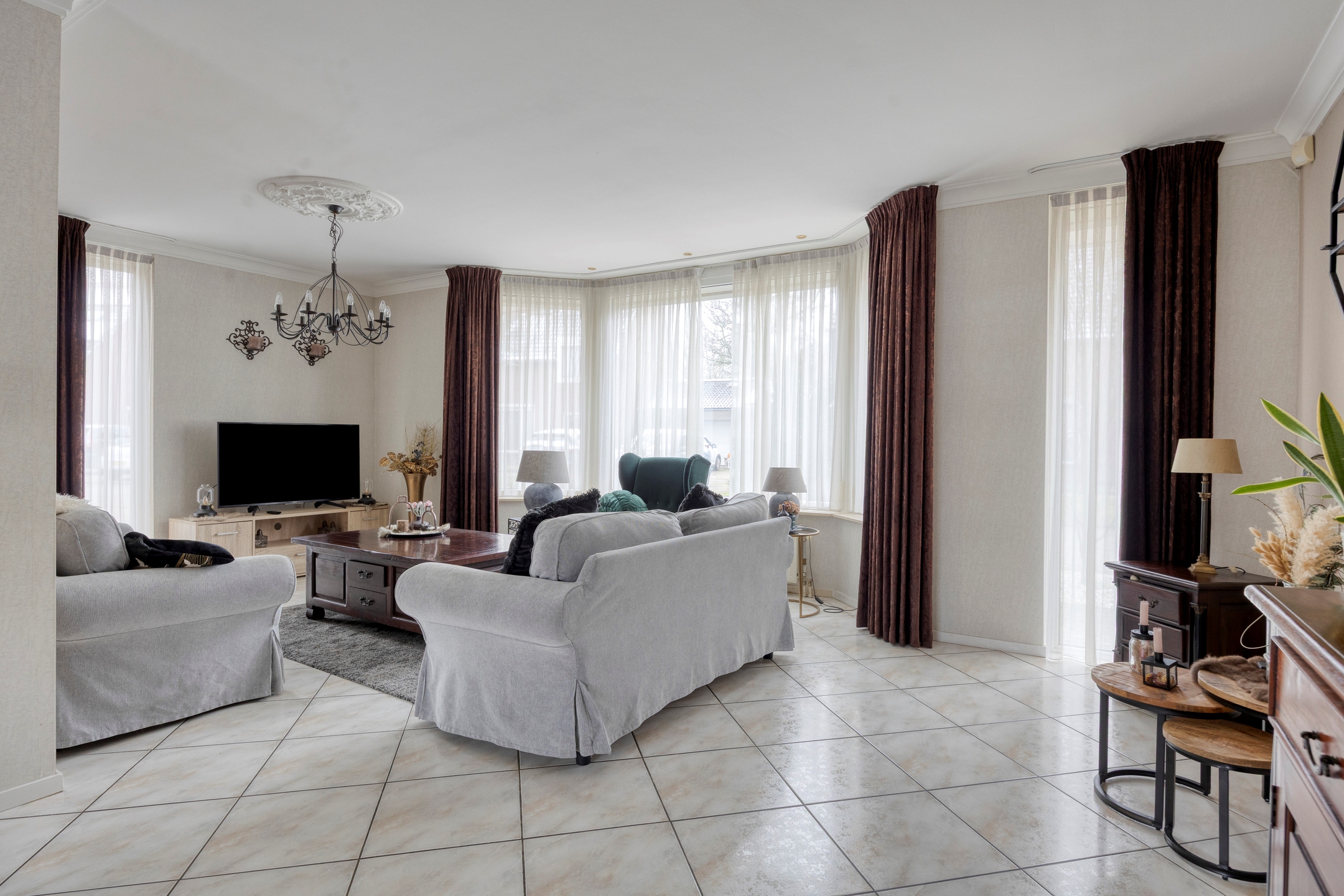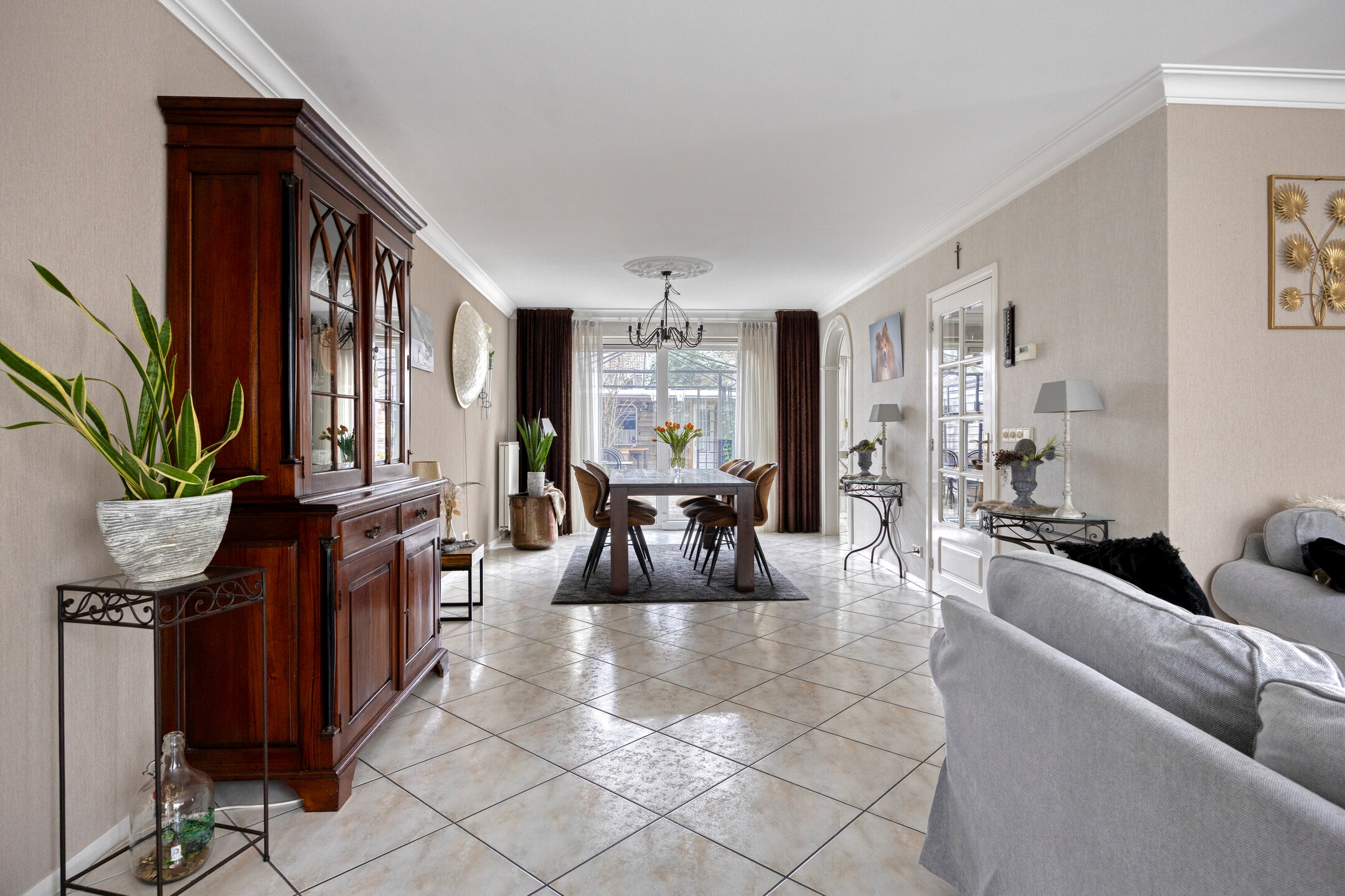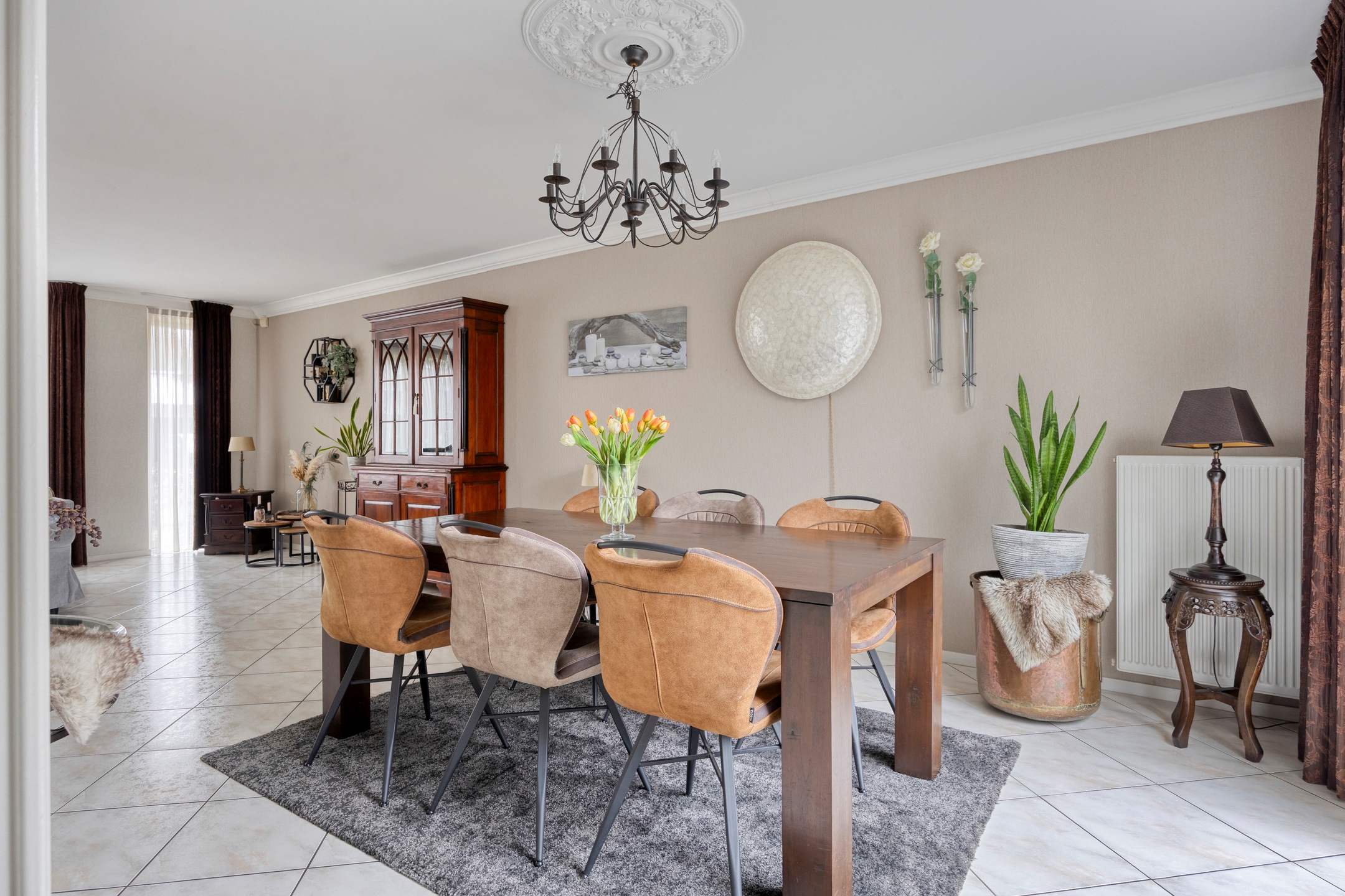 De woonkamer aan de voorzijde is licht en ruim opgezet, met grote raampartijen die zorgen voor een prettige daglichttoetreding. De zithoek en eetkamer staan in open verbinding met elkaar en bieden volop ruimte voor een royaal gezinsleven en lange diners.