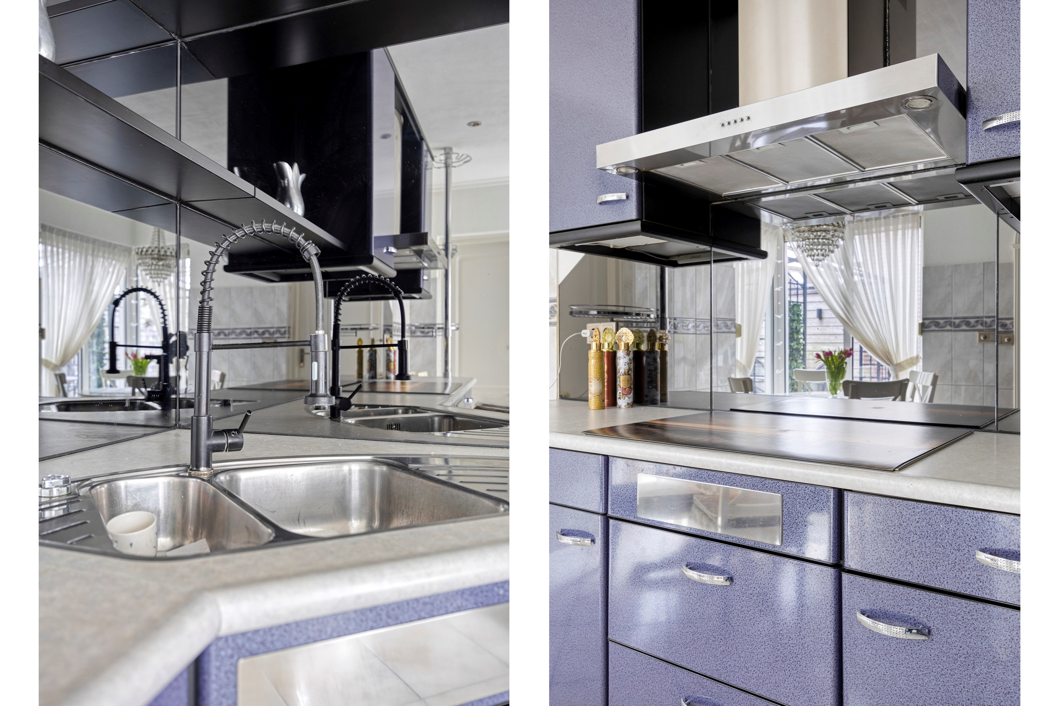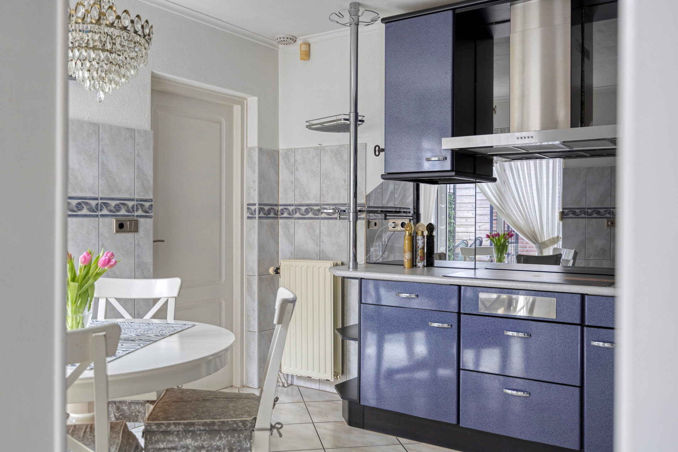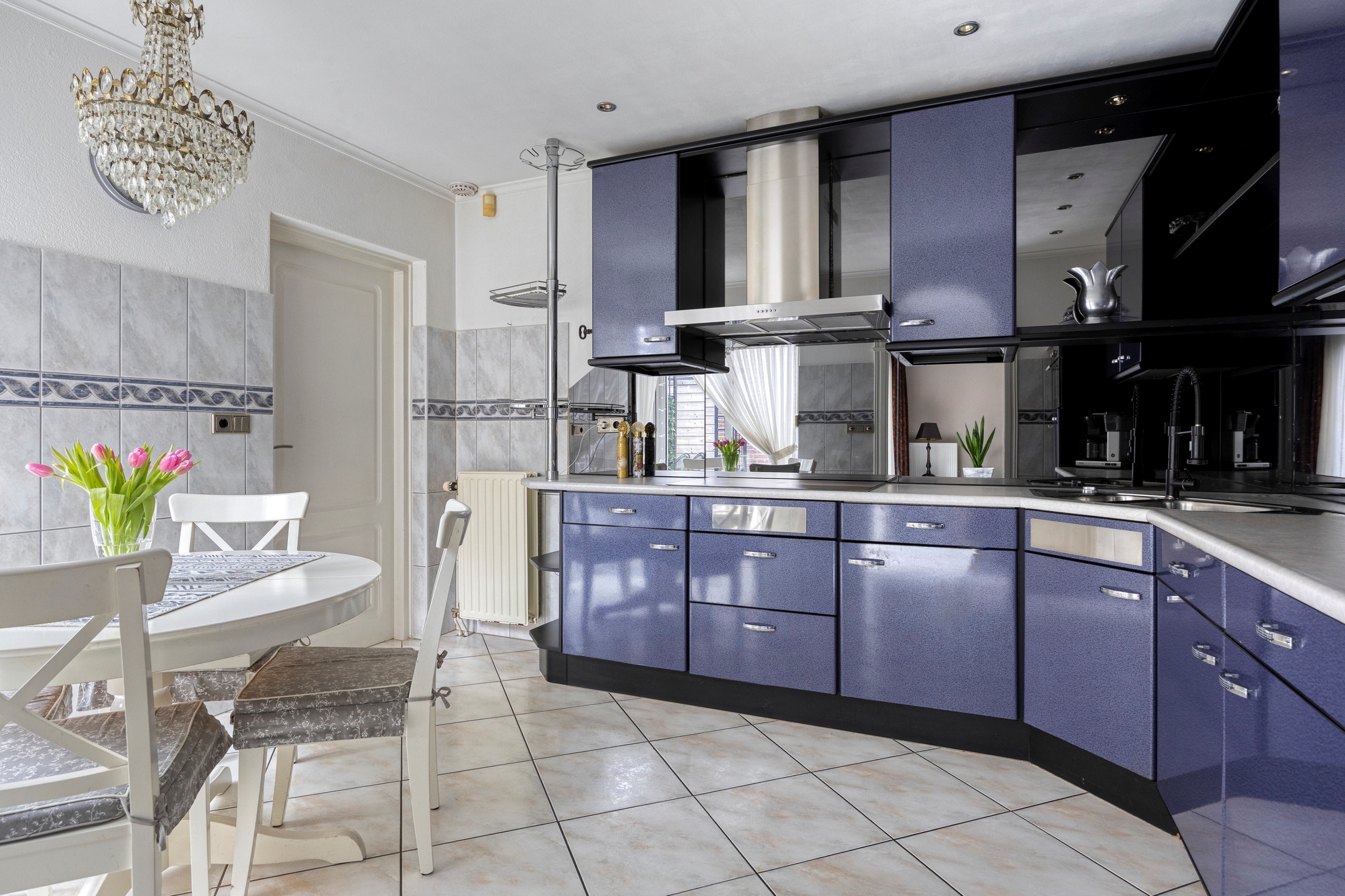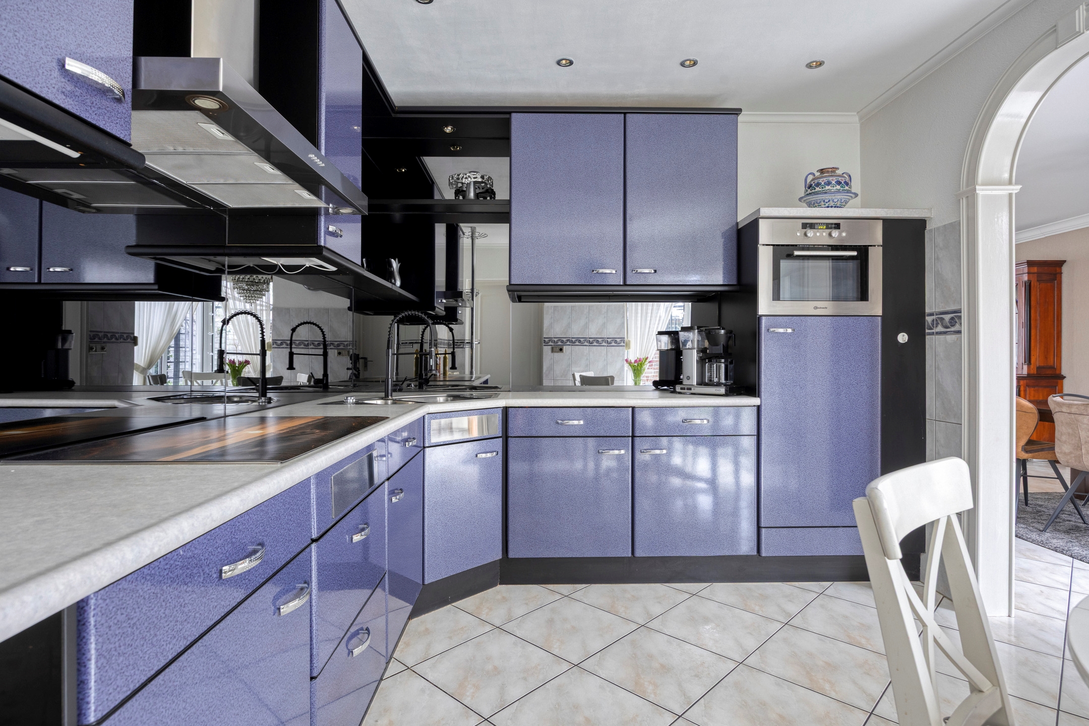 De half open keuken vormt een natuurlijke schakel tussen wonen en koken. Uitgevoerd in metallic blue en voorzien van alle benodigde inbouwapparatuur, combineert deze keuken karakter met functionaliteit. De opstelling biedt veel werk- en bergruimte en houdt tegelijkertijd contact met de leefruimte ideaal voor wie graag samenkomt rondom het hart van de woning.