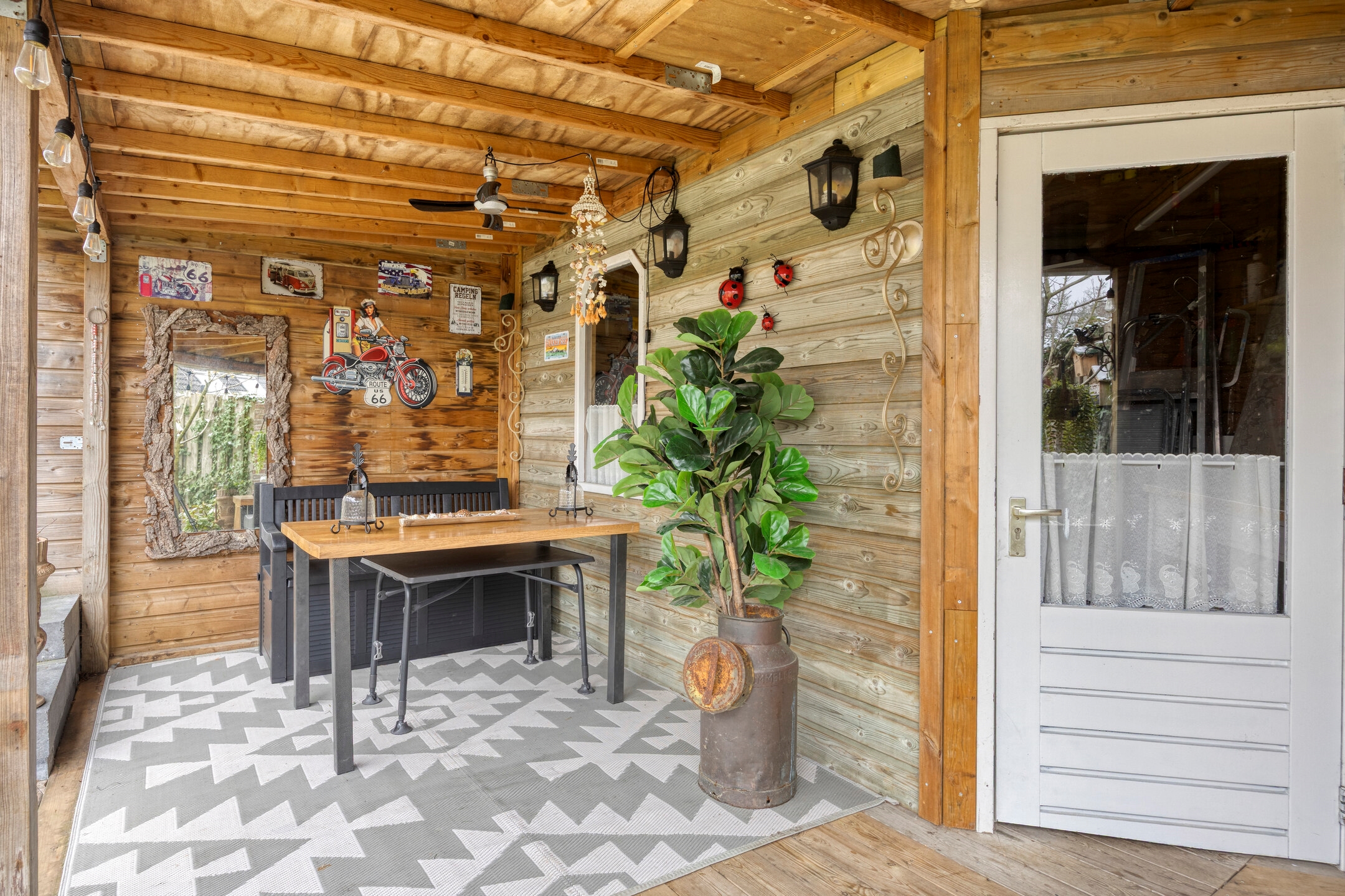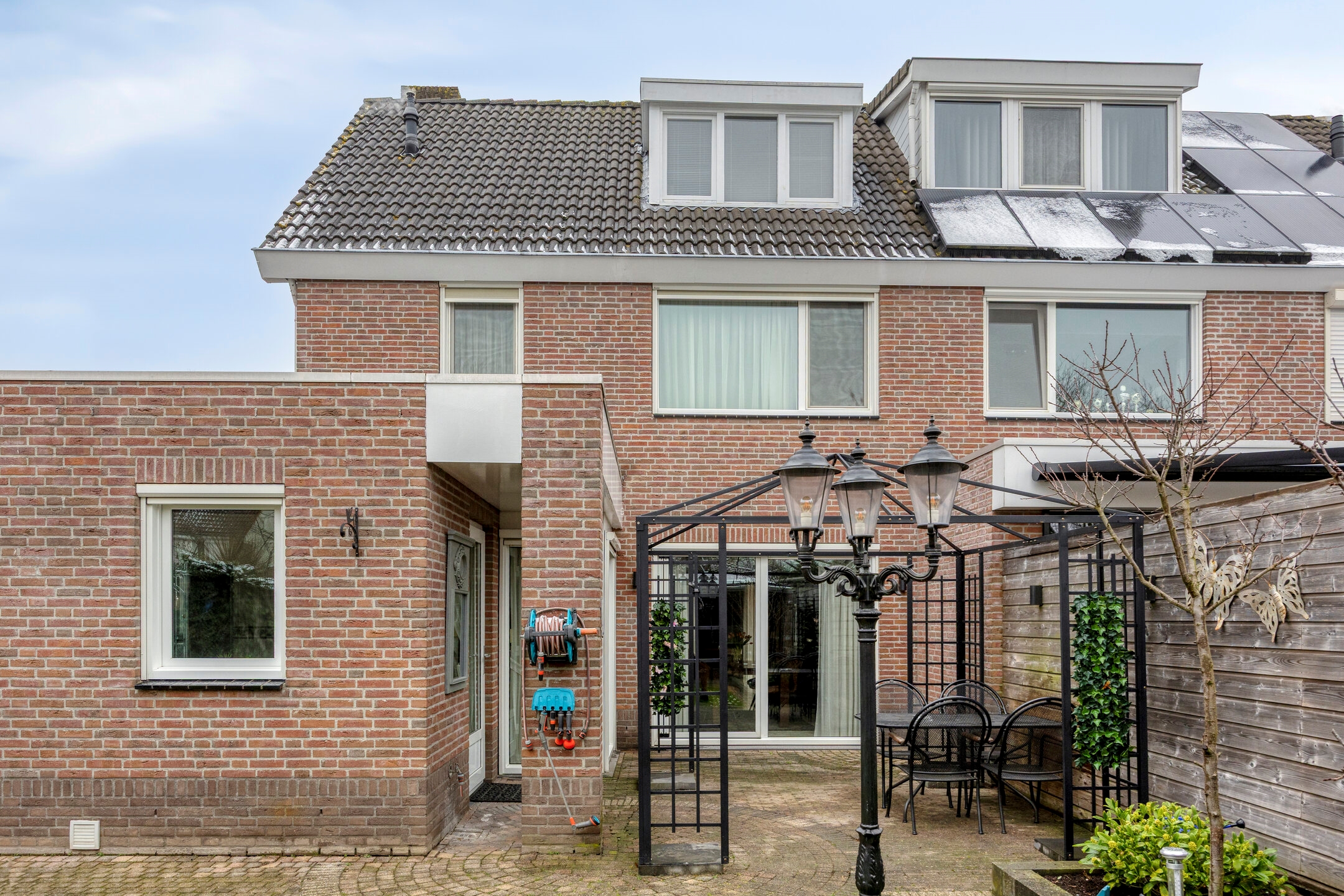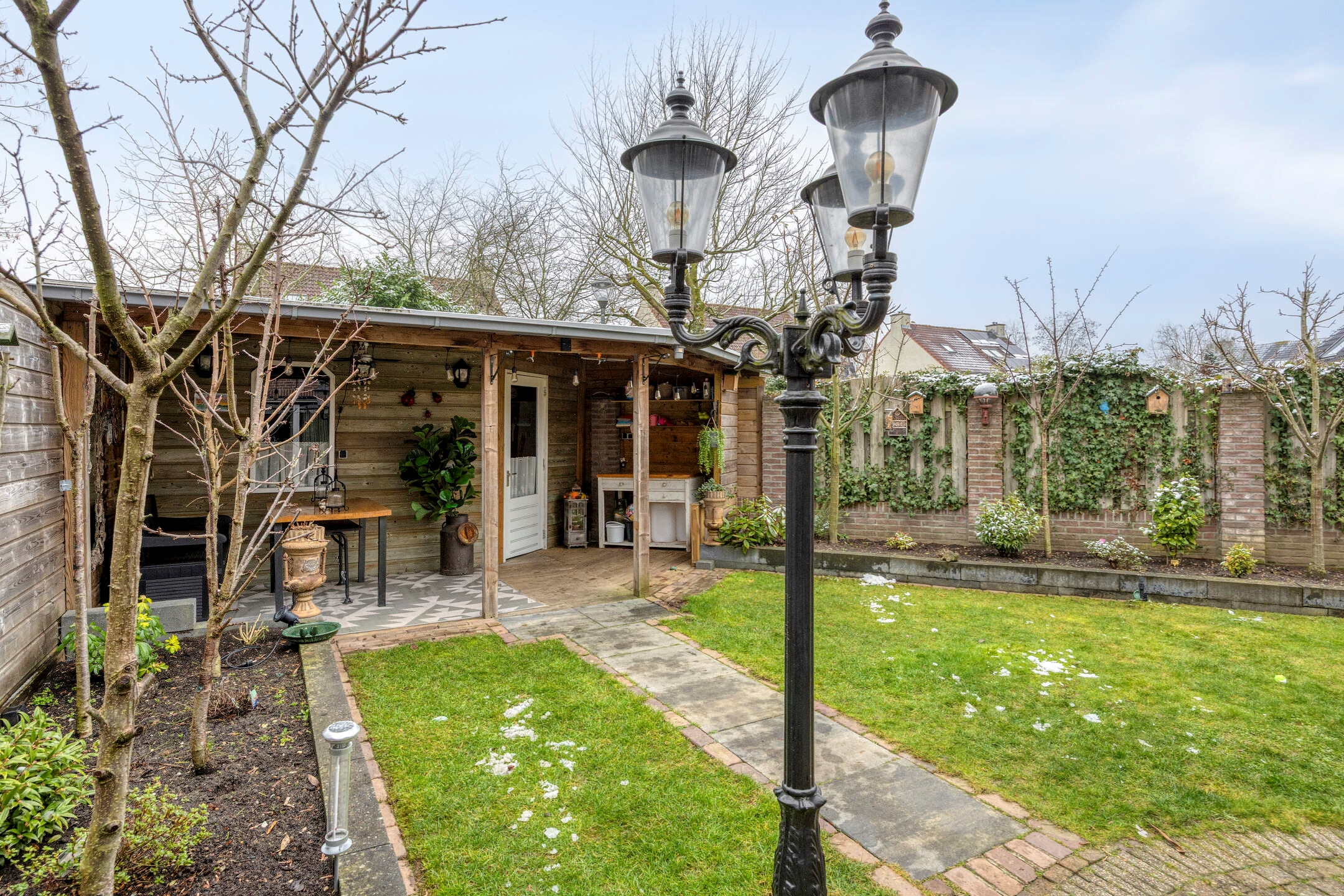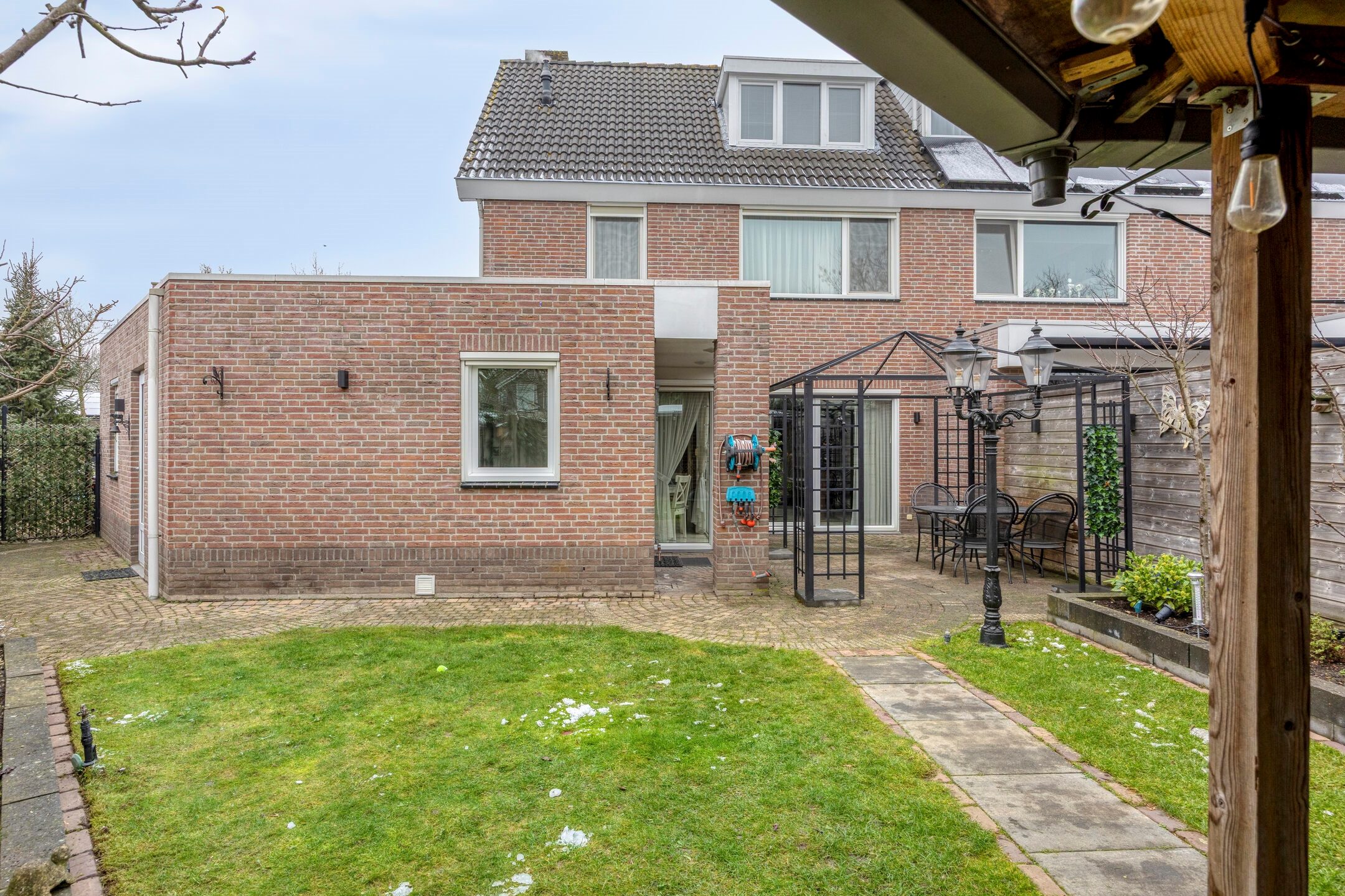 De tuin zelf is royaal en praktisch ingedeeld met gazon, borders en meerdere zitplekken. Achterin bevindt zich een sfeervolle overkapping/tuinkamer — perfect voor lange zomeravonden of als verlengstuk van het wooncomfort.