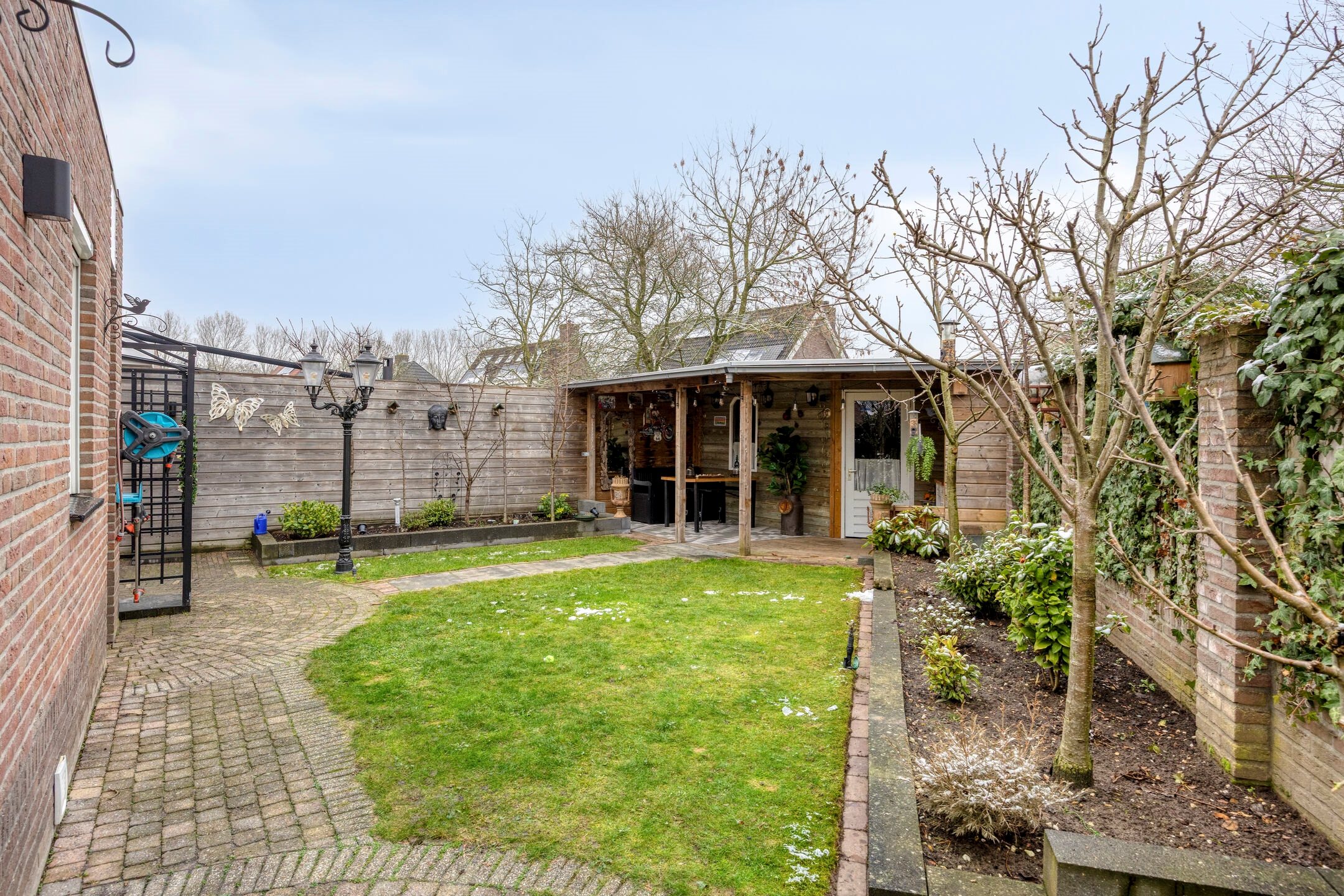 De achtertuin is verzorgd aangelegd en beschikt over een sfeervolle overkapping en vrijstaande houten berging. Een fijne plek om in alle privacy te genieten van het buitenleven.