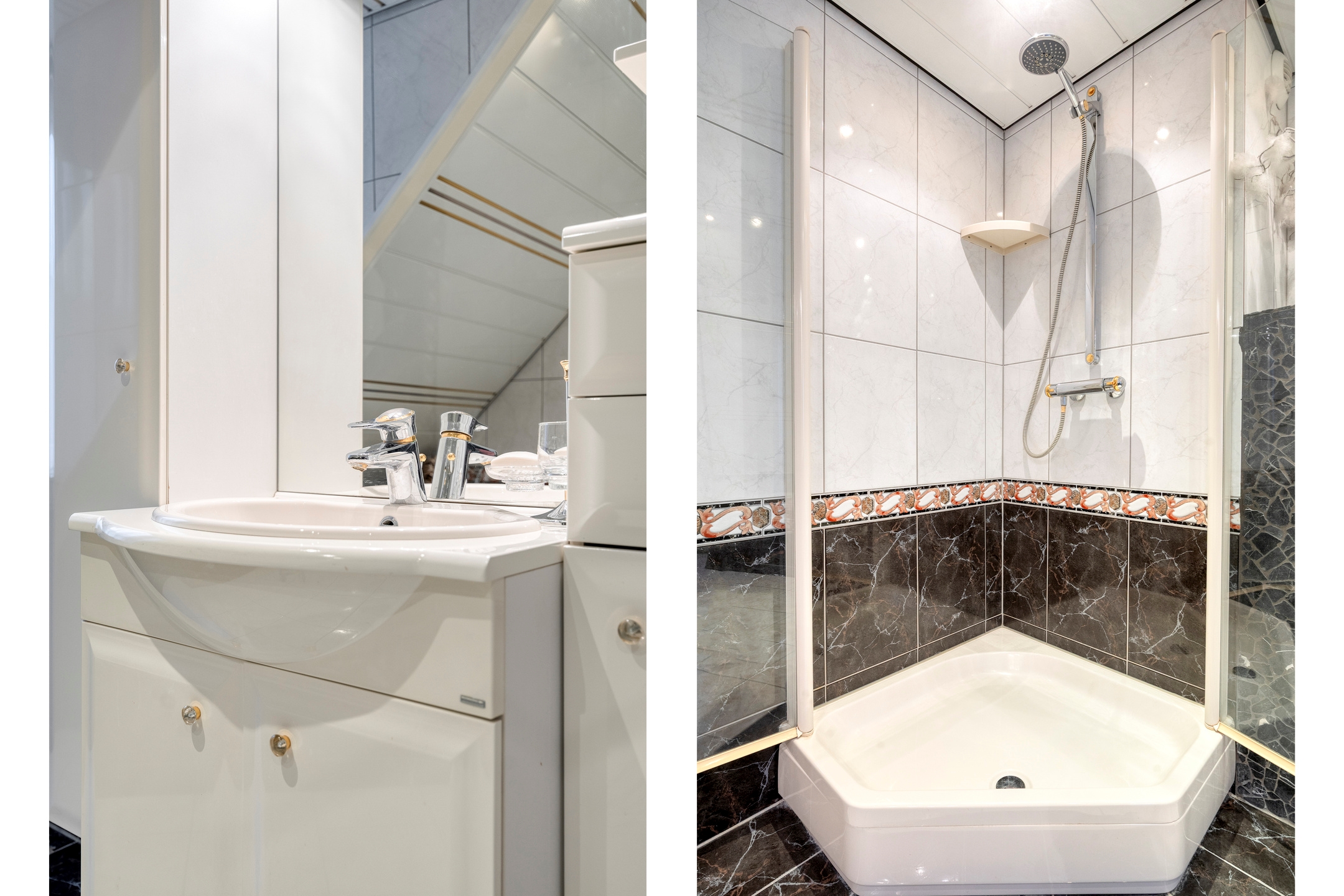 De badkamer is uitgevoerd met vloerverwarming en in een luxe marmerlook afwerking. Hier beschikt u over een ruim ligbad met marmeren ombouw, een separate douchecabine, een toilet en een wastafelmeubel met bergruimte. De combinatie van donkere marmeraccenten en lichte tegels geeft de ruimte een klassieke, stijlvolle uitstraling met een hotelgevoel.