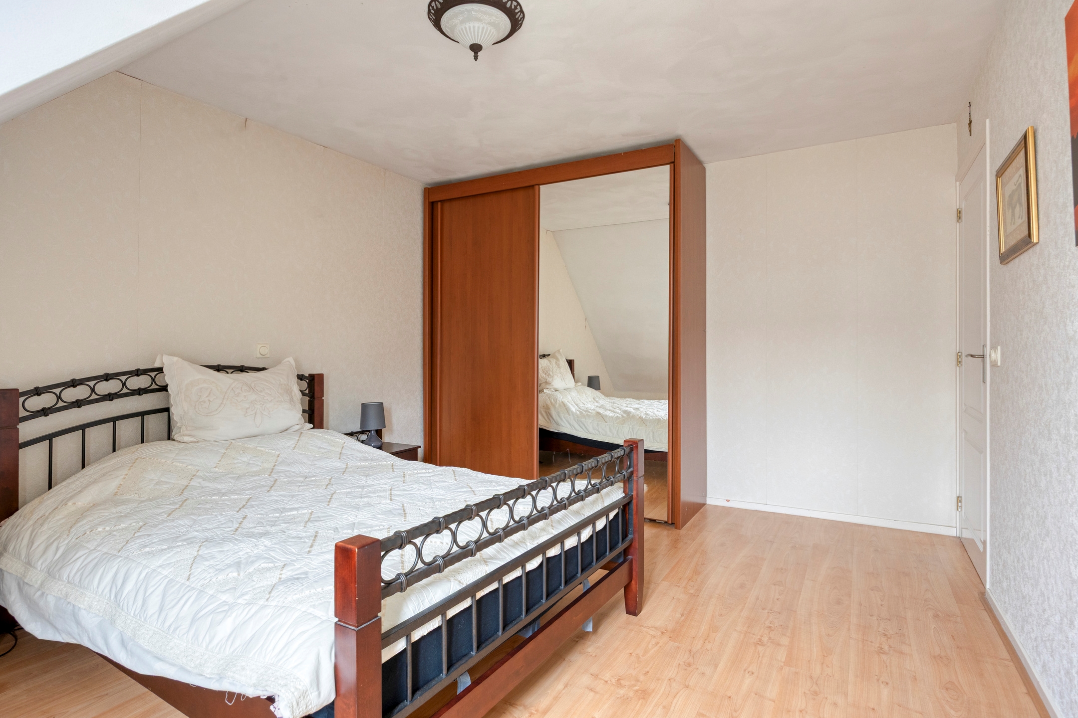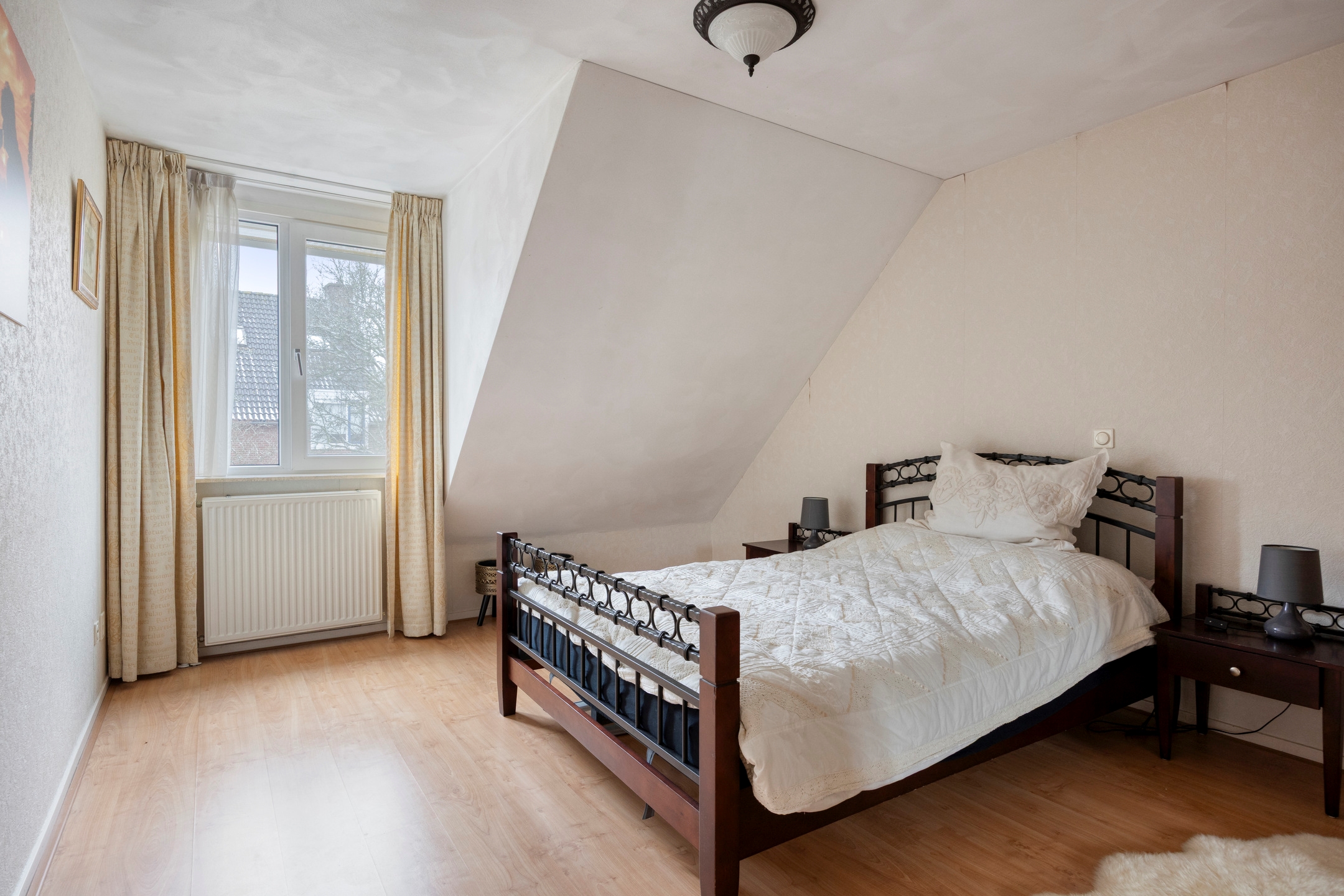 De hoofdslaapkamer is royaal bemeten en voorzien van een brede raampartij met uitzicht, waardoor daglicht rijkelijk binnenvalt. Een rustige, comfortabele ruimte waar privacy en sfeer samenkomen.